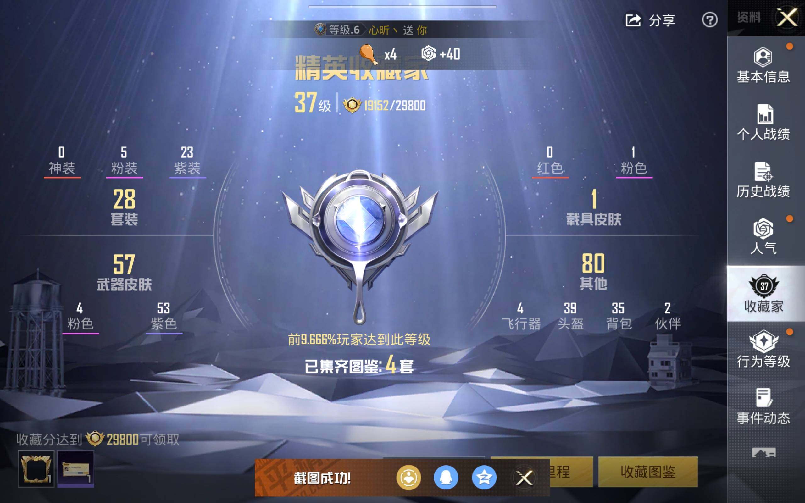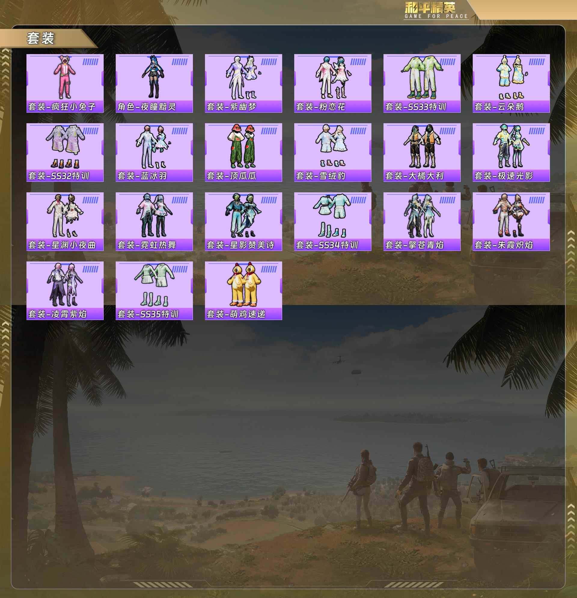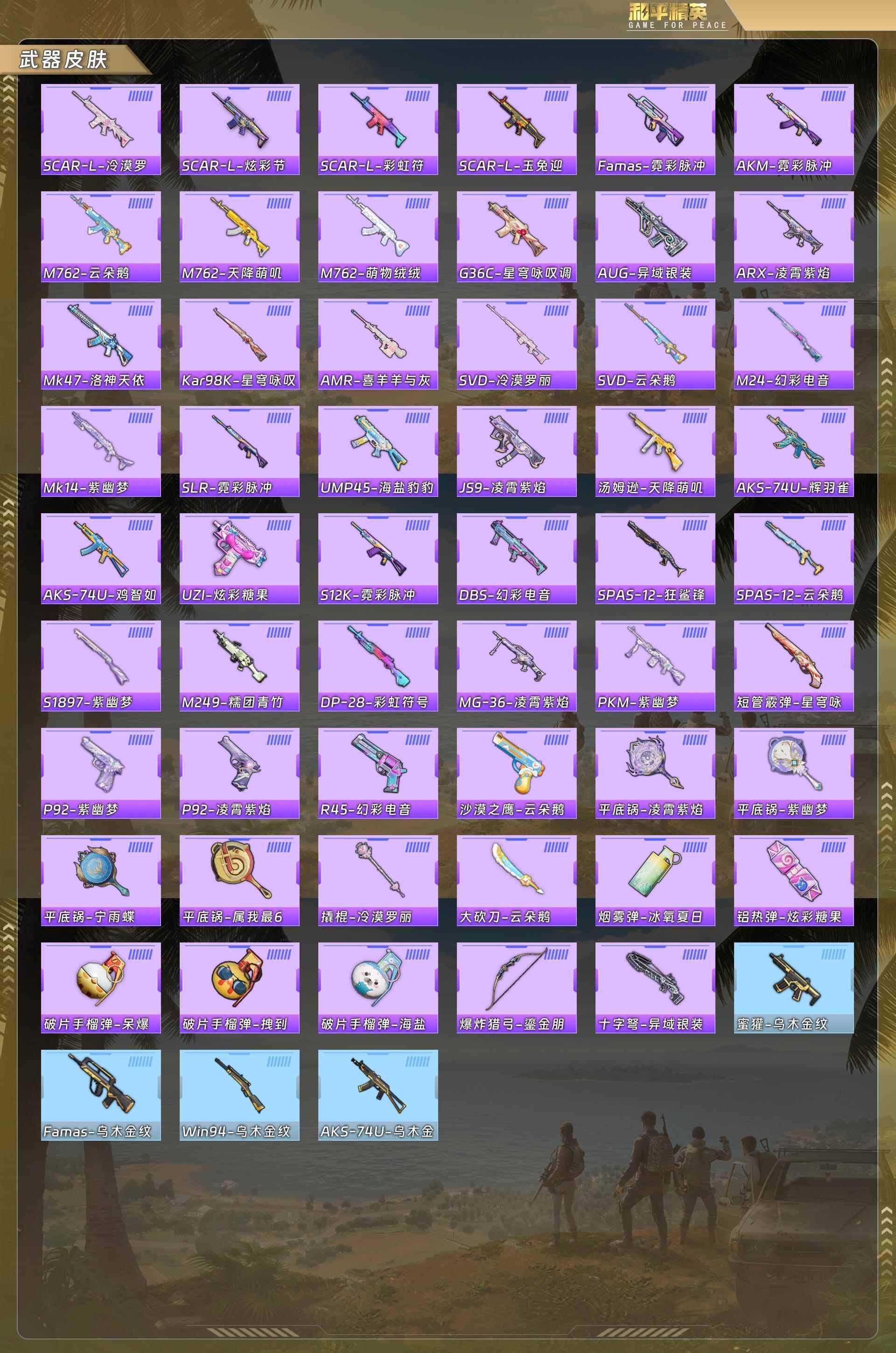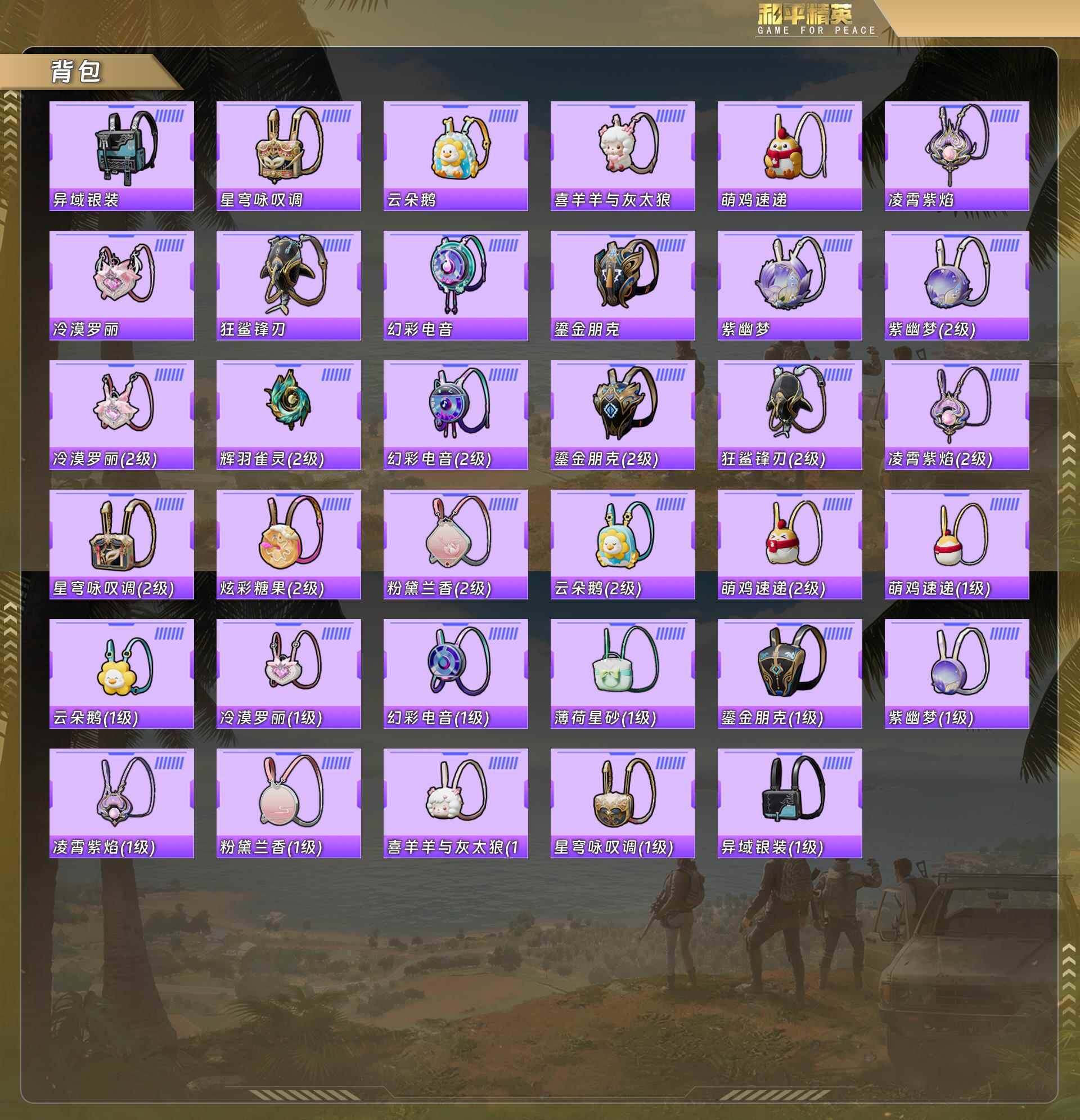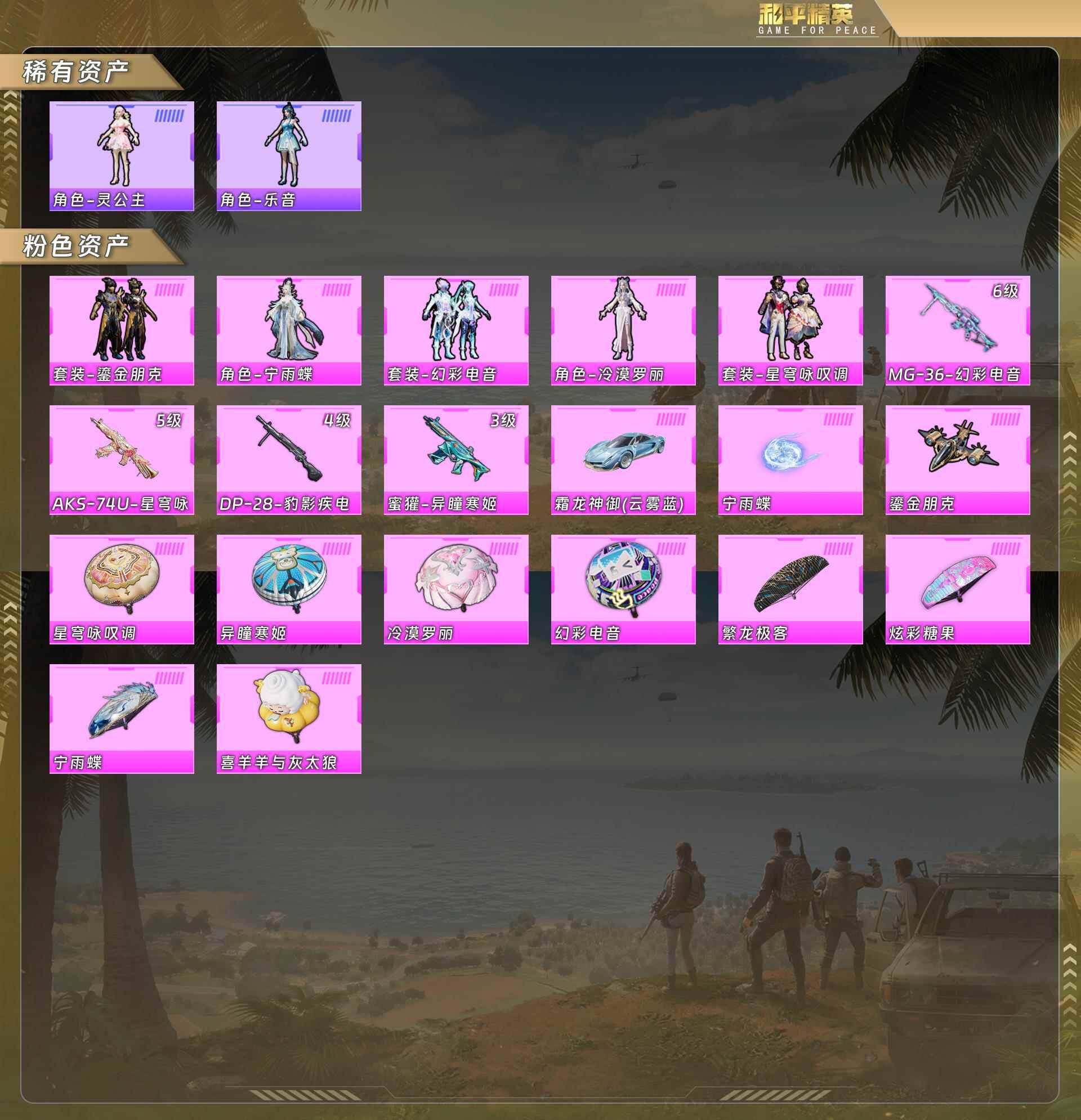 灵公主/乐音/鎏金朋克/宁雨蝶/幻彩电音/冷漠罗丽/星穹咏叹调/mg-36-幻彩电音[6级]/aks-74u-星穹咏叹调[5级]/dp-28-豹影疾电[4级]/蜜獾-异瞳寒姬[3级]/霜龙神御云雾蓝没战神框 hp4304 【粉色载具】:霜龙神御(云雾蓝) 【粉色套装】:粉装-鎏金朋克,粉装-星穹咏叹调,粉装-幻彩电音,角色-冷漠罗丽,角色-宁雨蝶 【粉色呛皮等级】:蜜獾-异瞳寒姬三级,aks-74u-星穹咏叹调五级,dp-28-豹影疾电四级,mg-36-幻彩电音六级 【粉色呛皮】:蜜獾-异瞳寒姬,aks-74u-星穹咏叹调,dp-28-豹影疾电,mg-36-幻彩电音 【粉色飞行器】:鎏金朋克飞行器,宁雨蝶飞行器 【粉色降落伞】:繁龙极客降落伞,星穹咏叹调降落伞,幻彩电音降落伞,冷漠罗丽降落伞,宁雨蝶降落伞,喜羊羊与灰太狼降落伞,异瞳寒姬降落伞 【稀有套装】:套装-粉恋花,套装-紫幽梦,套装-蓝冰羽,套装-星影赞美诗,套装-星渊小夜曲,套装-霓虹热舞,套装-极速光影,套装-云朵鹅,套装-雪绒豹,角色-灵公主,角色-乐音,角色-夜瞳黯灵,套装-朱霞炽焰,套装-凌霄紫焰,套装-擎苍青焰 【稀有呛皮】:scar-l-炫彩节奏,scar-l-玉兔迎春,scar-l-冷漠罗丽,m762-天降萌叽,m762-萌物绒绒,m762-云朵鹅,mk47-洛神天依,g36c-星穹咏叹调,arx-凌霄紫焰,汤姆逊-天降萌叽,aks-74u-辉羽雀灵,js9-凌霄紫焰,kar98k-星穹咏叹调,m24-幻彩电音,amr-喜羊羊与灰太狼,svd-云朵鹅,svd-冷漠罗丽,dbs-幻彩电音,spas-12-云朵鹅,m249-糯团青竹,dp-28-彩虹符号,mg-36-凌霄紫焰,p92-凌霄紫焰,r45-幻彩电音,短管霰弹-星穹咏叹调,沙墨之鹦-云朵鹅,爆炸猎弓-鎏金朋克,大砍刀-云朵鹅,撬棍-冷漠罗丽,平底锅-宁雨蝶,平底锅-凌霄紫焰 【其他套装】:套装-疯狂小兔子 【营地id】:1028163676