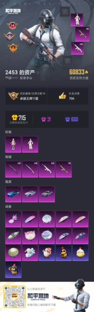 _2312425-实名:可修改时装数:609载具数:3呛械数:190战备数:158热门装扮:鹰眼刺客烟云彩露羊梦糖心载具:仰望u7先锋版阿盖尔紫灵翼风驰(幻彩蓝)幽澜尊爵(静谧蓝)稀有呛皮:m416心之恋语scar-l-锦绣绵绵kar98k-巳巳如意dp-28-豹影疾电亮点:【精品号手慢无】2025年12月22日后可换绑。热力值60833,王牌次数14,七级m416-心之恋语,装扮鹰眼刺客烟云彩露羊梦糖心,3载具仰望u7先锋版阿盖尔紫灵翼风驰(幻彩蓝)幽澜尊爵(静谧蓝)