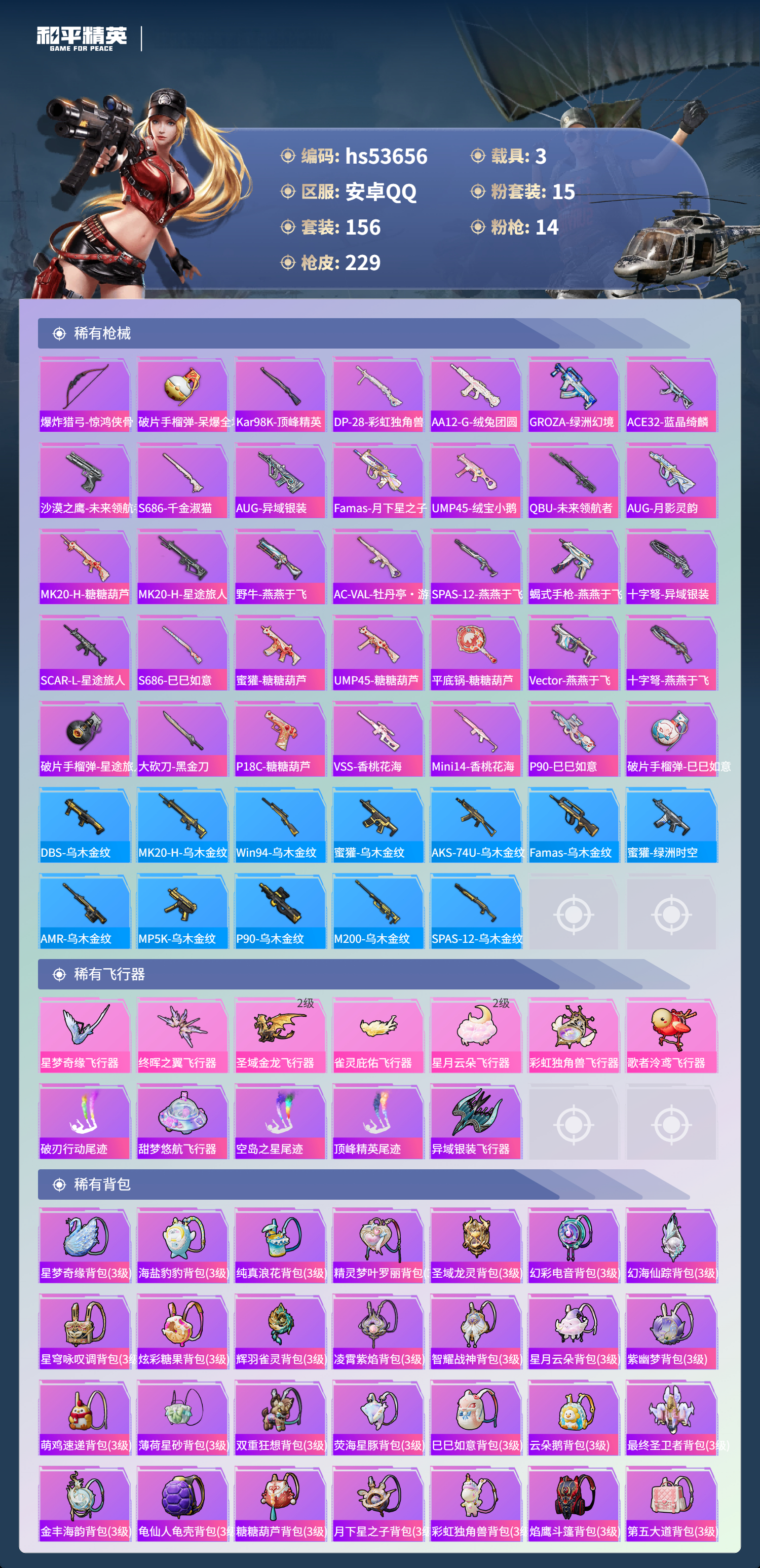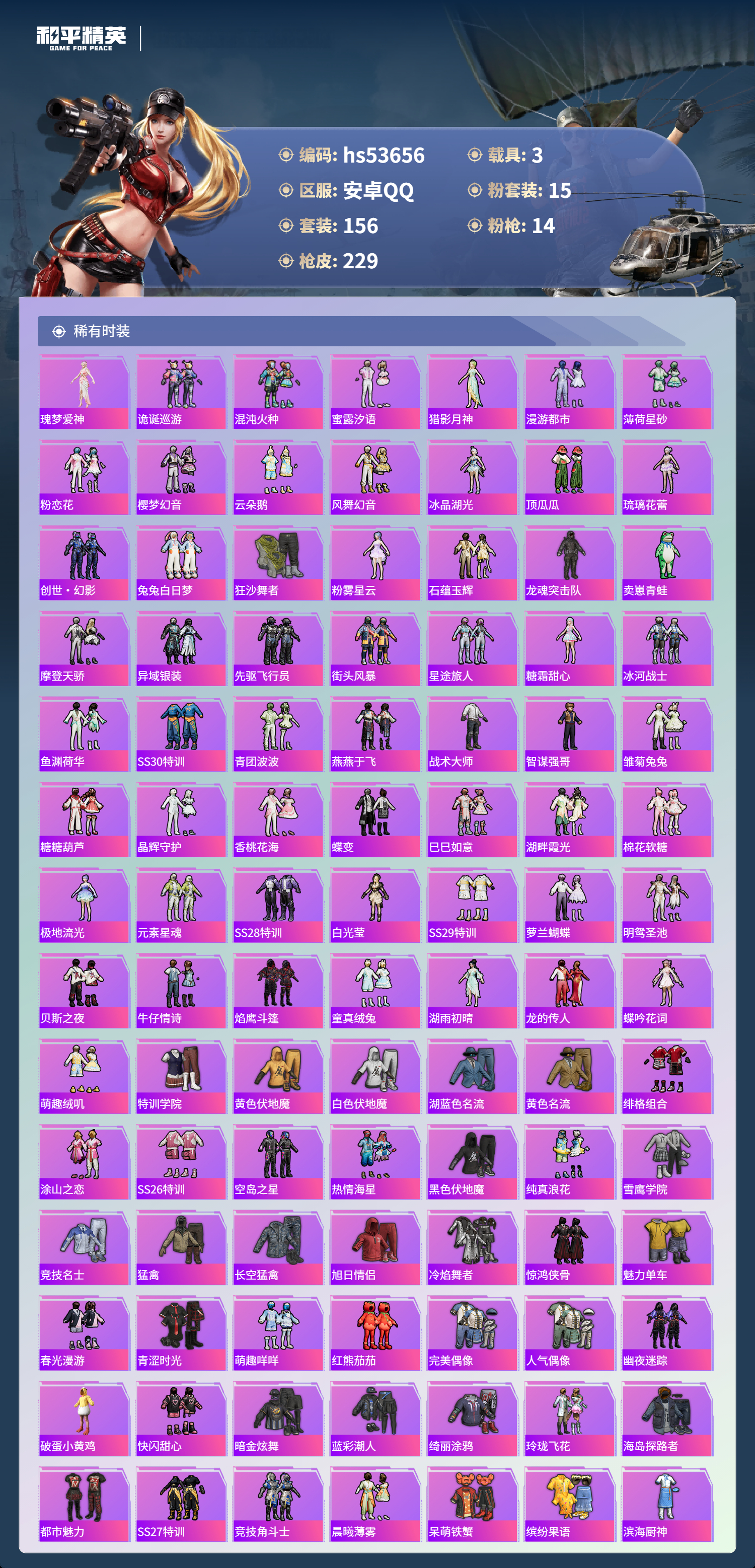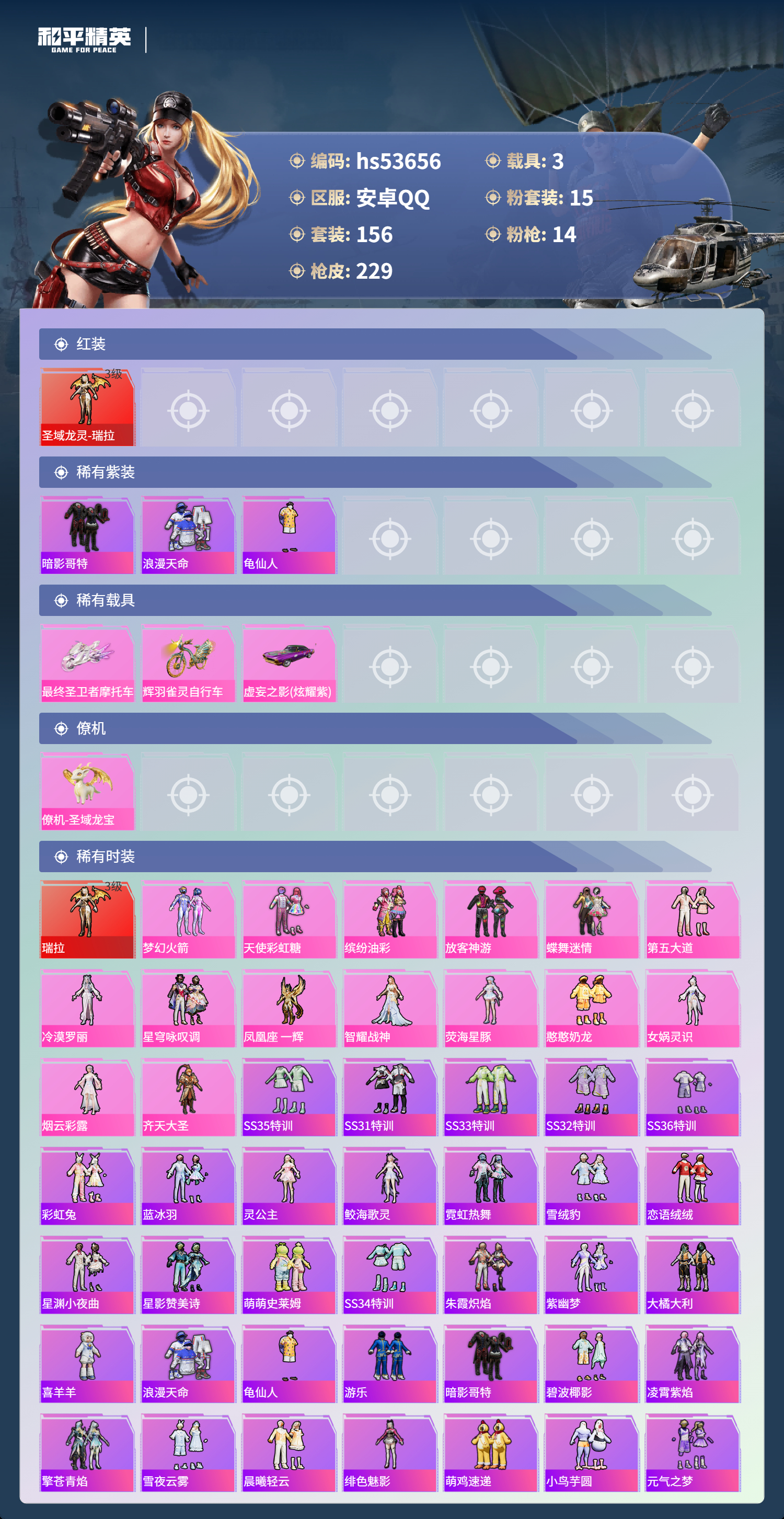 hs53656 安卓手q-8王牌印记-1红装-15粉装-14特效呛-3载具-80904热力值-156套装-229呛皮-4卓越印记-2传奇印记【1红装】圣域龙灵-瑞拉/3级【15粉装】套装-第五大道角色-烟云彩露角色-女娲灵识套装-天使彩虹糖套装-蝶舞迷情套装-梦幻火箭角色-智耀战神套装-缤纷油彩套装-星穹咏叹调套装-放客神游角色-荧海星豚角色-凤凰座 一辉套装-齐天大圣