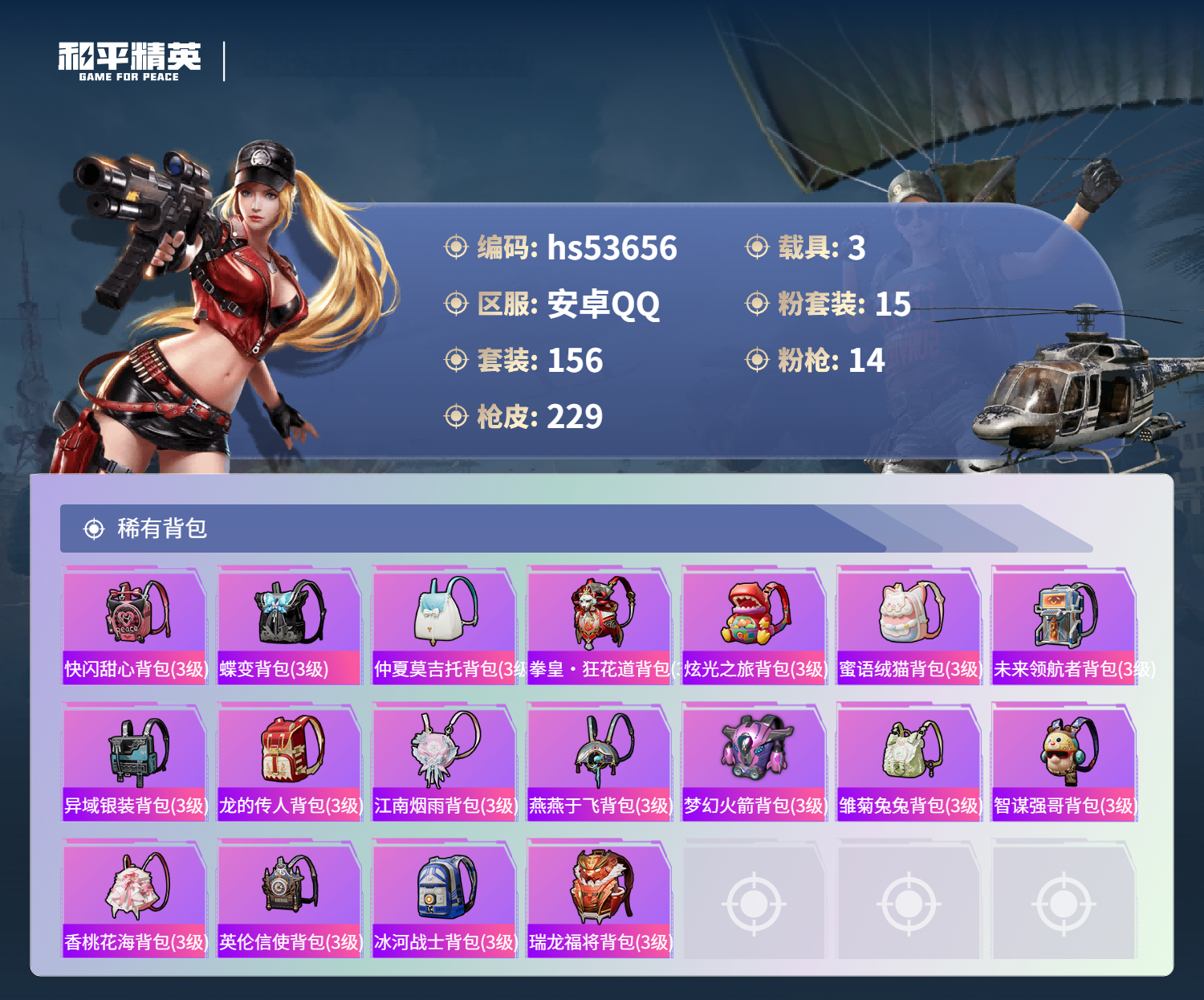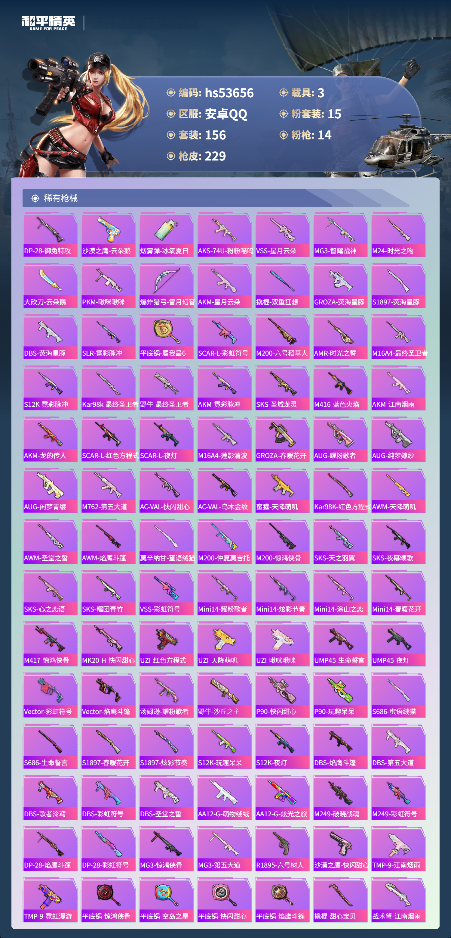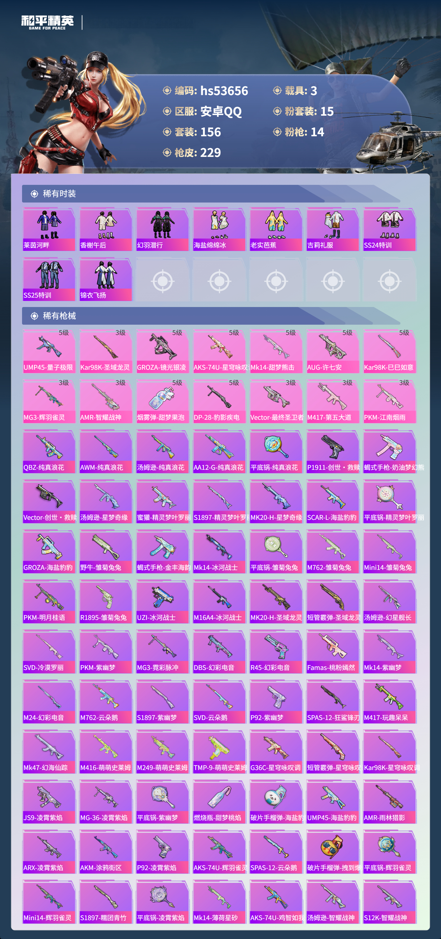 hs53656 安卓手q-8王牌印记-1红装-15粉装-14特效呛-3载具-80904热力值-156套装-229呛皮-4卓越印记-2传奇印记【1红装】圣域龙灵-瑞拉/3级【15粉装】套装-第五大道角色-烟云彩露角色-女娲灵识套装-天使彩虹糖套装-蝶舞迷情套装-梦幻火箭角色-智耀战神套装-缤纷油彩套装-星穹咏叹调套装-放客神游角色-荧海星豚角色-凤凰座 一辉套装-齐天大圣