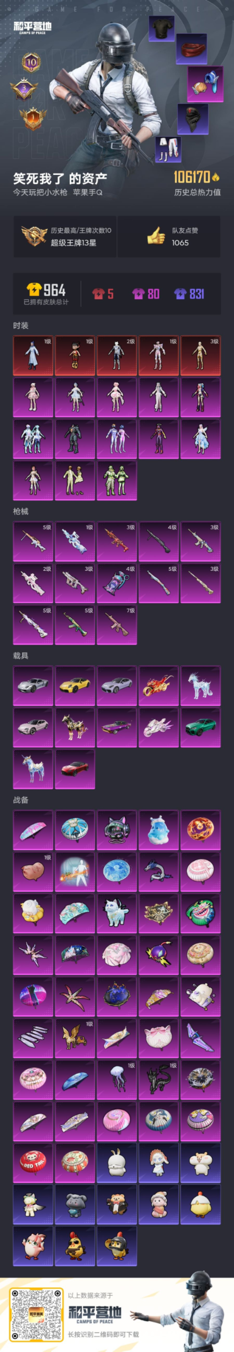 _2313695-12载具-176套装-253呛皮-5红装-5红装1稀有13载具13粉装13特效呛10印记【5红装】魔童闹海-哪吒1级魔童闹海-敖丙1级灵猫魔法师-塞维尔2级最终圣卫者-帕修斯1级沙丘之主-图卡盟3级【1稀有】浪漫天命【13载具】保时捷918sper液态银保时捷panamera星辰紫保时捷taycan旅行版冰莓粉保时捷911敞篷版极速黄虚妄之影炫耀紫宝马x6m曼岛绿阿斯顿马丁s红色冰绡玉鳞黑曜夜骑星梦玉骢最终圣卫者摩托车踏焰逐风摩托车僚机-冰龙团团【13粉装】冰魄觉醒初号机狂魅哈莉圣堂之誓梦幻火箭奇迹舞步美雪冷漠罗丽星梦奇缘羊梦糖心绿野邂逅幻彩电音复仇流浪者碧影闪光【13特效呛】m416-心之恋语7级p90-魔童闹海敖丙1级scar-l-魔童闹海哪吒3级m416-灵猫魔法师3级p90-冷漠罗丽2级akm-绿萝繁花5级kar98k-巳巳如意5级vect-最终圣卫者3级mg-36-沧焰双生5级dp-28-豹影疾电4级m24-镜域双华3级dp-28-圣堂之誓5级盐雾蛋-电雾迷城4级【14热门】8号机mark.06雪山精英暗影哥特团圆交子瑞龙福将纯白誓言冰爽海盐梦之呓语破蛋小黄鸡极速红龙军刀雅典娜kar98k-终极赛罗m762-瑞龙福将【3飞行器】龙翔九天飞行器梦幻火箭飞行器幻海精灵飞行器【1头盔】夏日绵绵冰头盔【1背包】梦幻火箭背包营地id: