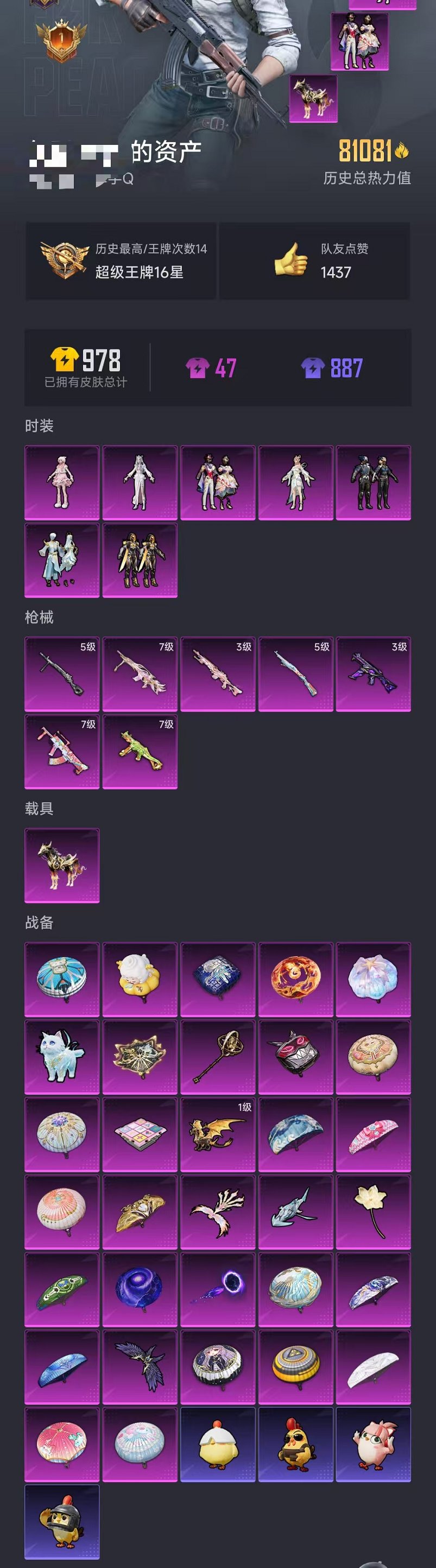 【蓝粉螳螂7粉装7特效呛1载具可秒换绑】 安卓q区-81081热力值-14印记-158套装-260呛皮 【1载具】 黑曜夜骑【2稀有】 8号机 mark.06【7粉装】 创世·救赎 金丰海韵 星穹咏叹调 角色-冷漠罗丽 英伦信使 角色-月影灵韵 角色-羊梦糖心【7特效呛】 ump45-恐龙拽拽7级 groza-旋转彩虹7级 mg-36-幻梦之森7级 ump45-宇宙