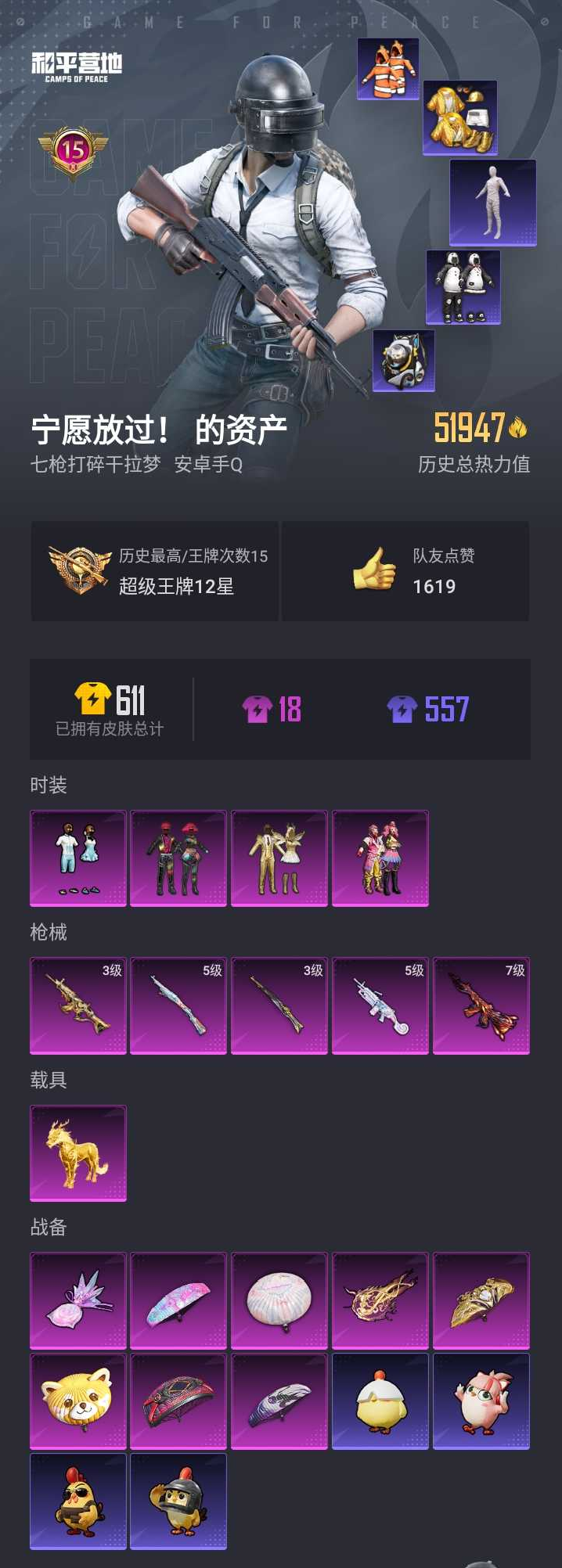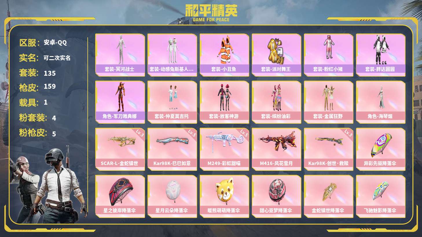 【和平精英】【lyhp18191】15高印记 4粉装5特效呛1载具 木乃伊 派对舞王 小丑鱼 胖达圆圆 猫包 放客神游 猪妹 金属狂野 满级雪月m4 金蛇死噶 金麒麟 4粉装,5特效呛,1载具,历史最高段位:超级王牌12星 王牌印记15次 热力值:51947,135套装,159呛械,204装备,90战备;套装:套装-金属狂野,套装-缤纷油彩,套装-放客神游,套装-仲夏莫吉托,套装-特训学院,套装-猎鹰,套装-青年教官,套装-黄色伏地魔,套装-白色伏地魔,套装-黑色伏地魔,套装-登山爱好者,套装-竞技名士,套装-酒红色名流,套装-黄色名流,套装-猛禽,套装-长空猛禽,套装-黎明保卫者,套装-旭日情侣,套装-冷焰舞者,套装-灼焰舞者,套装-刚毅裁决者,套装-战地菁英,套装-青春校园,套装-沙漠毒蛇,套装-幻影武者,套装-蓝彩潮人,套装-千禧之恋,套装-魅力单车,套装-绮丽涂鸦,套装-野性战心,套装-破晓战魂,套装-森林游猎者,套装-荣耀,套装-热血青春,套装-派对舞王,套装-雪山精英,套装-酷潮明星,套装-幻世战舞者,套装-蓝调潮人,套装-呆萌铁蟹,套装-缤纷果语,套装-龙魂突击队,套装-冰川特警,套装-元素星魂,套装-胖达圆圆,套装-极速红龙,套装-格斗先锋,套装-海上生明月,套装-麻辣教官,套装-沙暴袭击者,套装-小丑鱼,套装-冥河战士,套装-粉红小猪,套装-破蛋小黄鸡,套装-疯狂小兔子,套装-炽焰拳师,套装-霓虹街区,套装-动感兔斯基人偶服,套装-夏日音浪,套装-探宝勇士,套装-牛气满满,套装-白糯汤圆,套装-萌趣颜团子,套装-特种颜团子,套装-战术大师,套装-牛气冲天,套装-ss18特训,套装-耀粉歌者,套装-蝎王蛇后,套装-ss16特训,套装-暴风机械师,套装-时空追击者,套装-暗夜傀儡,套装-ss17特训,套装-瑞龙福将,套装-团圆交子,套装-福星高照,套装-豚鼠丹丹,套装-虎虎生威吉莉,角色-军刀雅典娜,套装-异彩先驱,套装-霓虹极客,套装-空投萌叽,套装-ss19特训,套装-极速竞梦,套装-飞驰魅影,套装-音速流光,套装-炫蓝之夏,套装-ss20特训,套装-粉团憨憨,套装-软羊咩咩,套装-猎梦纪元,套装-甜心亚梦,套装-虚音幻奏,套装-ss21特训,套装-萌趣咩咩,套装-娇憨猪猪,套装-玉兔迎春,套装-ss22特训,套装-光之冒险,角色-孙悟空,套装-莱茵河畔,套装-妙红点点,套装-幻彩翩翩,套装-柠萌假日,套装-青玉碎影,套装-ss24特训,角色-短笛,套装-龟仙人,套装-涂山之恋,套装-香桃花海,套装-冰河战士,套装-恋语绒绒,套装-ss28特训,套装-街头风暴,套装-海盐绵绵冰,套装-ss29特训,角色-绯色魅影,套装-异域银装,套装-星途旅人,套装-ss30特训,套装-青团波波,角色-光矢逐梦,套装-糖糖葫芦,套装-ss31特训,套装-鱼渊荷华,套装-燕燕于飞,角色-海琴烟,套装-ss33特训,套装-ss32特训,套装-炫彩糖果,套装-ss34特训,套装-ss35特训,套装-ss36特训,套装-萌鸡速递;呛皮:7级m416-风花雪月,m416-夜灯,m416-蓝色火焰,m416-红色方程式,m416-糯团青竹,akm-灼热熔岩,akm-破晓战魂,akm-霓虹街区,akm-夜灯,akm-彩虹符号,akm-萌趣颜团子,akm-虎虎生威,3级scar-l-金蛇镇世,scar-l-红色方程式,scar-l-玉兔迎春,scar-l-星途旅人,scar-l-海盐豹豹,蜜獾-娇憨猪猪,蜜獾-天降萌叽,蜜獾-糖糖葫芦,aug-甜蜜菠萝,aug-耀粉歌者,aug-天降萌叽,aug-异域银装,aug-金蛇镇世,aug-冰晶雪宝,ac-val-甜心亚梦,ac-val-乌木金纹,ac-val-天降萌叽,g36c-时空追击者,g36c-乌木金纹,famas-乌木金纹,m16a4-冥河战士,m16a4-甜心亚梦,m16a4-幻世战舞者,m16a4-冰河战士,m16a4-千金淑猫,q-彩虹符号,q-飞驰魅影,groza-蓝莓炮弹,groza-异彩先驱,mk47-乌木金纹,mk47-妙红点点,m762-瑞龙福将,m762-天降萌叽,莫辛纳甘-乌木金纹,3级kar98k-创世·救赎,5级kar98k-巳巳如意,kar98k-王子的夏天,kar98k-彩虹符号,kar98k-炫彩节奏,kar98k-飞驰魅影,kar98k-顶峰精英,kar98k-乌木金纹,awm-不夜海上花,awm-天降萌叽,win94-瑞龙福将,win94-乌木金纹,m24-炫彩节奏,m24-乌木金纹,m200-乌木金纹,amr-妙红点点,mini14-耀粉歌者,mini14-异彩先驱,mini14-千面幻镜,mini14-香桃花海,slr-娇憨猪猪,mk14-乌木金纹,mk14-冰河战士,sks-金玉无双,sks-时空追击者,vss-星之彼岸,vss-碧影闪光,vss-香桃花海,mk20-h-星途旅人,mk20-h-糖糖葫芦,mk20-h-乌木金纹,mk12-金蛇镇世,vect-生命誓言,vect-彩虹符号,vect-暗夜玫瑰,vect-燕燕于飞,mp5k-怪笑疯兔,mp5k-异彩先驱,mp5k-乌木金纹,汤姆逊-炫彩节奏,汤姆逊-异彩先驱,汤姆逊-天降萌叽,野牛-夜灯,野牛-燕燕于飞,野牛-乌木金纹,p90-飞驰魅影,p90-闪光银龙,p90-玩趣呆呆,p90-金蛇镇世,p90-乌木金纹,ump45-生命誓言,ump45-金玉无双,ump45-时空追击者,ump45-涂山之恋,ump45-糖糖葫芦,uzi-炫彩节奏,uzi-娇憨猪猪,uzi-天降萌叽,uzi-冰河战士,uzi-炫彩糖果,aks-74u-乌木金纹,dbs-时空追击者,dbs-甜心亚梦,dbs-彩虹符号,dbs-乌木金纹,s12k-幻影战神,s12k-瑞龙福将,s12k-娇憨猪猪,s12k-垂柳戏鸭,s12k-幻世战舞者,s12k-音爆索尼克,spas-12-燕燕于飞,spas-12-乌木金纹,s1897-炫彩节奏,s1897-飞驰魅影,s1897-乌木金纹,s686-生命誓言,5级m249-彩虹甜喵,m249-百万伏特,m249-破晓战魂,m249-妙红点点,dp-28-彩虹符号,dp-28-甜心亚梦,pkm-啾咪啾咪,mg3-瑞龙福将,mg3-幻世战舞者,mg3-乌木金纹,mg3-妙红点点,p18c-糖糖葫芦,蝎式手呛-金丰海韵,蝎式手呛-燕燕于飞,短管霰弹-星穹咏叹调,沙墨之鹦-全功率超战,平底锅-时空追击者,平底锅-瑞龙福将,平底锅-异彩先驱,平底锅-飞驰魅影,平底锅-甜心亚梦,平底锅-娇憨猪猪,平底锅-光之冒险,平底锅-妙红点点,平底锅-纯梦嫁纱,平底锅-糖糖葫芦,平底锅-许七安,撬棍-冥河战士,撬棍-幻世战舞者,破