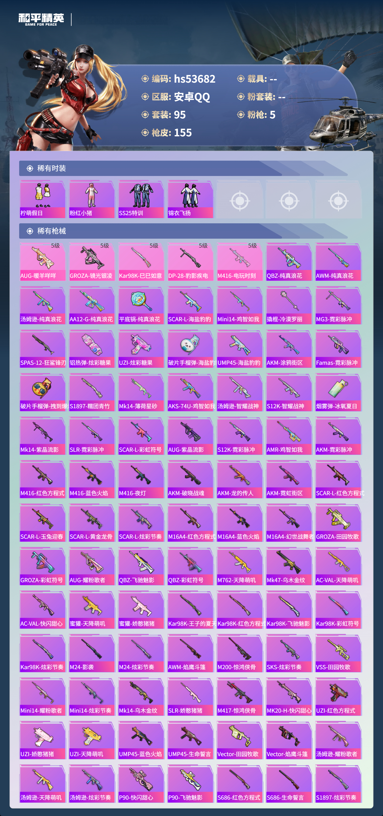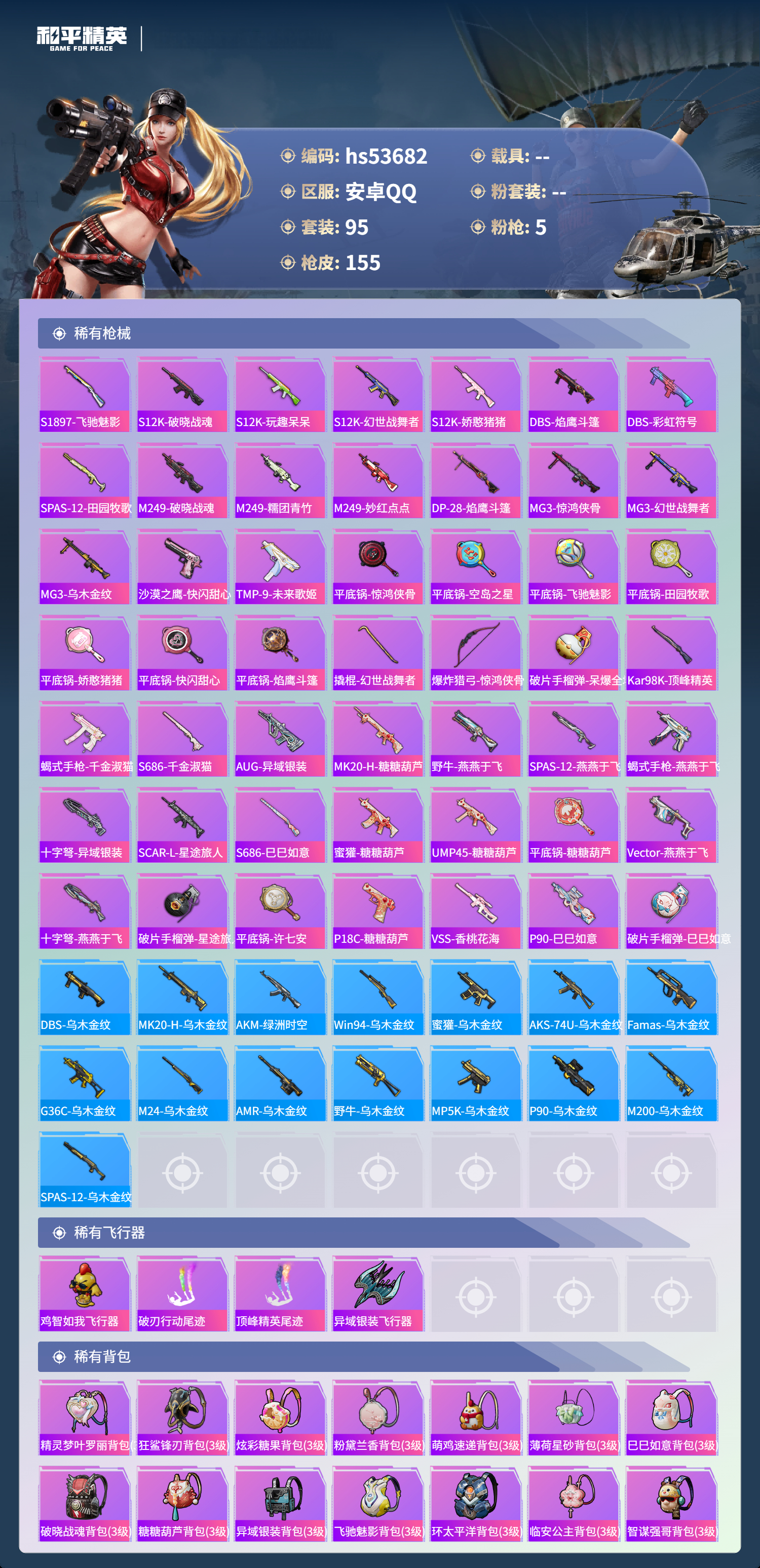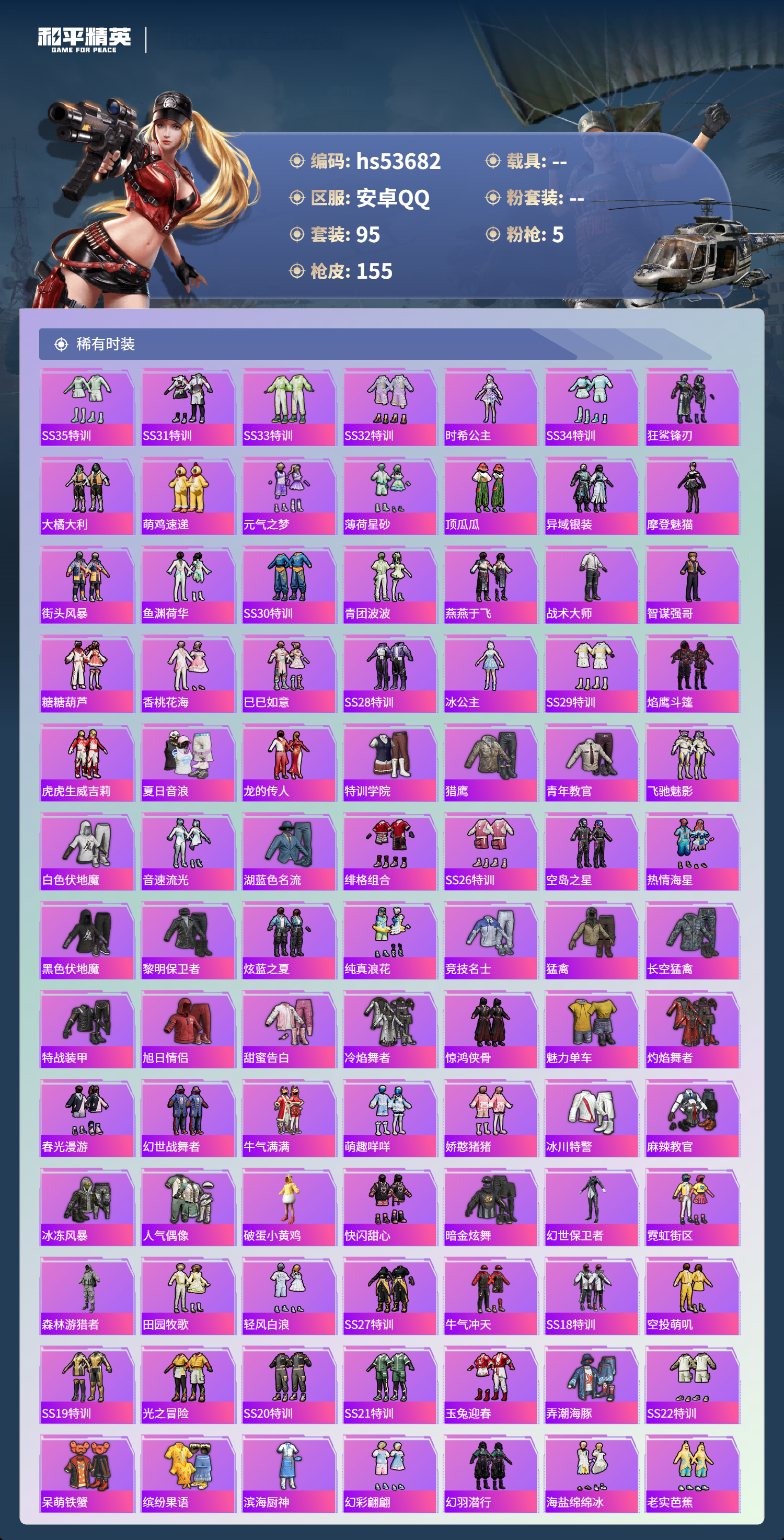 hs53682 安卓手q-13王牌印记-5特效呛-37435热力值-95套装-155呛皮【5特效呛】aug-暖羊咩咩/5级m416-电玩时刻/5级groza-镜光银凌/5级dp-28-豹影疾电/5级kar98k-巳巳如意/5级【95稀有时装】ss35特训ss31特训ss33特训ss32特训时希公主ss34特训狂鲨锋刃大橘大利萌鸡速递元气之梦薄荷星砂顶瓜瓜异域银装