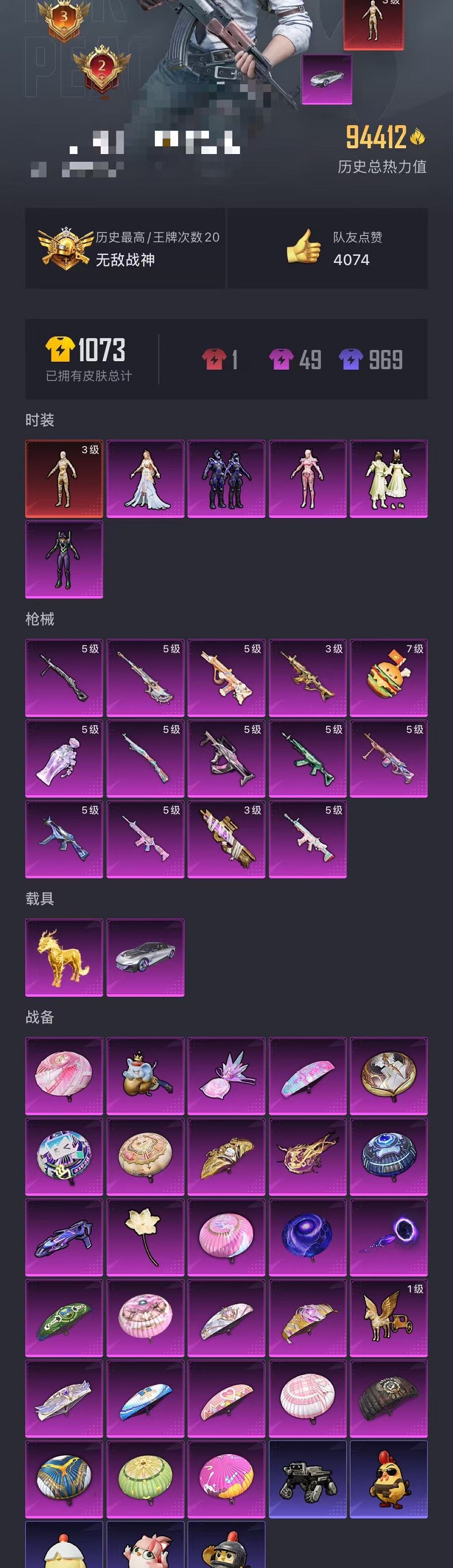 2载具-204套装-283呛皮-【战神框 3级图卡盟巡查衣紫螳螂 5粉装14特效呛2载具】 苹果v区-94412热力值-20印记-历史最高段位:无敌战神-204套装-283呛皮 【1红装】 沙丘之主-图卡盟3级【2载具】 星河领航磐石银 护世瑞兽【1稀有】 巡查衣【5粉装】 紫螳螂 闲梦青缨 动力核心 角色-智耀战神 角色-守护天翼【14特效呛】 scar-l-锦绣绵绵5级 p90-沙丘之主3级