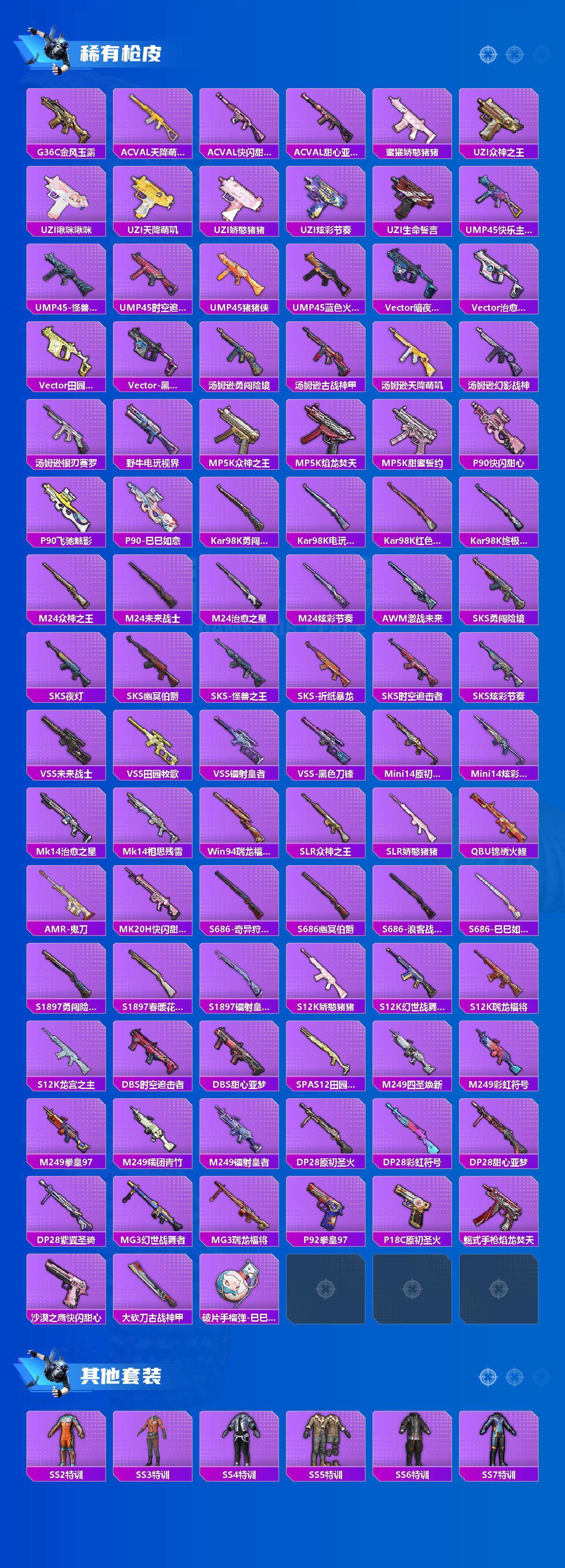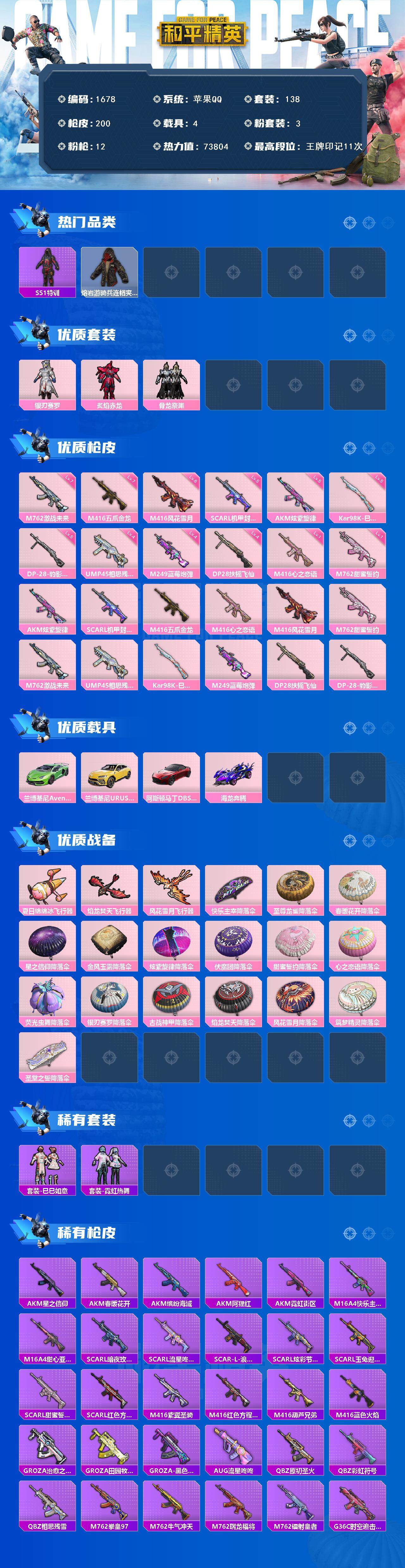 4载具-138套装-200呛皮-138套装/呛械12/装备245/载具4/战备138/王牌印记11/热力值73804/五级akm-炫紫旋律/五级scar-l-机甲封神/七级m416-五爪金龙/m416-心之恋语/六级m416-风花雪月/m762-甜蜜誓约/七级m762-激战未来/四级ump45-相思残雪/五级kar98k-巳巳如意/四级m249-蓝莓炮弹/四级dp-28-扶摇飞仙/五级dp-28-豹影疾电/ss1特训/套装-