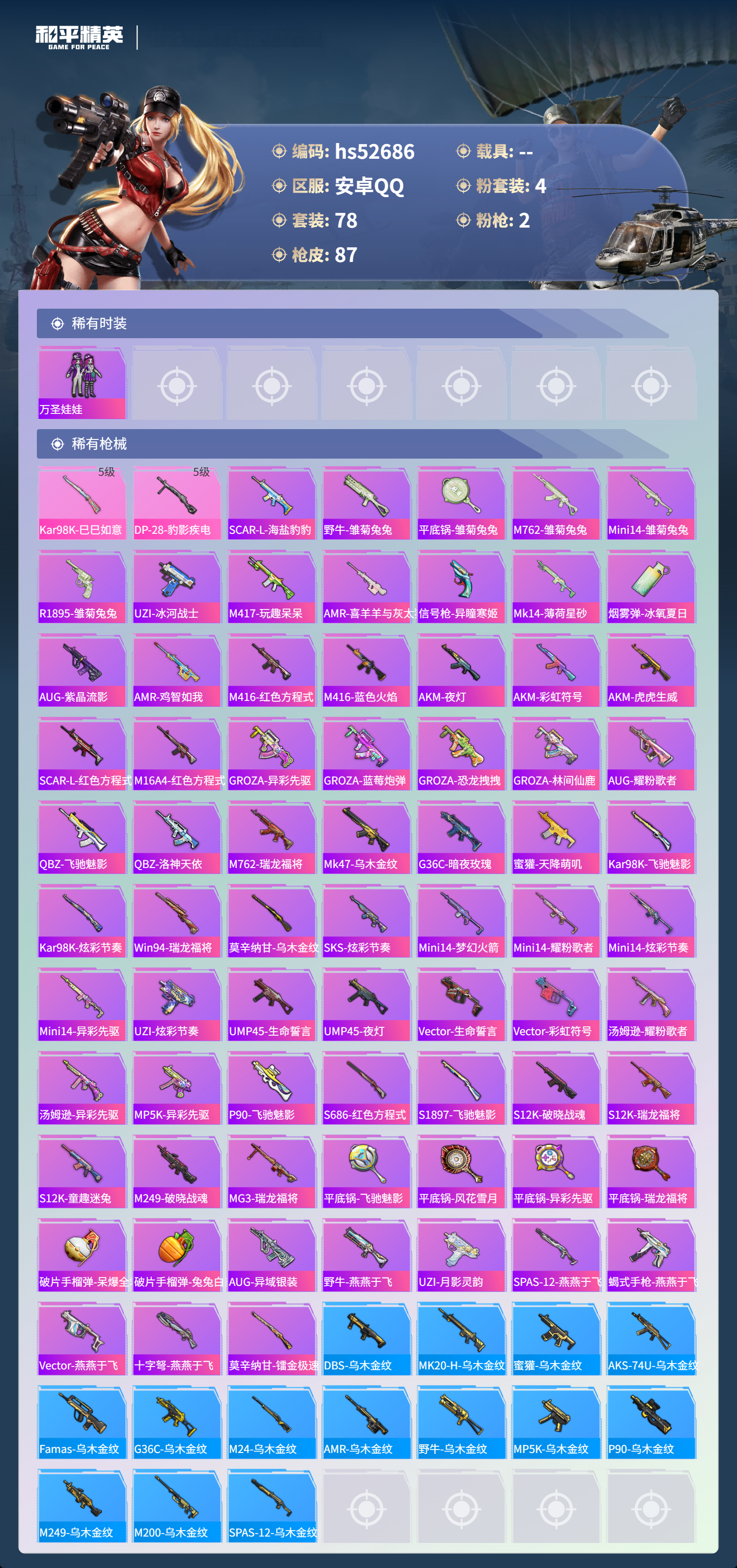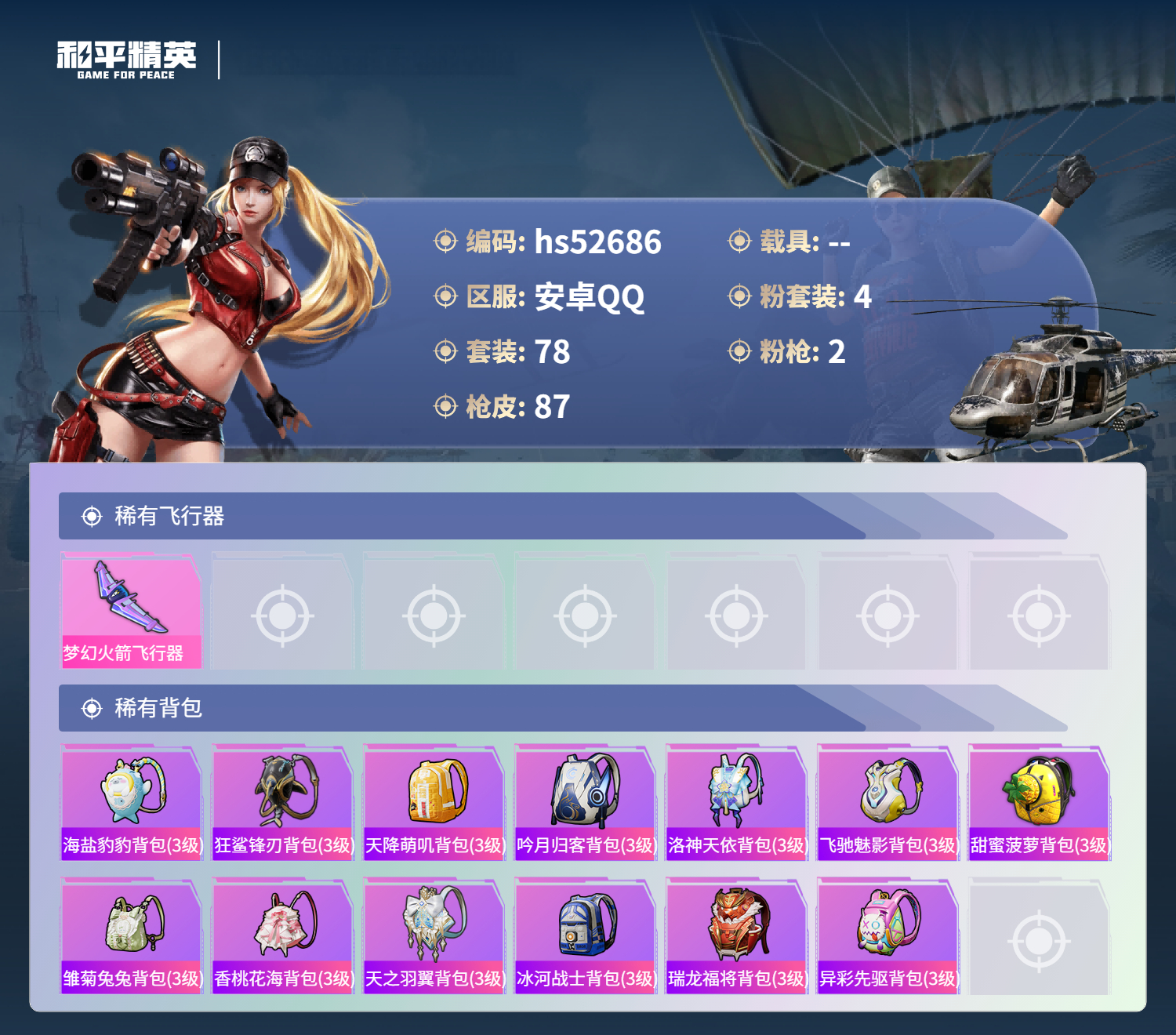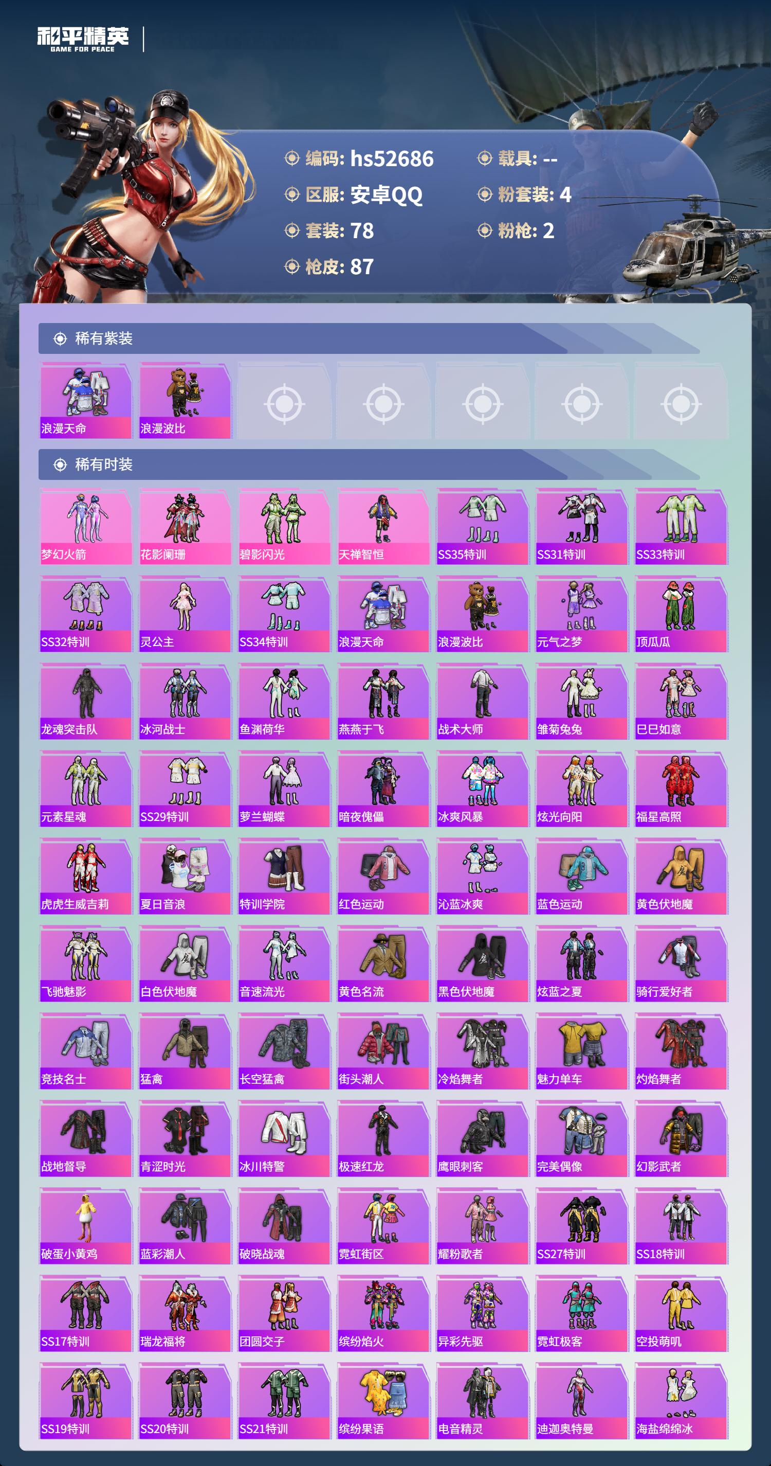 hs52686 安卓手q-3王牌印记-4粉装-2特效呛-30991热力值-78套装-87呛皮【4粉装】套装-碧影闪光套装-花影阑珊套装-梦幻火箭套装-天禅智恒【2特效呛】dp-28-豹影疾电/5级kar98k-巳巳如意/5级【2稀有紫装】浪漫天命浪漫波比【78稀有时装】梦幻火箭ss35特训ss31特训ss33特训ss32特训灵公主ss34特训浪漫天命浪漫波比元气