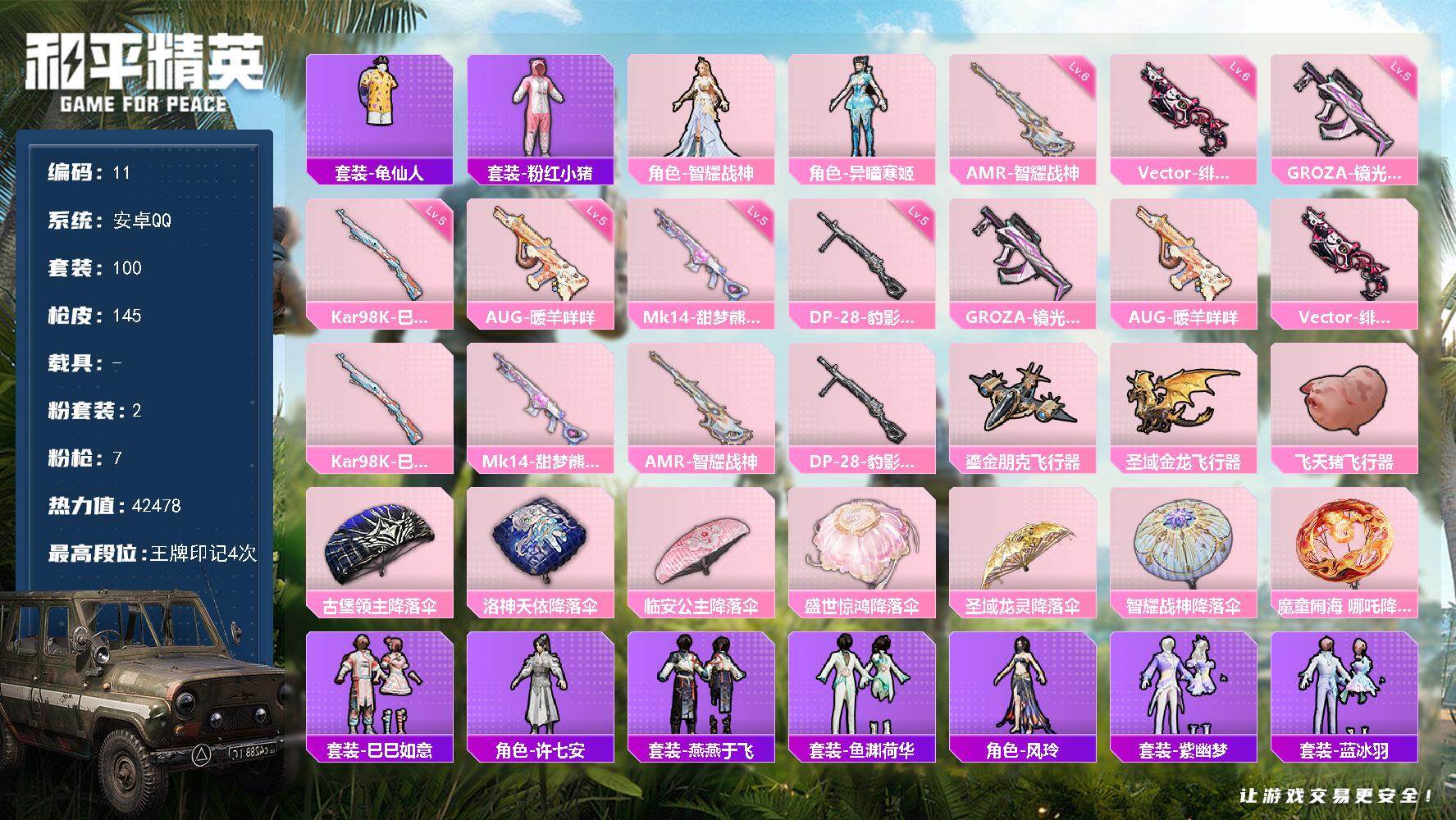 [14600061]【编号88588 可秒换绑】【店长推荐精氪高质量号!买到就是赚到!!】 安卓 手q-2粉装-7特效呛-0载具-4粉色飞行器-42478热力值-4王牌印记-100套装-145呛皮 【热门品类】:套装-龟仙人,套装-粉红小猪 【粉色套装】:角色-智耀战神,角色-异瞳寒姬 【粉色呛皮等级】:groza-镜光银凌五级,aug-暖羊咩咩五级,vect-绯穹魔姬六级,kar98k-巳巳如意五级,mk14-甜梦熊击五级,amr-智耀战神六级,dp-28-豹影疾电五级 【粉色呛皮】:groza-镜光银凌,aug-暖羊咩咩,vect-绯穹魔姬,kar98k-巳巳如意,mk14-甜梦熊击,amr-智耀战神,dp-28-豹影疾电 【粉色飞行器】:鎏金朋克飞行器,圣域金龙飞行器,飞天猪飞行器 【粉色降落伞】:古堡领主降落伞,洛神天依降落伞,临安公主降落伞,盛世惊鸿降落伞,圣域龙灵降落伞,智耀战神降落伞,魔童闹海 哪吒降落伞 【稀有套装】:套装-龟仙人,套装-巳巳如意,角色-许七安,套装-燕燕于飞,套装-鱼渊荷华,角色-风玲,套装-紫幽梦,套装-蓝冰羽,套装-极速光影,套装-云朵鹅,套装-雪绒豹,角色-灵公主,套装-朱霞炽焰,套装-凌霄紫焰 【稀有呛皮】:akm-四圣焕新,akm-夜灯,akm-玉龙,akm-生命誓言,m16a4-蓝色火焰,scar-l-炫彩节奏,scar-l-玉兔迎春,scar-l-红色方程式,m416-红色方程式,m416-蓝色火焰,aug-天降萌叽,aug-耀粉歌者,q-彩虹符号,q-洛神天依,m762-彩虹甜喵,m762-彩虹符号,m762-牛气冲天,m762-云朵鹅,mk47-洛神天依,蜜獾-天降萌叽,蜜獾-绯穹魔姬,arx-凌霄紫焰,uzi-啾咪啾咪,uzi-天降萌叽,uzi-红色方程式,ump45-生命誓言,ump45-蓝色火焰,vect-焰鹰斗篷,vect-彩虹符号,vect-生命誓言,vect-香水柠檬,vect-创世·救赎,汤姆逊-耀粉歌者,野牛-最终圣卫者,js9-凌霄紫焰,p90-巳巳如意,kar98k-彩虹符号,kar98k-欢乐麻酱,kar98k-红色方程式,kar98k-星穹咏叹调,m24-香水柠檬,awm-焰鹰斗篷,sks-夜灯,sks-圣域龙灵,mini14-耀粉歌者,svd-