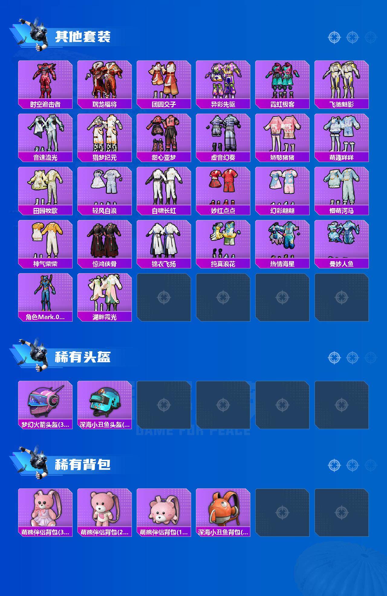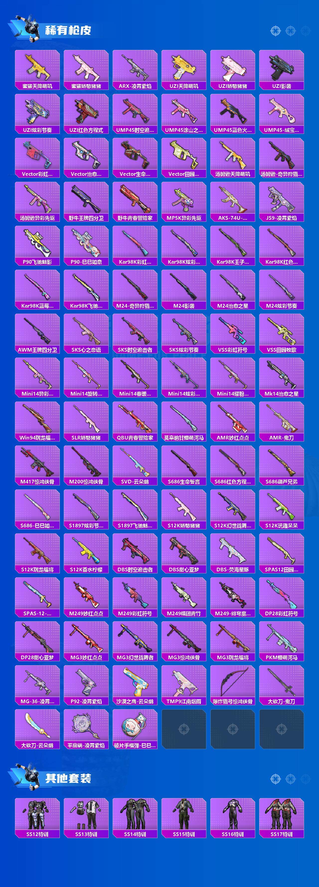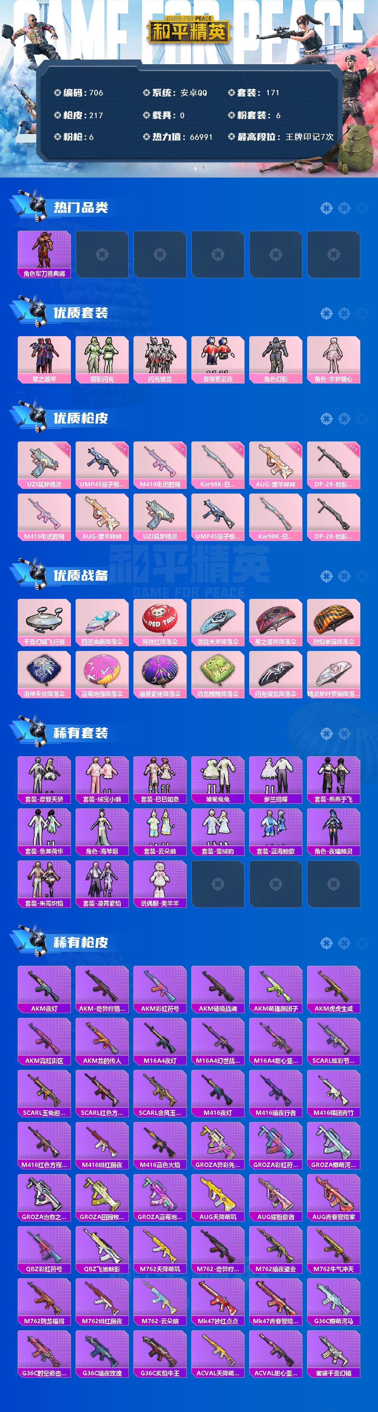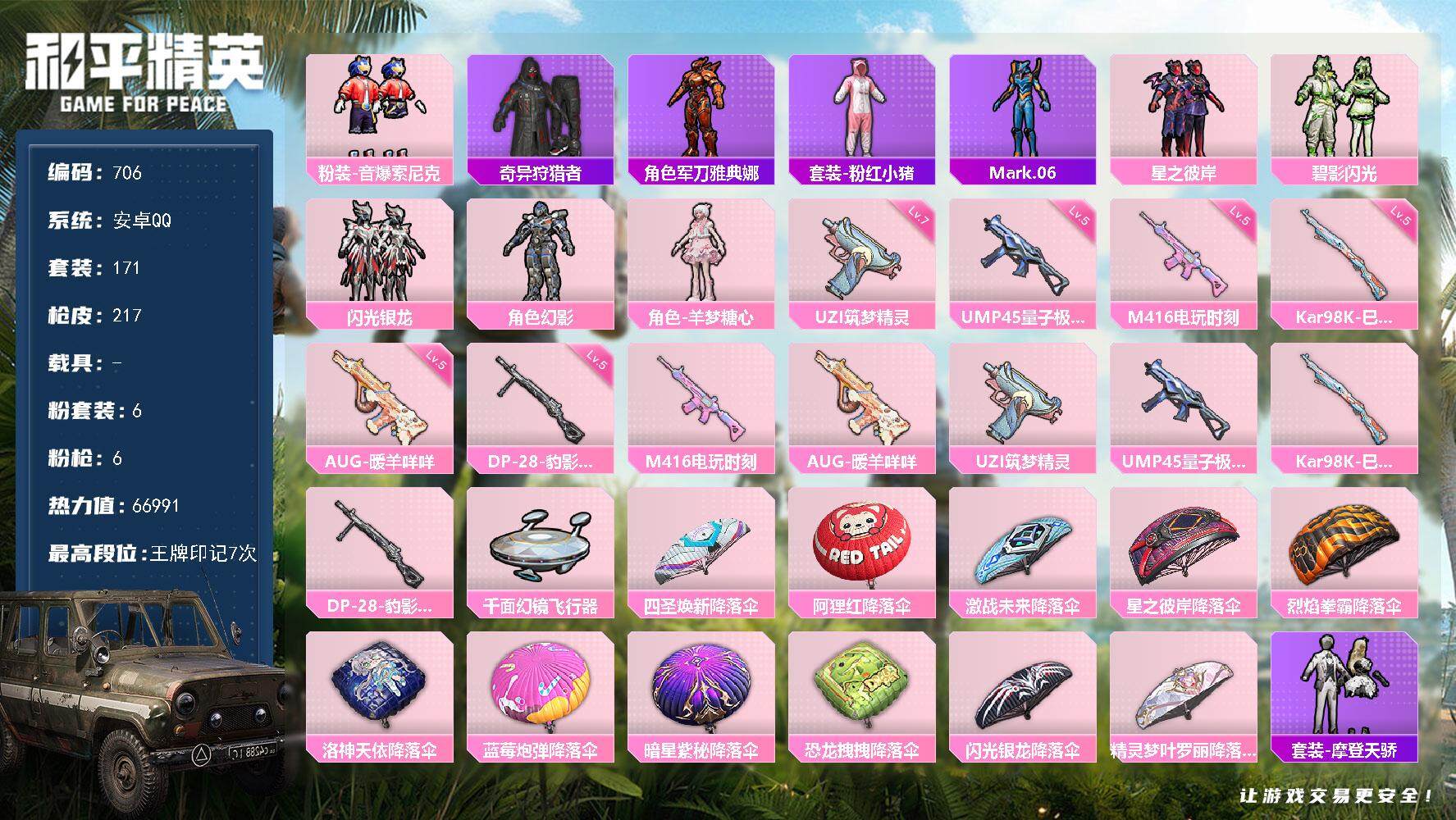 [14734874]安卓 手q-6粉装-6特效呛-0载具-1粉色飞行器-66991热力值-7王牌印记-171套装-217呛皮 【热门品类】:粉装-音爆索尼克,套装-奇异狩猎者,角色-军刀雅典娜,套装-粉红小猪,角色-mark.06 【粉色套装】:粉装-星之彼岸,粉装-碧影闪光,粉装-闪光银龙,粉装-音爆索尼克,角色-幻影,角色-羊梦糖心 【粉色呛皮等级】:m416-电玩时刻五级,aug-暖羊咩咩五级,uzi-筑梦精灵七级,ump45-量子极限五级,kar98k-巳巳如意五级,dp-28-豹影疾电五级 【粉色呛皮】:m416-电玩时刻,aug-暖羊咩咩,uzi-筑梦精灵,ump45-量子极限,kar98k-巳巳如意,dp-28-豹影疾电 【粉色飞行器】:千面幻镜飞行器 【粉色降落伞】:四圣焕新降落伞,阿狸红降落伞,激战未来降落伞,星之彼岸降落伞,烈焰拳霸降落伞,洛神天依降落伞,蓝莓炮弹降落伞,暗星紫秘降落伞,恐龙拽拽降落伞,闪光银龙降落伞,精灵梦叶罗丽降落伞 【稀有套装】:套装-摩登天骄,套装-绒宝小鹅,套装-巳巳如意,套装-雏菊兔兔,套装-萝兰蝴蝶,套装-燕燕于飞,套装-鱼渊荷华,角色-海琴烟,套装-云朵鹅,套装-雪绒豹,套装-蓝海鲸歌,角色-夜瞳黯灵,套装-朱霞炽焰,套装-凌霄紫焰,玩偶服-美羊羊 【稀有呛皮】:akm-夜灯,akm-奇异狩猎者,akm-彩虹符号,akm-破晓战魂,akm-萌趣颜团子,akm-虎虎生威,akm-霓虹街区,akm-龙的传人,m16a4-夜灯,m16a4-幻世战舞者,m16a4-甜心亚梦,scar-l-炫彩节奏,scar-l-玉兔迎春,scar-l-红色方程式,scar-l-金风玉露,m416-夜灯,m416-暗夜行者,m416-糯团青竹,m416-红色方程式,m416-绯红前夜,m416-蓝色火焰,groza-异彩先驱,groza-彩虹符号,groza-懵萌河马,groza-治愈之星,groza-田园牧歌,groza-蓝莓炮弹,aug-天降萌叽,aug-耀粉歌者,aug-青春冒险家,q-彩虹符号,q-飞驰魅影,m762-天降萌叽,m762-奇异狩猎者,m762-暗夜鎏金,m762-牛气冲天,m762-瑞龙福将,m762-绯红前夜,m762-云朵鹅,mk47-妙红点点,mk47-青春冒险家,g36c-懵萌河马,g36c-时