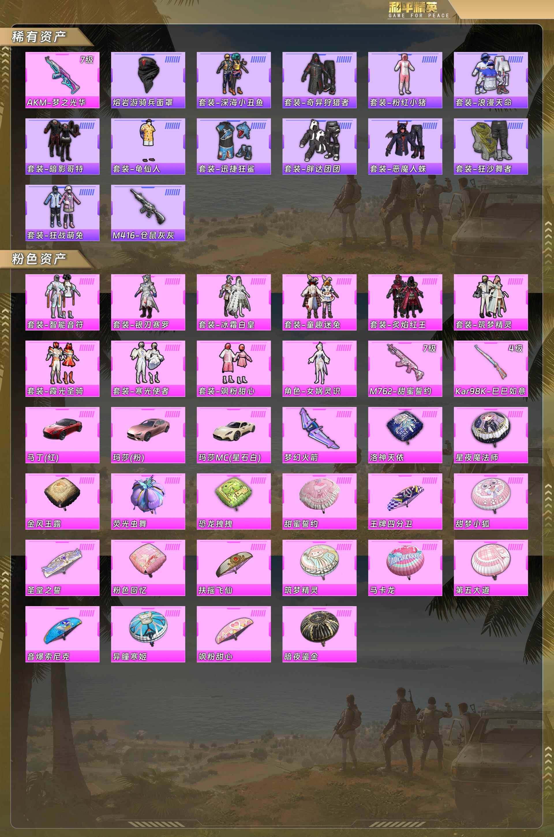身法号-akm-梦之光华[7级]/熔岩游骑兵面罩/深海小丑鱼/浪漫天命/暗影哥特/胖达团团/恶魔人蛛/狂沙舞者/智能音符/银刃赛罗/冰霜白皇/童趣迷兔/炙焰红王/筑梦精灵/霞光圣骑/寒光使者/飒粉甜心/女娲灵识/m762-甜蜜誓约[7级]/kar98k-巳巳如意[4级]/阿斯顿·马丁dbs红/玛莎拉蒂ghibli粉/玛莎拉蒂mc20星石白没战神框 hp4330 【热门品类】:粉装-童趣迷兔,套装-浪漫天命,套装-深海小丑鱼,套装-小丑鱼,套装-奇异狩猎者,套装-胖达团团,套装-龟仙人,套装-暗影哥特,套装-粉红小猪 【粉色载具】:阿斯顿马丁dbs(红),玛莎拉蒂mc20(星石白),玛莎拉蒂ghibli(粉) 【粉色套装】:粉装-智能音符,粉装-银刃赛罗,粉装-冰霜白皇,粉装-童趣迷兔,粉装-炙焰红王,粉装-筑梦精灵,粉装-霞光圣骑,粉装-寒光使者,粉装-飒粉甜心,角色-女娲灵识 【粉色呛皮等级】:akm-梦之光华七级,m762-甜蜜誓约七级,kar98k-巳巳如意四级 【粉色呛皮】:akm-梦之光华,m762-甜蜜誓约,kar98k-巳巳如意 【粉色飞行器】:梦幻火箭飞行器 【粉色降落伞】:粉色回忆降落伞,金风玉露降落伞,甜蜜誓约降落伞,扶摇飞仙降落伞,马卡龙降落伞,荧光虫舞降落伞,王牌四分卫降落伞,洛神天依降落伞,恐龙拽拽降落伞,筑梦精灵降落伞,甜梦小狐降落伞,星夜魔法师降落伞,暗夜鎏金降落伞,音爆索尼克降落伞,第五大道降落伞,飒粉甜心降落伞,圣堂之誓降落伞,异瞳寒姬降落伞 【稀有套装】:套装-龟仙人,套装-燕燕于飞,套装-鱼渊荷华,套装-紫幽梦,套装-蓝冰羽,角色-紫俏灵猫 【稀有呛皮】:akm-夜灯,akm-筑梦精灵,akm-缤纷海域,akm-萌趣颜团子,akm-虎虎生威,akm-阿狸红,m16a4-幻世战舞者,m16a4-甜心亚梦,m16a4-红色方程式,scar-l-炫彩节奏,scar-l-甜蜜誓约,scar-l-碧影闪光,scar-l-青丘仙客,m416-仓鼠灰灰,m416-糯团青竹,m416-红色方程式,m416-绯红前夜,groza-恐龙拽拽,groza-懵萌河马,groza-治愈之星,groza-田园牧歌,aug-天降萌叽,aug-幻梦音符,aug-耀粉歌者,q-原初圣火,q-彩虹符号,q-潮汐统领,q-赛罗,q-飞驰魅影,m762-天降萌叽,m762-奇异狩猎者,m762-暖熊萌萌,m762-牛气冲天,m762-瑞龙福将,m762-镭射皇者,mk47-妙红点点,g36c-懵萌河马,g36c-时空追击者,ac-val-天降萌叽,ac-val-彩虹甜喵,ac-val-快闪甜心,ac-val-甜心亚梦,蜜獾-天降萌叽,蜜獾-娇憨猪猪,uzi-娇憨猪猪,uzi-炫彩节奏,uzi-烈焰拳霸,uzi-红色方程式,ump45-时空追击者,ump45-生命誓言,ump45-蓝色火焰,vect-彩虹符号,vect-治愈之星,vect-生命誓言,vect-田园牧歌,vect-音爆索尼克,vect-香水柠檬,汤姆逊-奇异狩猎者,汤姆逊-耀粉歌者,汤姆逊-银刃赛罗,野牛-夜灯,mp5k-甜蜜誓约,mp5k-繁花小夜曲,p90-快闪甜心,p90-筑梦精灵,p90-飞驰魅影,p90-巳巳如意,kar98k-彩虹符号,kar98k-影袭,kar98k-洛神天依,kar98k-炫彩节奏,kar98k-童话森林,kar98k-飞驰魅影,kar98k-马卡龙,m24-治愈之星,m24-炫彩节奏,m24-奇异狩猎者,awm-炙焰牛王,sks-心之恋语,sks-时空追击者,sks-炫彩节奏,vss-田园牧歌,vss-繁花小夜曲,vss-镭射皇者,mini14-原初圣火,mini14-星夜魔法师,mini14-炫彩节奏,mini14-筑梦精灵,mini14-耀粉歌者,mk14-治愈之星,mk14-童趣迷兔,win94-瑞龙福将,slr-四圣焕新,slr-娇憨猪猪,slr-彩虹符号,莫辛纳甘-懵萌河马,amr-妙红点点,m417-惊鸿侠骨,mk20-h-快闪甜心,m200-惊鸿侠骨,m200-绿野极光,s686-奇异狩猎者,s686-橘柚倾心,s686-生命誓言,s1897-镭射皇者,s1897-飞驰魅影,s12k-瑞龙福将,s12k-童趣迷兔,s12k-音爆索尼克,s12k-香水柠檬,s12k-娇憨猪猪,s12k-幻世战舞者,dbs-彩虹甜喵,dbs-时空追击者,dbs-甜心亚梦,spas-12-田园牧歌,m249-妙红点点,m249-彩虹符号,m249-镭射皇者,dp-28-原初圣火,dp-28-橘柚倾心,dp-28-甜心亚梦,dp-28-甜心宝贝,dp-28-锦绣火鲤,mg3-妙红点点,mg3-幻世战舞者,mg3-惊鸿侠骨,mg3-瑞龙福将,pkm-懵萌河马,p18c-原初圣火,沙墨之鹦-快闪甜心,爆炸猎弓-惊鸿侠骨,大砍刀-鬼刀,破片手留单-巳巳如意 【其他套装】:套装-ss14特训,套装-ss19特训,套装-ss20特训,套装-ss21特训,套装-ss22特训,套装-ss23特训,套装-ss24特训,套装-ss25特训,套装-光之冒险,套装-冰川格斗者,套装-千禧之恋,套装-夏日音浪,套装-幻世战舞者,套装-幻影武者,套装-怒火燎原,套装-暗影哥特,套装-柠萌假日,套装-格斗先锋,套装-沙漠兵团,套装-浪漫天命,套装-海上生明月,套装-灰色格斗者,套装-炫蓝之夏,套装-牛气满满,套装-特战装甲,套装-特殊使命,套装-特训学院,套装-狂战萌兔,套装-狂沙舞者,套装-猛禽,套装-王牌教练,套装-甜蜜告白,套装-甜蜜熊情侣,套装-白熊同盟,套装-神秘领域,套装-福星高照,套装-空岛之星,套装-竞技名士,套装-粉红小猪,套装-缤纷果语,套装-萌趣颜团子,套装-萌黄之夏,套装-虎虎生威吉莉,套装-野性战心,套装-长空猛禽,套装-霸义无双,套装-飞行日记,套装-魅力单车,套装-鹤鸣,套装-麻辣教官,套装-龙腾端午,套装-龟仙人,套装-奇异狩猎者,套装-蓝调潮人,套装-贵族骑装,套装-深海小丑鱼,套装-迅捷狂鲨,套装-弄潮海豚,套装-wifi精灵,套装-初雨海棠,套装-恶魔人蛛,套装-风华少年志,套装-暗夜契约,套装-纯白誓言,套装-逆风勇士,套装-青龙圣者,套装-海洋之心,套装-镭射皇者,套装-银白舞王,套装-闪金天王,套装-薄荷蓝莓,套装-治愈之星,套装-科技之星,套装-暴风机械师,套装-时空追击者,套装-团圆交子,套装-天籁歌者,套装-炫光向阳,套装-极速竞梦,套装-飞驰魅影,套装-音速流光,套装-雪兔飞飞,套装-智慧隐士,套装-甜心亚梦,套装-虚音幻奏,套装-奶芙汪汪,套装-恶魔喵喵,套装-王牌投手,