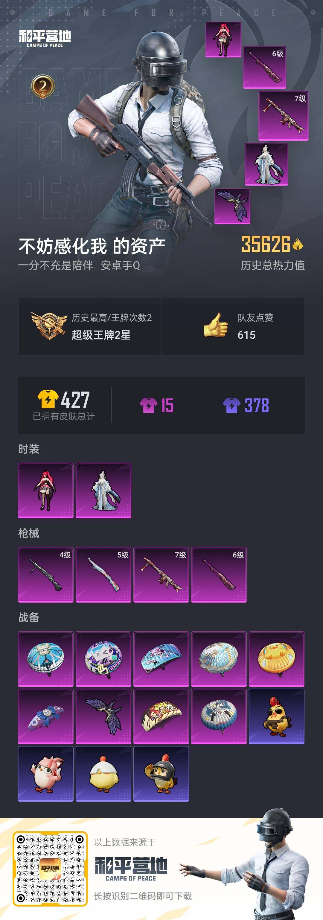 _2315143-手q-2粉装-4特效呛-0载具-1粉色飞行器-35626热力值-2王牌印记-80套装-136呛皮 【热门品类】:套装-龟仙人,套装-粉红小猪 【粉色套装】:角色-宁雨蝶,角色-绯穹魔姬 【粉色呛皮等级】:kar98k-巳巳如意五级,m24-暗星紫秘六级,dp-28-豹影疾电四级,mg3-炙焰牛王七级 【粉色呛皮】:kar98k-巳巳如意,m24-暗星紫秘,dp-28-豹影疾电,mg3-炙焰牛王 【粉色飞行器】:星夜魔法师飞行翼 【粉色降落伞】:甜心宝贝降落伞,银刃赛罗降落伞,童趣迷兔降落伞,垂柳戏鸭降落伞,金丰海韵降落伞,幻星舰长降落伞,幻彩电音降落伞,异瞳寒姬降落伞 【稀有套装】:套装-龟仙人,套装-雏菊兔兔,套装-萝兰蝴蝶,套装-火种守卫者,套装-糖糖葫芦,套装-青团波波,套装-紫幽梦,套装-蓝冰羽,角色-猎影月神,套装-霓虹热舞,套装-朱霞炽焰,套装-凌霄紫焰,角色-绯色魅影 【稀有呛皮】:akm-夜灯,akm-破晓战魂,akm-缤纷海域,m16a4-幻世战舞者,m16a4-甜心亚梦,m16a4-千金淑猫,scar-l-炫彩节奏,scar-l-玉兔迎春,scar-l-红色方程式,m416-月影鸳鸯,m416-红色方程式,groza-恐龙拽拽,groza-治愈之星,aug-天降萌叽,q-赛罗,q-飞驰魅影,m762-天降萌叽,m762-彩虹符号,m762-墨金战记,ac-val-甜心亚梦,蜜獾-天降萌叽,蜜獾-娇憨猪猪,arx-凌霄紫焰,uzi-天降萌叽,uzi-娇憨猪猪,ump45-生命誓言,ump45-蓝色火焰,ump45-圣穹绘梦,vect-彩虹符号,vect-治愈之星,vect-生命誓言,汤姆逊-天降萌叽,汤姆逊-炫彩节奏,汤姆逊-智耀战神,aks-74u-鬼刀,js9-凌霄紫焰,p90-飞驰魅影,kar98k-彩虹符号,kar98k-飞驰魅影,m24-治愈之星,awm-庄周梦蝶,sks-迅猛狂鲨,vss-碧影闪光,mini14-炫彩节奏,mini14-耀粉歌者,mk14-山经魅狐,mk14-治愈之星,slr-娇憨猪猪,amr-喜羊羊与灰太狼,s686-生命誓言,s686-巳巳如意,s1897-炫彩节奏,s1897-碧影闪光,s1897-飞驰魅影,s12k-破晓战魂,s12k-娇憨猪猪,s12k-幻世战舞者,s