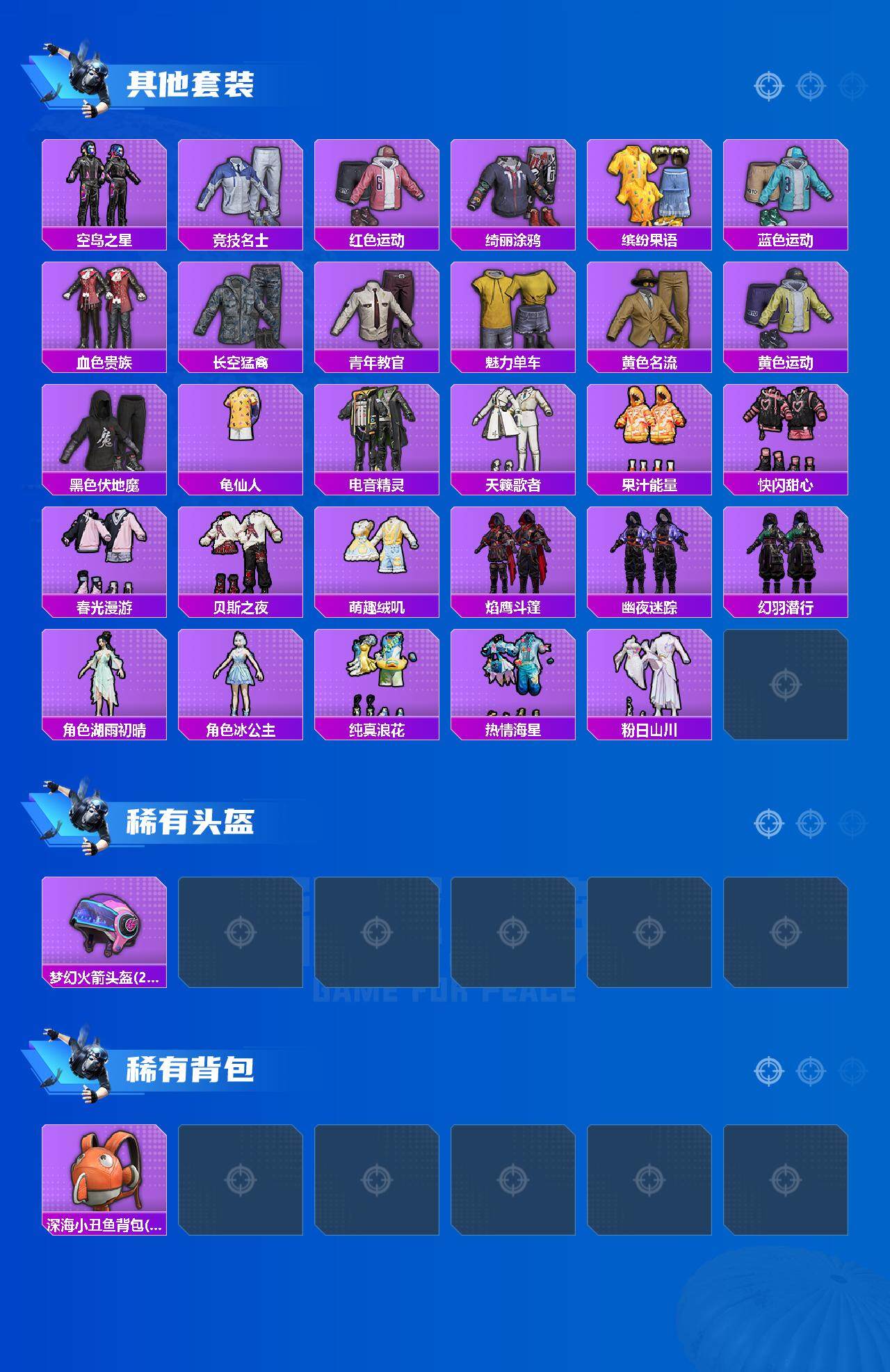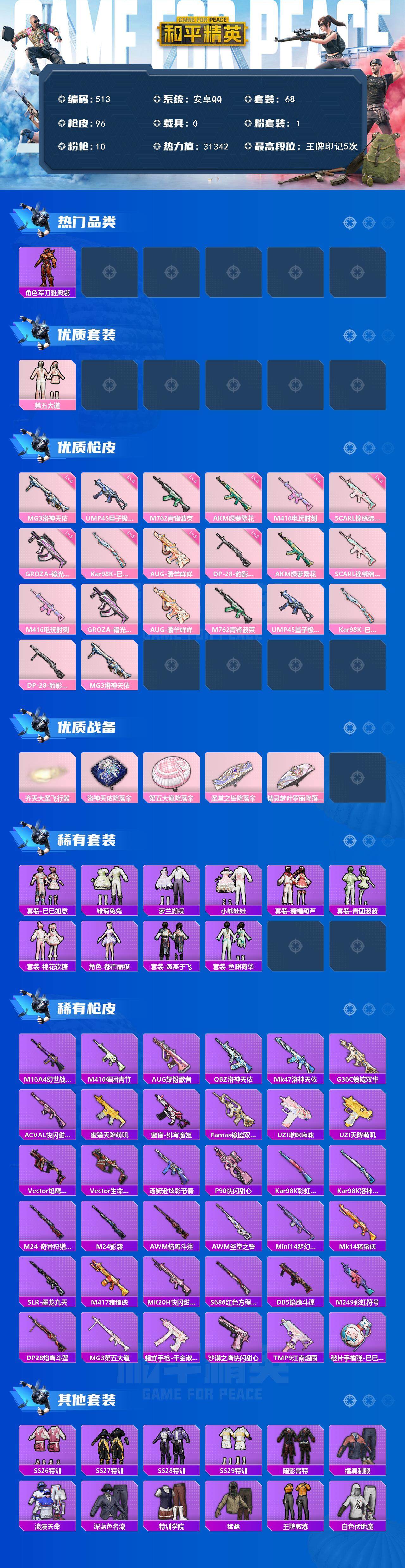 _2315154-手q-1粉装-10特效呛-0载具-2粉色飞行器-31342热力值-5王牌印记-68套装-96呛皮 【热门品类】:套装-浪漫天命,角色-军刀雅典娜,套装-龟仙人,套装-暗影哥特 【粉色套装】:粉装-第五大道 【粉色呛皮等级】:akm-绿萝繁花五级,scar-l-锦绣绵绵五级,m416-电玩时刻五级,groza-镜光银凌五级,aug-暖羊咩咩五级,m762-青锋波束五级,ump45-量子极限五级,kar98k-巳巳如意五级,dp-28-豹影疾电三级,mg3-洛神天依六级 【粉色呛皮】:akm-绿萝繁花,scar-l-锦绣绵绵,m416-电玩时刻,groza-镜光银凌,aug-暖羊咩咩,m762-青锋波束,ump45-量子极限,kar98k-巳巳如意,dp-28-豹影疾电,mg3-洛神天依 【粉色飞行器】:齐天大圣飞行器 【粉色降落伞】:洛神天依降落伞,第五大道降落伞,圣堂之誓降落伞,精灵梦叶罗丽降落伞 【稀有套装】:套装-龟仙人,套装-巳巳如意,套装-雏菊兔兔,套装-萝兰蝴蝶,套装-小熊娃娃,套装-糖糖葫芦,套装-青团波波,套装-棉花软糖,角色-都市丽猫,套装-燕燕于飞,套装-鱼渊荷华 【稀有呛皮】:m16a4-幻世战舞者,m416-糯团青竹,aug-耀粉歌者,q-洛神天依,mk47-洛神天依,g36c-镜域双华,ac-val-快闪甜心,蜜獾-天降萌叽,蜜獾-绯穹魔姬,famas-镜域双华,uzi-啾咪啾咪,uzi-天降萌叽,vect-焰鹰斗篷,vect-生命誓言,汤姆逊-炫彩节奏,p90-快闪甜心,kar98k-彩虹符号,kar98k-洛神天依,m24-影袭,m24-奇异狩猎者,awm-焰鹰斗篷,awm-圣堂之誓,mini14-梦幻火箭,mk14-猪猪侠,slr-墨龙九天,m417-猪猪侠,mk20-h-快闪甜心,s686-红色方程式,dbs-焰鹰斗篷,m249-彩虹符号,dp-28-焰鹰斗篷,mg3-第五大道,蝎式手呛-千金淑猫,沙墨之鹦-快闪甜心,tmp-9-江南烟雨,破片手留单-巳巳如意 【其他套装】:套装-ss26特训,套装-ss27特训,套装-ss28特训,套装-ss29特训,套装-暗影哥特,套装-橘黑制服,套装-浪漫天命,套装-深蓝色名流,套装-特训学院,套装-猛禽,套装-王牌教练,套装-白色伏地
