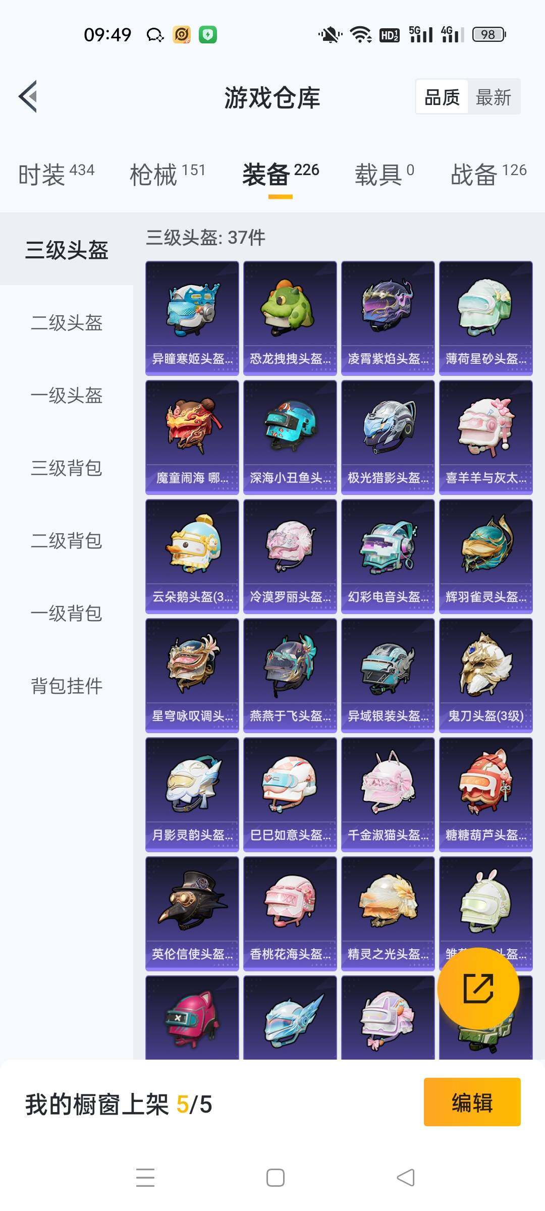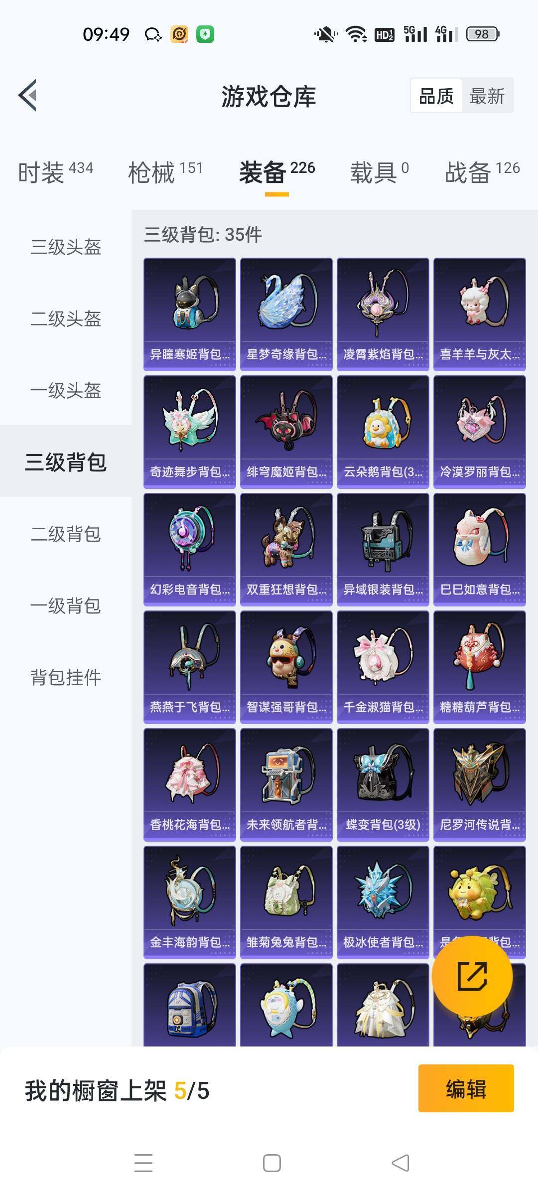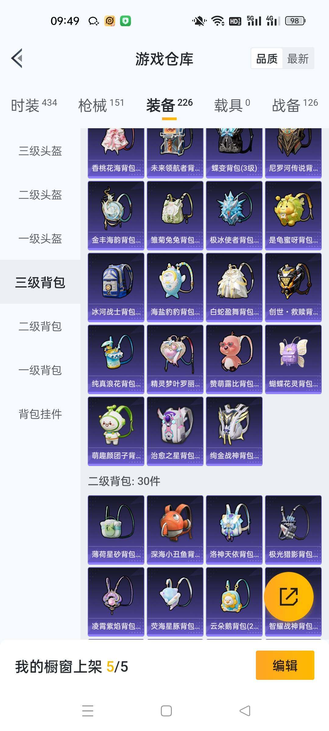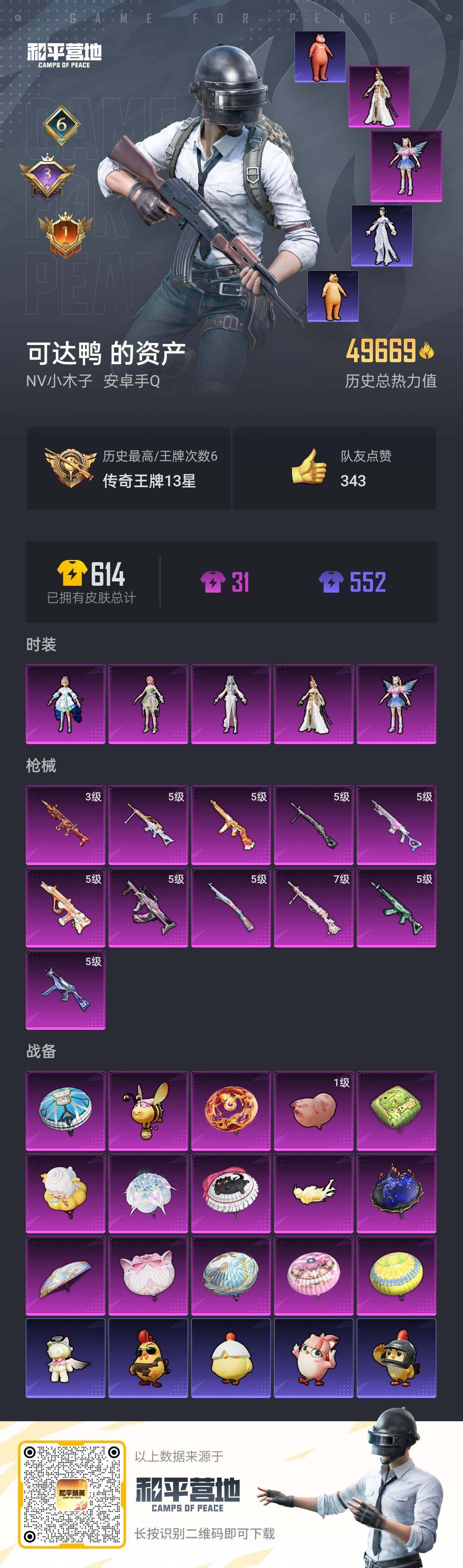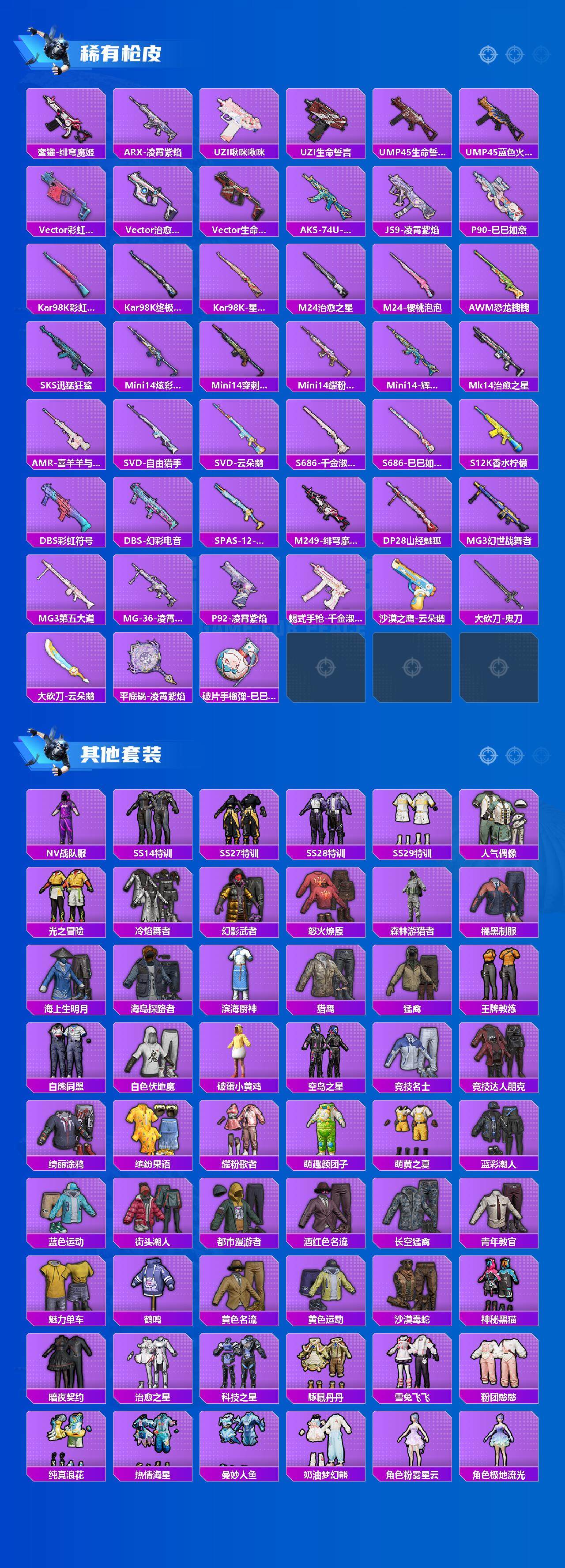 _2315156-手q-5粉装-11特效呛-0载具-3粉色飞行器-49669热力值-6王牌印记-111套装-152呛皮 【热门品类】:套装-小丑鱼,角色-8号机 【粉色套装】:角色-洛天依,角色-电磁星,角色-萨利娅,角色-冷漠罗丽,角色-花灵 【粉色呛皮等级】:scar-l-魔童闹海哪吒三级,groza-镜光银凌五级,aug-暖羊咩咩五级,m762-青锋波束五级,ump45-量子极限五级,汤姆逊-热量炸弹五级,kar98k-巳巳如意五级,mk14-甜梦熊击五级,dp-28-千金淑猫七级,dp-28-豹影疾电五级,mg-36-沧焰双生五级 【粉色呛皮】:scar-l-魔童闹海哪吒,groza-镜光银凌,aug-暖羊咩咩,m762-青锋波束,ump45-量子极限,汤姆逊-热量炸弹,kar98k-巳巳如意,mk14-甜梦熊击,dp-28-千金淑猫,dp-28-豹影疾电,mg-36-沧焰双生 【粉色飞行器】:雀灵庇佑飞行器,飞天猪飞行器 【粉色降落伞】:香水柠檬降落伞,恐龙拽拽降落伞,守护天翼降落伞,金丰海韵降落伞,千金淑猫降落伞,月影灵韵降落伞,鬼刀降落伞,绯穹魔姬降落伞,无垠阁降落伞,喜羊羊与灰太狼降落伞,魔童闹海哪吒降落伞,异瞳寒姬降落伞 【稀有套装】:玩偶服-酷勇熊大,玩偶服-憨乐熊二,套装-巳巳如意,套装-雏菊兔兔,套装-萝兰蝴蝶,套装-小熊娃娃,角色-多纳泰罗,套装-糖糖葫芦,套装-青团波波,套装-棉花软糖,角色-怀庆长公主,套装-燕燕于飞,套装-鱼渊荷华,角色-风玲,角色-海琴烟,套装-星影赞美诗,套装-霓虹热舞,套装-彩虹兔,套装-云朵鹅,套装-雪绒豹,套装-蓝海鲸歌,角色-绛羽幽主,套装-朱霞炽焰,套装-凌霄紫焰,套装-擎苍青焰,玩偶服-美羊羊,角色-绯色魅影,角色-紫俏灵猫 【稀有呛皮】:akm-夜灯,akm-恐龙拽拽,akm-萌趣颜团子,m16a4-夜灯,m16a4-幻世战舞者,m16a4-千金淑猫,scar-l-炫彩节奏,scar-l-玉兔迎春,scar-l-红色方程式,m416-红色方程式,groza-恐龙拽拽,groza-治愈之星,groza-荧海星豚,aug-天降萌叽,m762-天降萌叽,m762-云朵鹅,g36c-星穹咏叹调,蜜獾-天降萌叽,蜜獾-绯穹魔姬,arx-凌霄紫焰,uzi-啾咪啾咪,uzi-