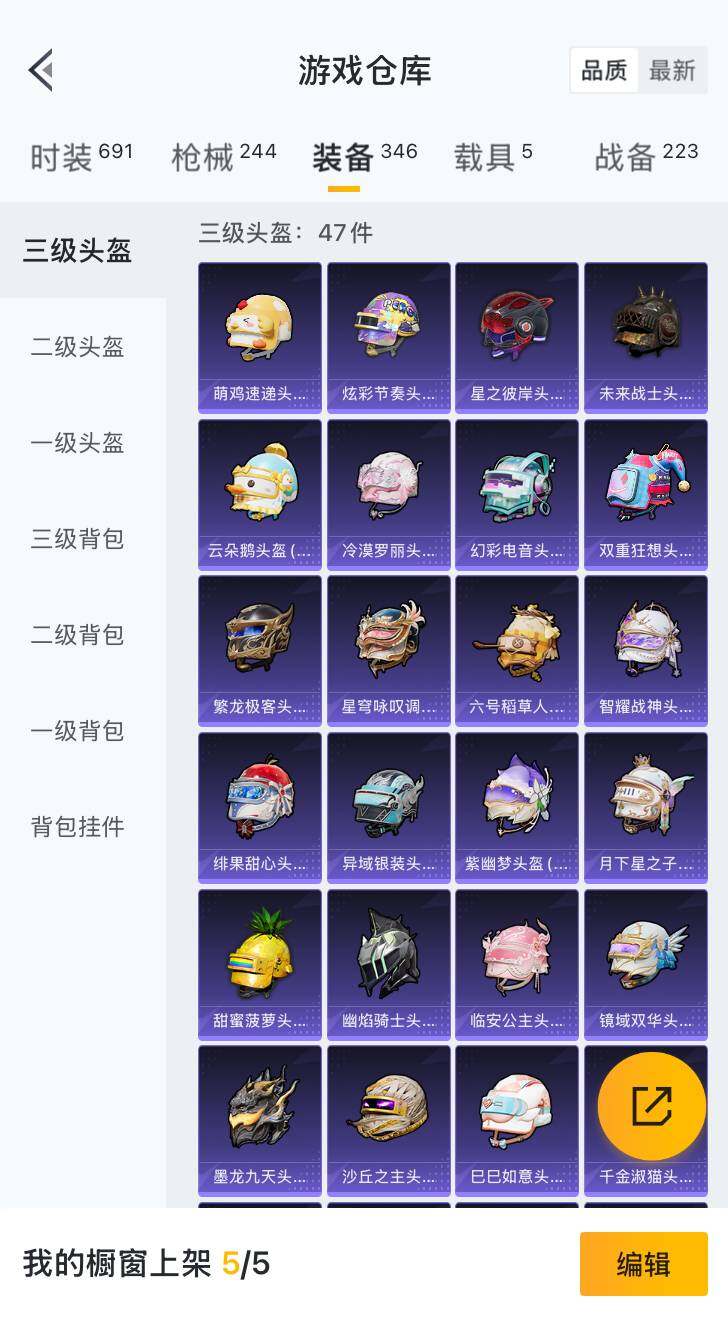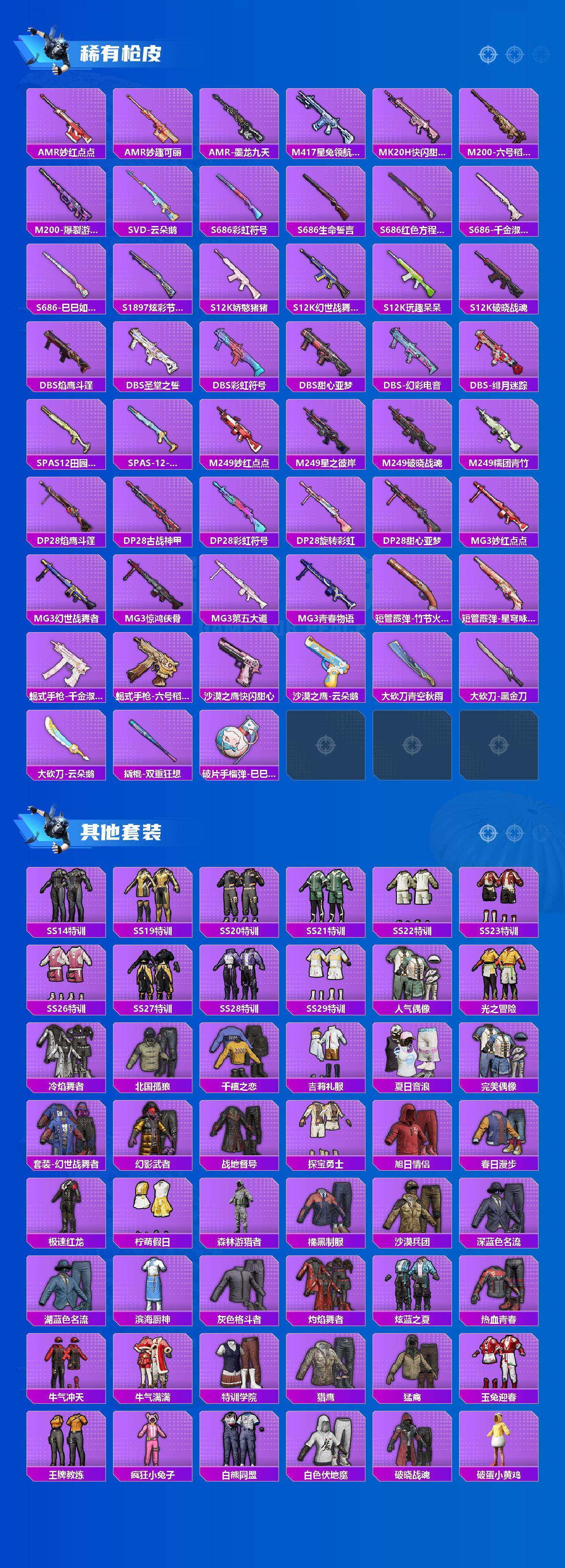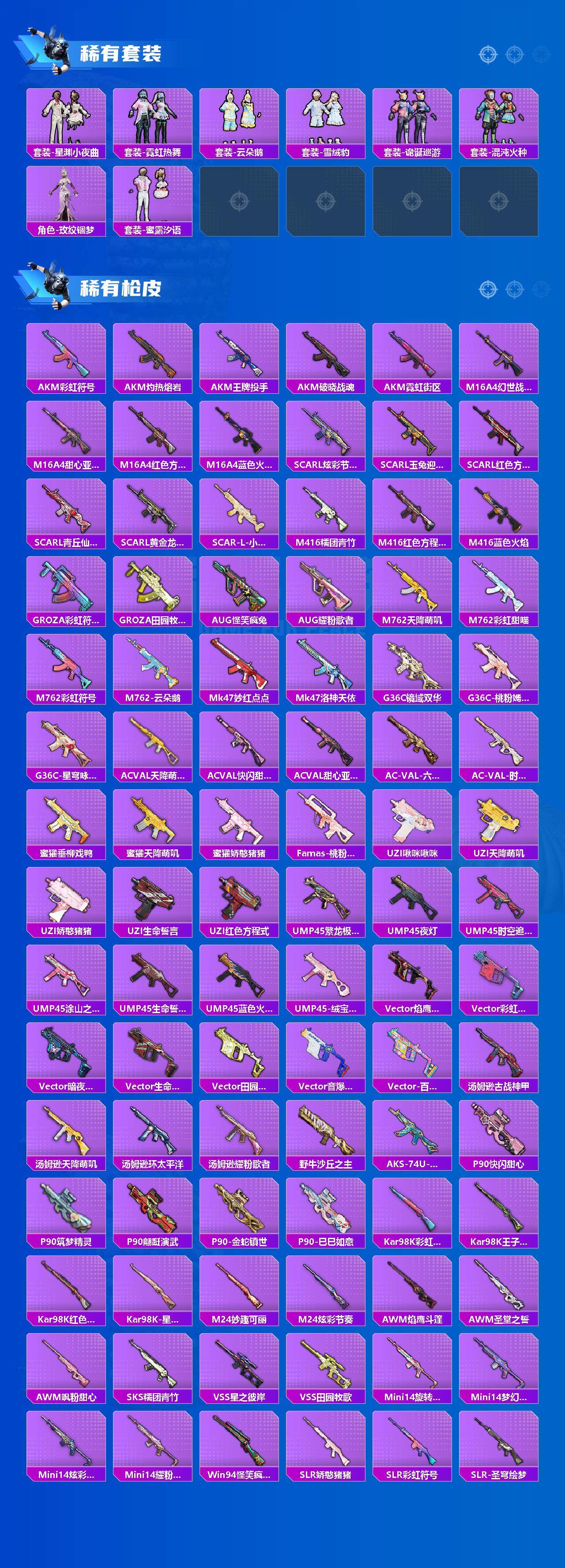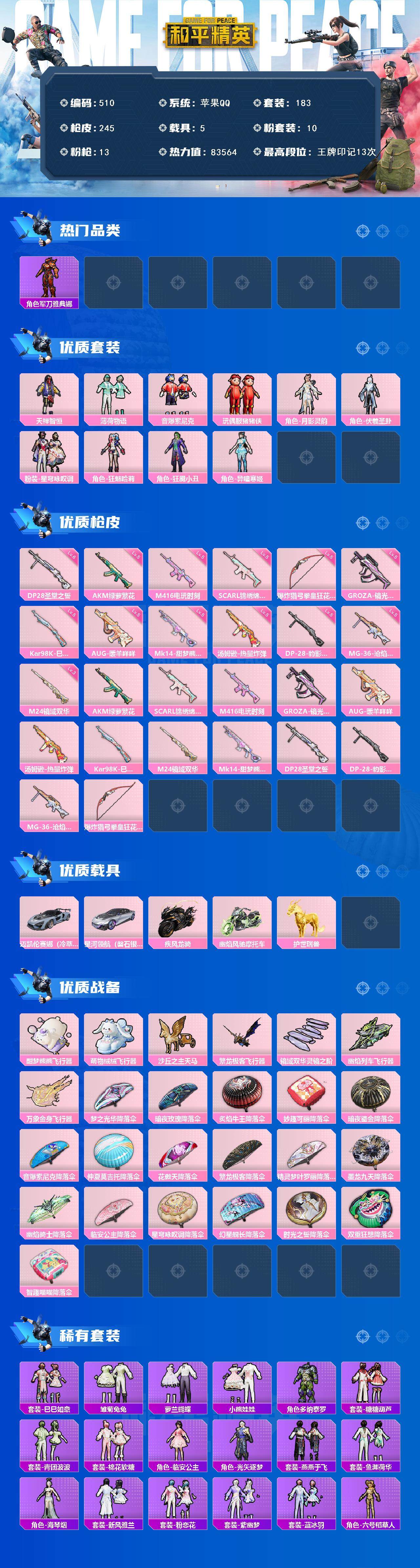 _2315162-手q-10粉装-13特效呛-5载具-8粉色飞行器-83564热力值-13王牌印记-183套装-245呛皮 【热门品类】:粉装-音爆索尼克,角色-军刀雅典娜,套装-龟仙人,套装-粉红小猪,角色-8号机,角色-mark.06,角色-六号稻草人 【粉色套装】:粉装-天禅智恒,粉装-薄荷物语,粉装-音爆索尼克,玩偶服-猪猪侠,角色-月影灵韵,角色-伏羲圣卦,粉装-星穹咏叹调,角色-狂魅哈莉,角色-狂魇小丑,角色-异瞳寒姬 【粉色呛皮等级】:akm-绿萝繁花五级,scar-l-锦绣绵绵五级,m416-电玩时刻五级,groza-镜光银凌五级,aug-暖羊咩咩五级,汤姆逊-热量炸弹五级,kar98k-巳巳如意五级,m24-镜域双华三级,mk14-甜梦熊击五级,dp-28-圣堂之誓六级,dp-28-豹影疾电五级,mg-36-沧焰双生五级,爆炸猎弓-拳皇·狂花道五级 【粉色载具】:迈凯伦塞纳(冷萃蓝),星河领航(磐石银),疾风龙骑,幽焰风驰摩托车,护世瑞兽 【粉色呛皮】:akm-绿萝繁花,scar-l-锦绣绵绵,m416-电玩时刻,groza-镜光银凌,aug-暖羊咩咩,汤姆逊-热量炸弹,kar98k-巳巳如意,m24-镜域双华,mk14-甜梦熊击,dp-28-圣堂之誓,dp-28-豹影疾电,mg-36-沧焰双生,爆炸猎弓-拳皇·狂花道 【粉色飞行器】:酣梦熊熊飞行器,萌物绒绒飞行器,沙丘之主天马,繁龙极客飞行器,镜域双华-灵镜之阶,幽焰列车飞行器,万象金身飞行器 【粉色降落伞】:梦之光华降落伞,暗夜玫瑰降落伞,炙焰牛王降落伞,妙趣可丽降落伞,暗夜鎏金降落伞,音爆索尼克降落伞,仲夏莫吉托降落伞,花傲天降落伞,繁龙极客降落伞,精灵梦叶罗丽降落伞,墨龙九天降落伞,幽焰骑士降落伞,临安公主降落伞,星穹咏叹调降落伞,幻星舰长降落伞,时光之誓降落伞,双重狂想降落伞,智趣喵喵降落伞 【稀有套装】:套装-龟仙人,套装-巳巳如意,套装-雏菊兔兔,套装-萝兰蝴蝶,套装-小熊娃娃,角色-多纳泰罗,套装-糖糖葫芦,套装-青团波波,套装-棉花软糖,角色-临安公主,角色-光矢逐梦,套装-燕燕于飞,套装-鱼渊荷华,角色-海琴烟,套装-新风雅兰,套装-粉恋花,套装-紫幽梦,套装-蓝冰羽,角色-六号稻草人,套装-星渊小夜曲,套装-霓虹热舞,套装-云朵鹅,套