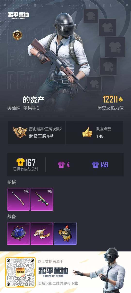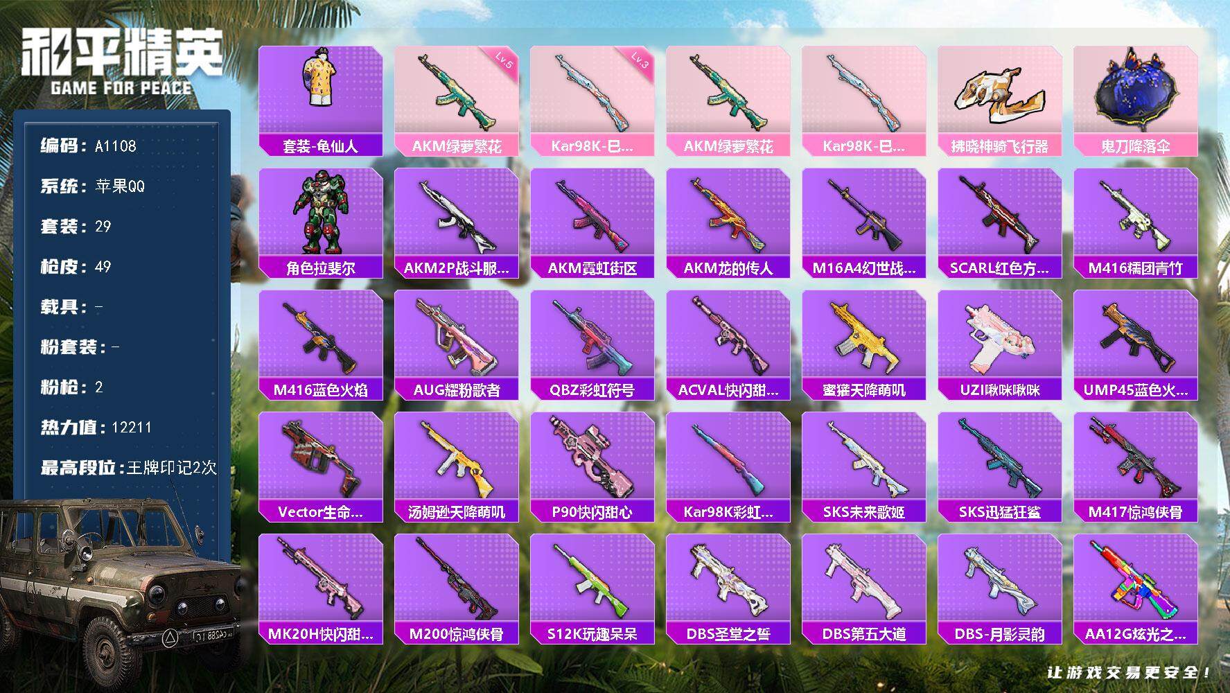 [14734021]苹果【小号/2特效呛-1粉色飞行器】 手q12211热力值-2王牌印记-29套装-49呛皮 【热门品类】:套装-龟仙人 【粉色呛皮等级】:akm-绿萝繁花五级,kar98k-巳巳如意三级 【粉色呛皮】:akm-绿萝繁花,kar98k-巳巳如意 【粉色飞行器】:拂晓神骑飞行器 【粉色降落伞】:鬼刀降落伞 【稀有套装】:套装-龟仙人,角色-拉斐尔 【稀有呛皮】:akm-2p战斗服款,akm-霓虹街区,akm-龙的传人,m16a4-幻世战舞者,scar-l-红色方程式,m416-糯团青竹,m416-蓝色火焰,aug-耀粉歌者,q-彩虹符号,ac-val-快闪甜心,蜜獾-天降萌叽,uzi-啾咪啾咪,ump45-蓝色火焰,vect-生命誓言,汤姆逊-天降萌叽,p90-快闪甜心,kar98k-彩虹符号,sks-未来歌姬,sks-迅猛狂鲨,m417-惊鸿侠骨,mk20-h-快闪甜心,m200-惊鸿侠骨,s12k-玩趣呆呆,dbs-圣堂之誓,dbs-第五大道,dbs-月影灵韵,aa12-g-炫光之旅,m249-彩虹符号,m249-莲影清波,mg3-惊鸿侠骨,沙墨之鹦-快闪甜心,爆炸猎弓-惊鸿侠骨,破片手留单-巳巳如意 【其他套装】:套装-ss25特训,套装-ss26特训,套装-ss27特训,套装-吉莉礼服,套装-极速红龙,套装-燃烧卡路里,套装-破蛋小黄鸡,套装-空岛之星,套装-竞技名士,套装-绯格组合,套装-缤纷果语,套装-长空猛禽,套装-霓虹街区,套装-青涩时光,套装-魅力单车,套装-黑色伏地魔,套装-龙的传人,套装-龟仙人,套装-惊鸿侠骨,套装-锦衣飞扬,套装-快闪甜心,套装-春光漫游,玩偶服-超人强 【营地id】:966025312