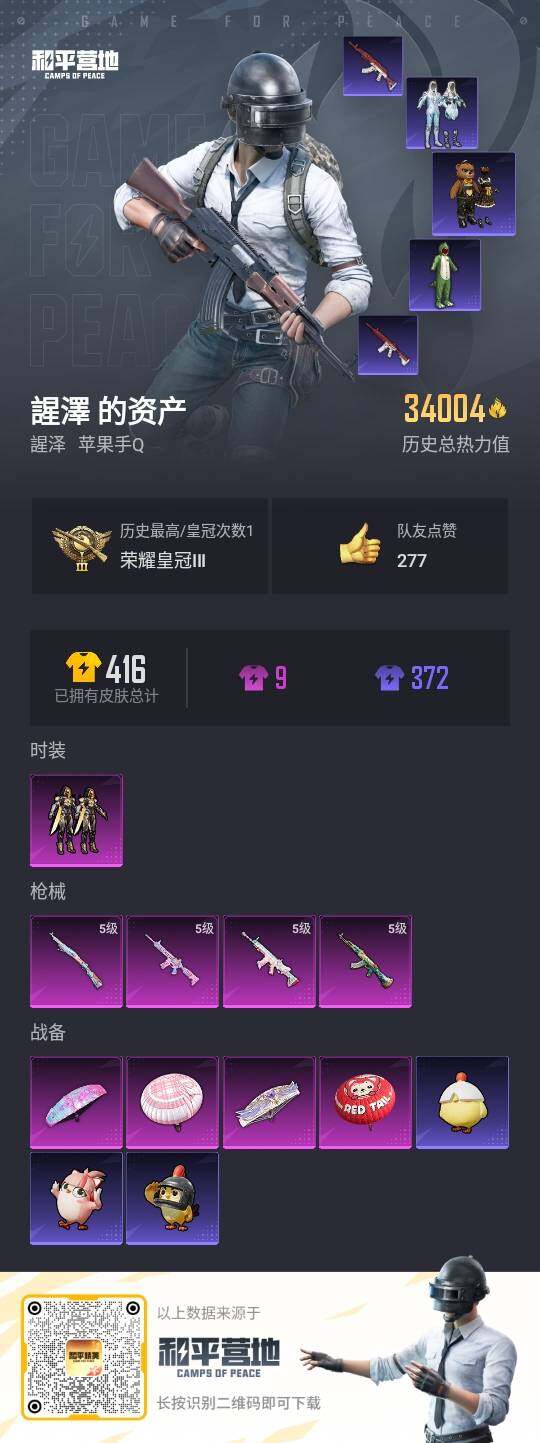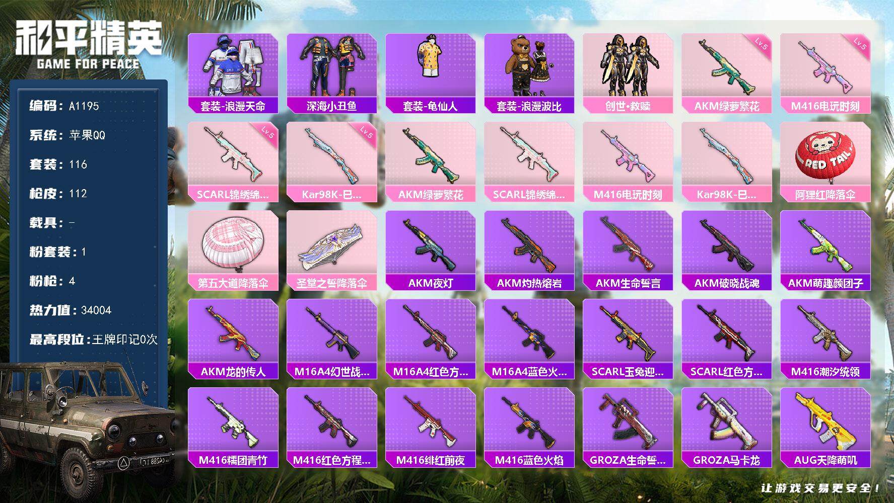 [14640436]苹果 【公主号 浪漫天命/浪漫波比/akm-绿萝繁花五级】手q-1粉装-4特效呛-0载具-0粉色飞行器-34004热力值-1王牌印记-116套装-112呛皮 【热门品类】:套装-浪漫天命,套装-深海小丑鱼,套装-龟仙人,套装-浪漫波比 【粉色套装】:套装-创世·救赎 【粉色呛皮等级】:akm-绿萝繁花五级,scar-l-锦绣绵绵五级,m416-电玩时刻五级,kar98k-巳巳如意五级 【粉色呛皮】:akm-绿萝繁花,scar-l-锦绣绵绵,m416-电玩时刻,kar98k-巳巳如意 【粉色降落伞】:阿狸红降落伞,第五大道降落伞,圣堂之誓降落伞 【稀有套装】:套装-龟仙人 【稀有呛皮】:akm-夜灯,akm-灼热熔岩,akm-生命誓言,akm-破晓战魂,akm-萌趣颜团子,akm-龙的传人,m16a4-幻世战舞者,m16a4-红色方程式,m16a4-蓝色火焰,scar-l-玉兔迎春,scar-l-红色方程式,m416-潮汐统领,m416-糯团青竹,m416-红色方程式,m416-绯红前夜,m416-蓝色火焰,groza-生命誓言,groza-马卡龙,aug-天降萌叽,aug-耀粉歌者,m762-牛气冲天,m762-绯红前夜,m762-镭射皇者,ac-val-快闪甜心,ac-val-闲梦青缨,蜜獾-娇憨猪猪,uzi-娇憨猪猪,uzi-红色方程式,ump45-仲夏莫吉托,ump45-生命誓言,ump45-蓝色火焰,vect-焰鹰斗篷,vect-彩虹符号,vect-生命誓言,汤姆逊-天降萌叽,汤姆逊-耀粉歌者,aks-74u-鬼刀,p90-快闪甜心,m24-冰封烈焰,m24-幻彩电音,awm-焰鹰斗篷,awm-圣堂之誓,sks-炫彩节奏,vss-镭射皇者,mini14-耀粉歌者,mk14-是爱神辣,slr-娇憨猪猪,m417-惊鸿侠骨,mk20-h-快闪甜心,m200-惊鸿侠骨,s686-冰封烈焰,s1897-炫彩节奏,s1897-镭射皇者,s12k-玩趣呆呆,s12k-破晓战魂,s12k-垂柳戏鸭,s12k-娇憨猪猪,s12k-幻世战舞者,dbs-焰鹰斗篷,dbs-彩虹符号,dbs-第五大道,m249-彩虹符号,m249-破晓战魂,m249-镭射皇者,dp-28-焰鹰斗篷,dp-28-彩虹符号,mg3-幻世战舞者,mg3-惊鸿侠骨,p19