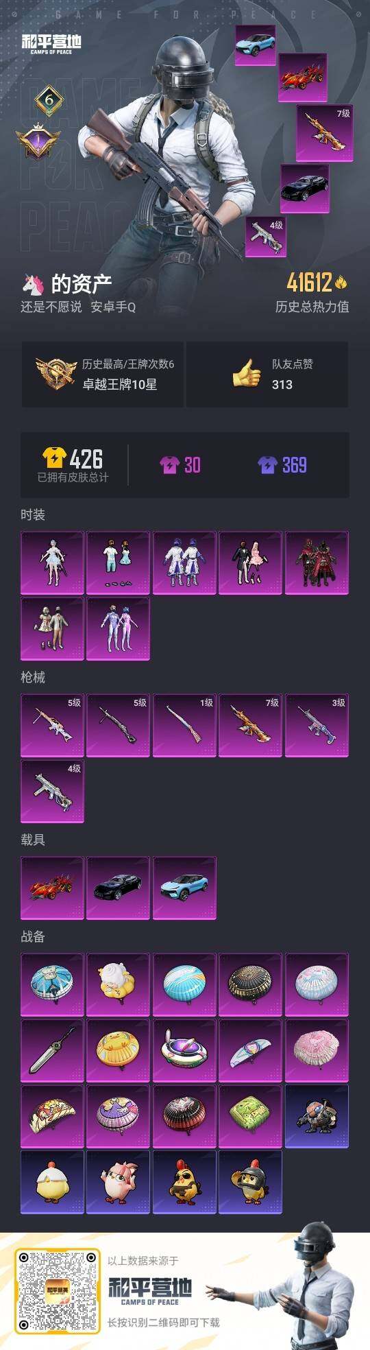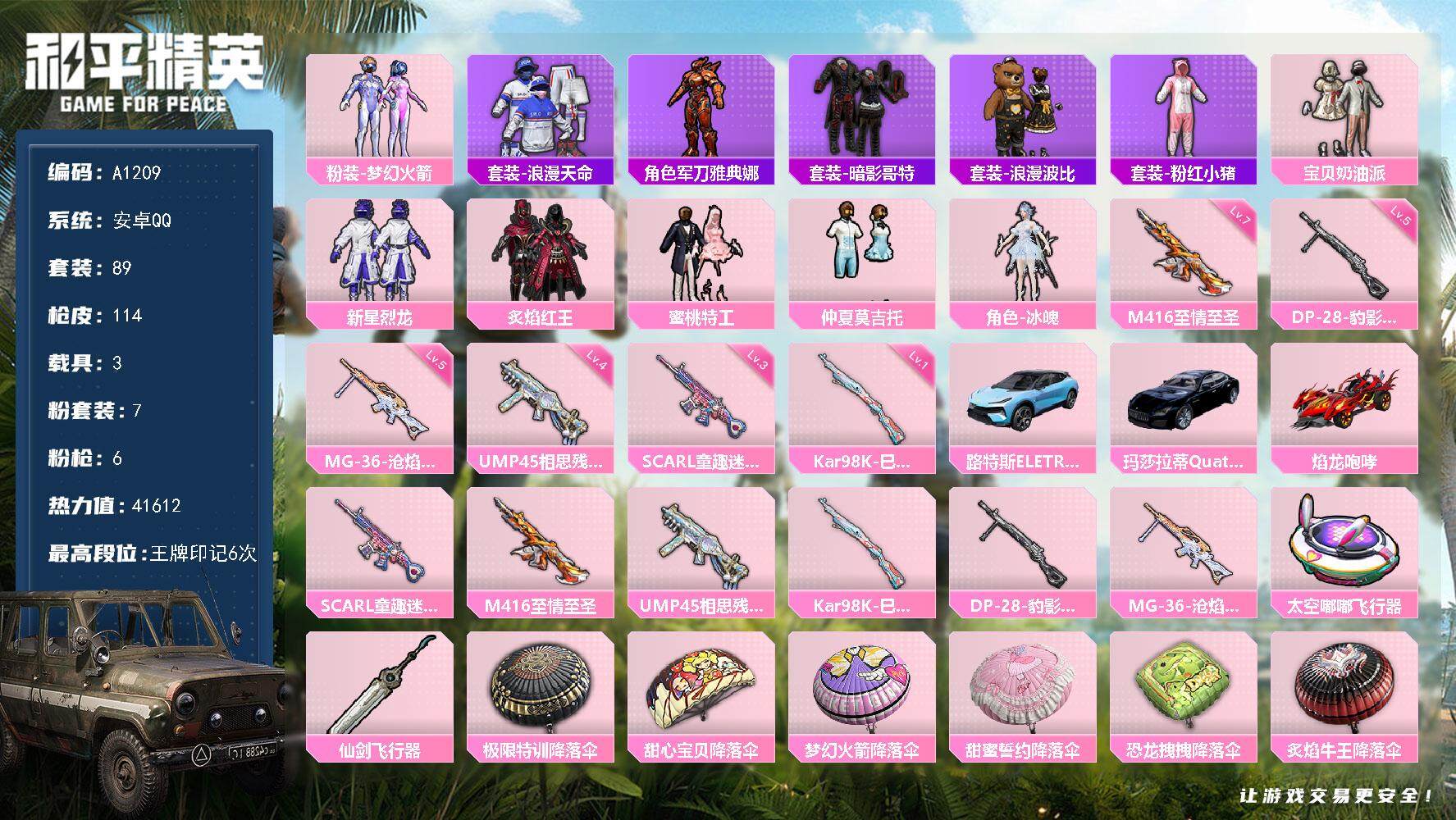 [14647000]安卓 【公主号 梦幻火箭/浪漫天命/浪漫波比/粉红小猪/scar-l-童趣迷兔三级/路特斯eletre(冰川蓝)】手q-7粉装-6特效呛-3载具-2粉色飞行器-41612热力值-6王牌印记-89套装-114呛皮 【热门品类】:粉装-梦幻火箭,套装-浪漫天命,角色-军刀雅典娜,套装-暗影哥特,套装-浪漫波比,套装-粉红小猪 【粉色套装】:粉装-宝贝奶油派,粉装-梦幻火箭,粉装-新星烈龙,粉装-炙焰红王,粉装-蜜桃特工,粉装-仲夏莫吉托,角色-冰魄 【粉色呛皮等级】:scar-l-童趣迷兔三级,m416-至情至圣七级,ump45-相思残雪四级,kar98k-巳巳如意一级,dp-28-豹影疾电五级,mg-36-沧焰双生五级 【粉色载具】:路特斯eletre(冰川蓝),玛莎拉蒂quattropte(夜幕蓝),焰龙咆哮 【粉色呛皮】:scar-l-童趣迷兔,m416-至情至圣,ump45-相思残雪,kar98k-巳巳如意,dp-28-豹影疾电,mg-36-沧焰双生 【粉色飞行器】:太空嘟嘟飞行器,仙剑飞行器 【粉色降落伞】:极限特训降落伞,甜心宝贝降落伞,梦幻火箭降落伞,甜蜜誓约降落伞,恐龙拽拽降落伞,炙焰牛王降落伞,垂柳戏鸭降落伞,太空嘟嘟降落伞,彩虹甜喵降落伞,仲夏莫吉托降落伞,喜羊羊与灰太狼降落伞,异瞳寒姬降落伞 【稀有套装】:套装-朱霞炽焰,套装-凌霄紫焰,套装-擎苍青焰,玩偶服-懒羊羊,角色-紫俏灵猫 【稀有呛皮】:akm-夜灯,akm-彩虹符号,akm-影袭,akm-灼热熔岩,akm-破晓战魂,akm-虎虎生威,akm-霓虹街区,akm-龙的传人,m16a4-幻世战舞者,m16a4-甜心亚梦,scar-l-炫彩节奏,scar-l-玉兔迎春,scar-l-红色方程式,m416-夜灯,m416-暗星紫秘,groza-异彩先驱,groza-影袭,aug-耀粉歌者,q-彩虹符号,q-神秘黑猫,q-飞驰魅影,m762-甜心宝贝,ac-val-天降萌叽,ac-val-甜心亚梦,蜜獾-垂柳戏鸭,蜜獾-娇憨猪猪,arx-凌霄紫焰,uzi-啾咪啾咪,uzi-娇憨猪猪,uzi-影袭,ump45-蓝色火焰,vect-生命誓言,汤姆逊-天降萌叽,汤姆逊-异彩先驱,汤姆逊-炫彩节奏,mp5k-异彩先驱,mp5k-甜蜜誓约,js9-凌霄紫焰,