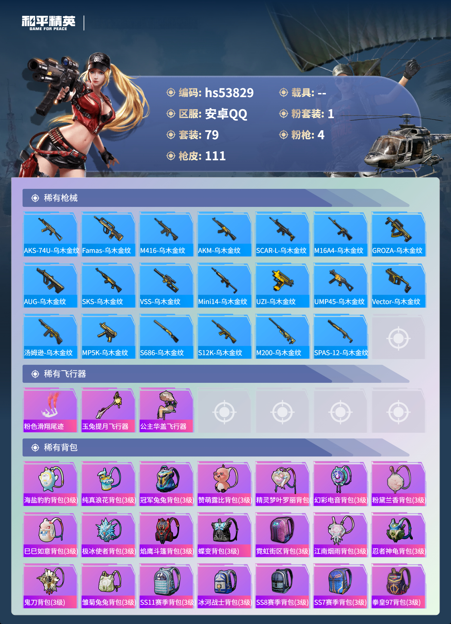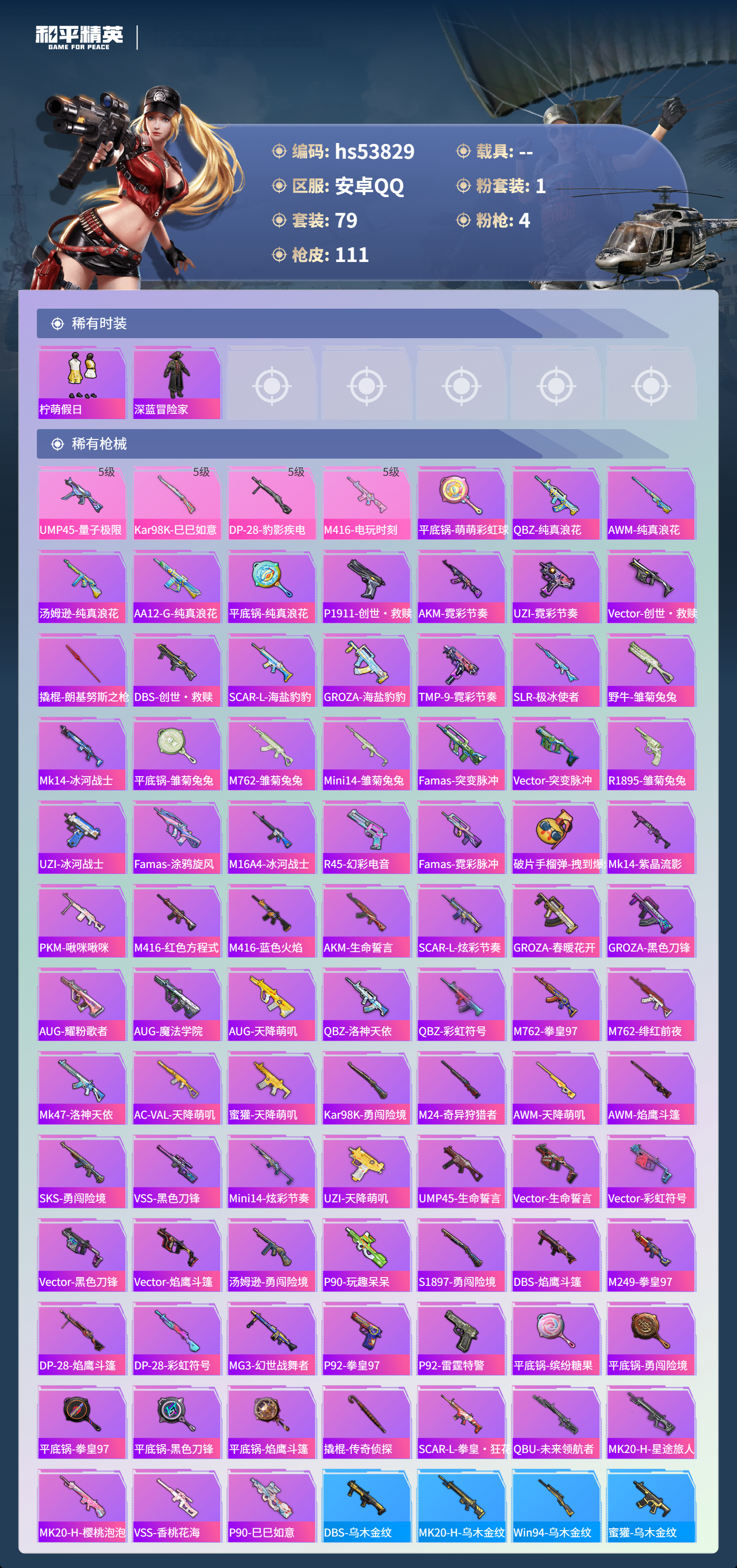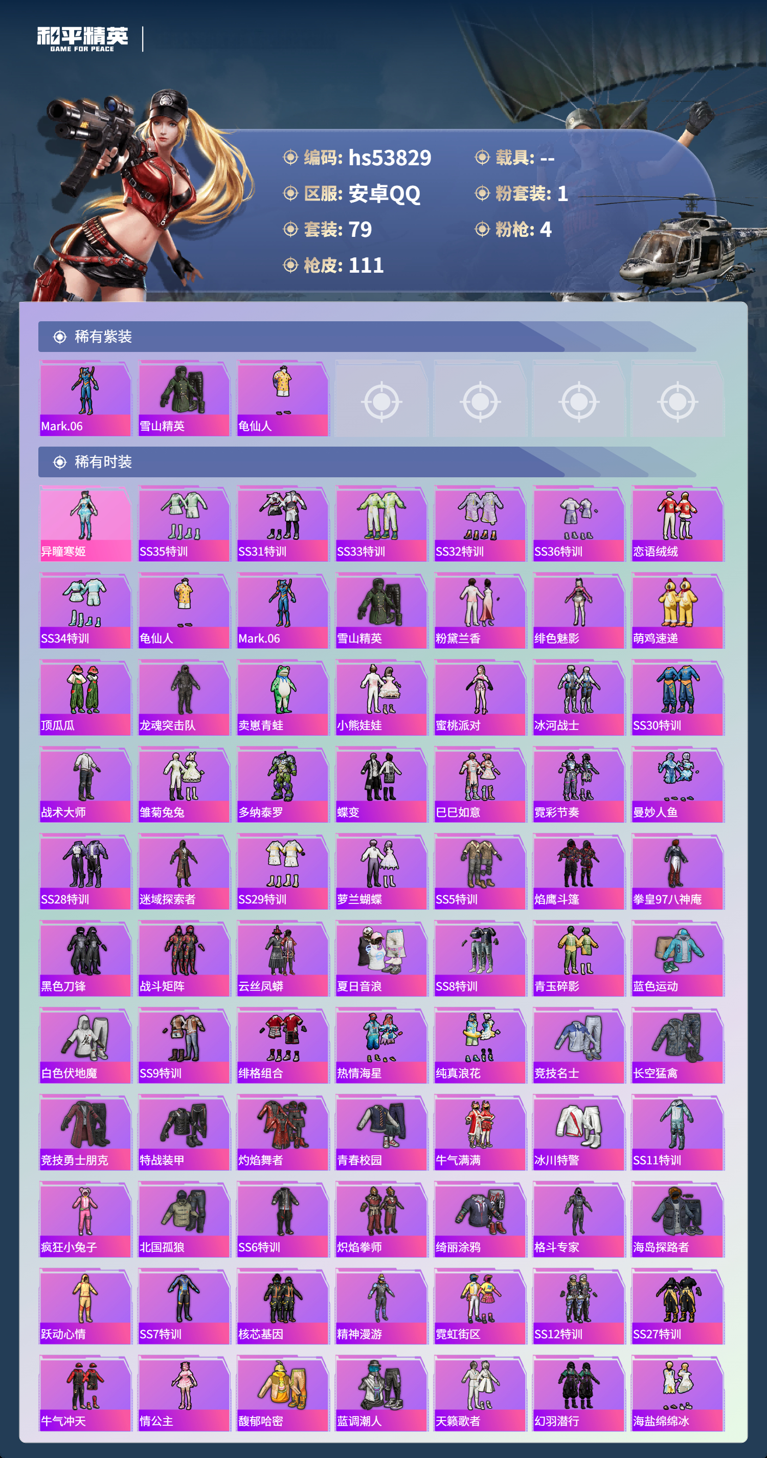 hs53829 安卓手q-5王牌印记-1粉装-4特效呛-31934热力值-79套装-111呛皮-1卓越印记【1粉装】角色-异瞳寒姬【4特效呛】dp-28-豹影疾电/5级m416-电玩时刻/5级ump45-量子极限/5级kar98k-巳巳如意/5级【3稀有紫装】mark.06雪山精英龟仙人【79稀有时装】异瞳寒姬ss35特训ss31特训ss33特训ss32特训ss36特训