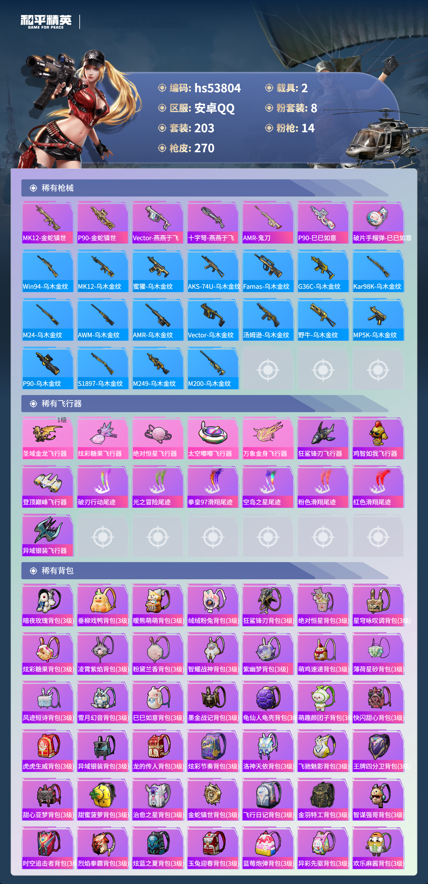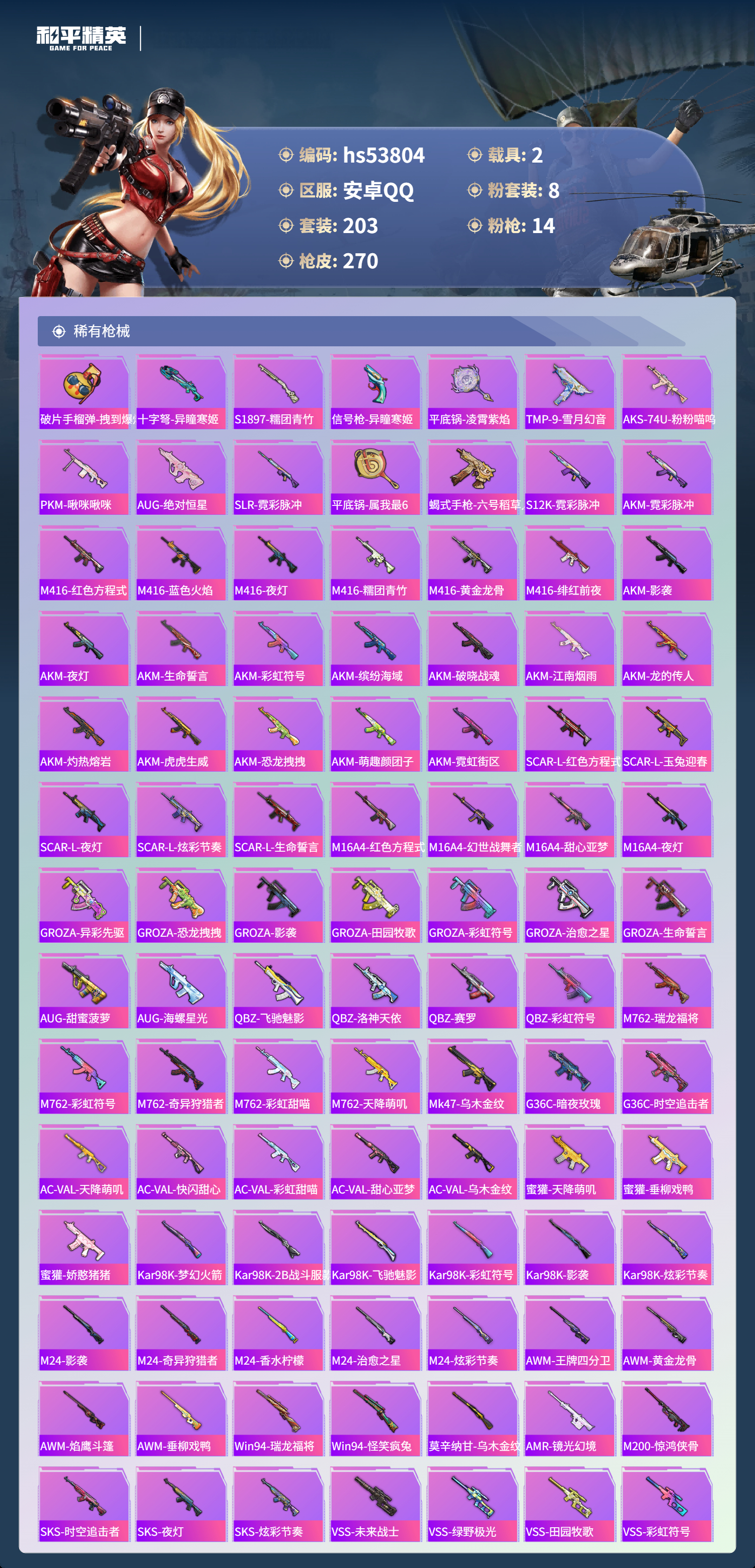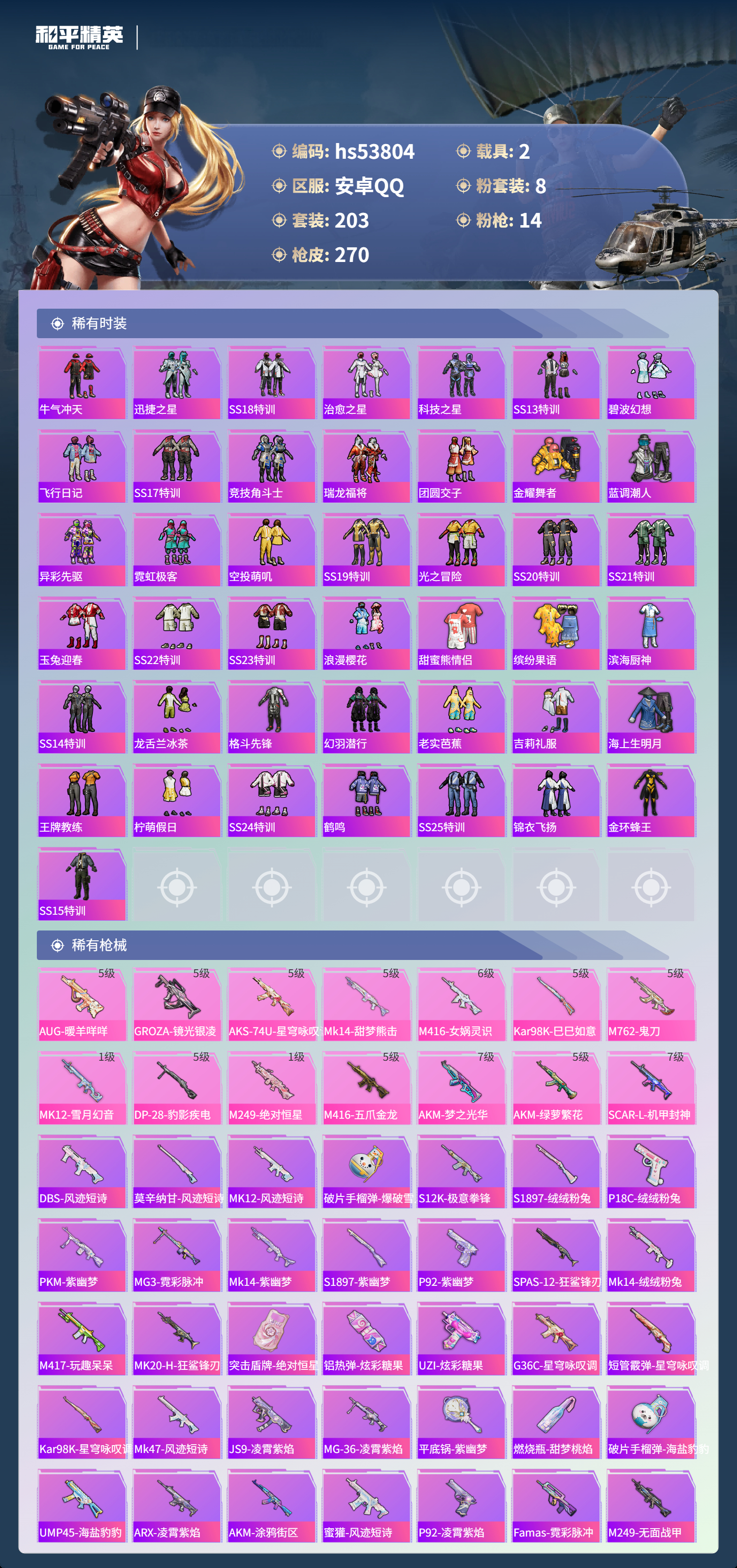 hs53804 安卓手q-21王牌印记-有战神框-8粉装-14特效呛-2载具-90949热力值-203套装-270呛皮-5卓越印记-2传奇印记【8粉装】套装-雪月幻音角色-女娲灵识套装-恐龙拽拽套装-极限特训角色-绝对恒星套装-星穹咏叹调套装-暗夜鎏金套装-海螺星光【14特效呛】m249-绝对恒星/1级akm-绿萝繁花/5级mk14-甜梦熊击/5级groza-镜光银凌/5级