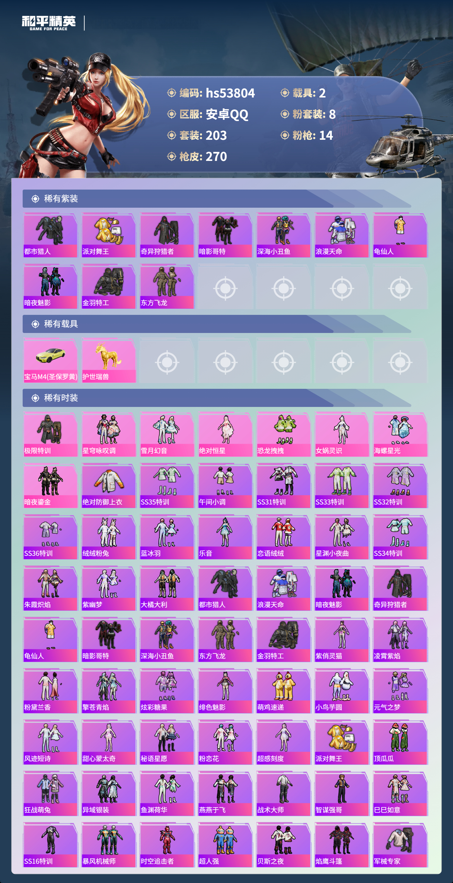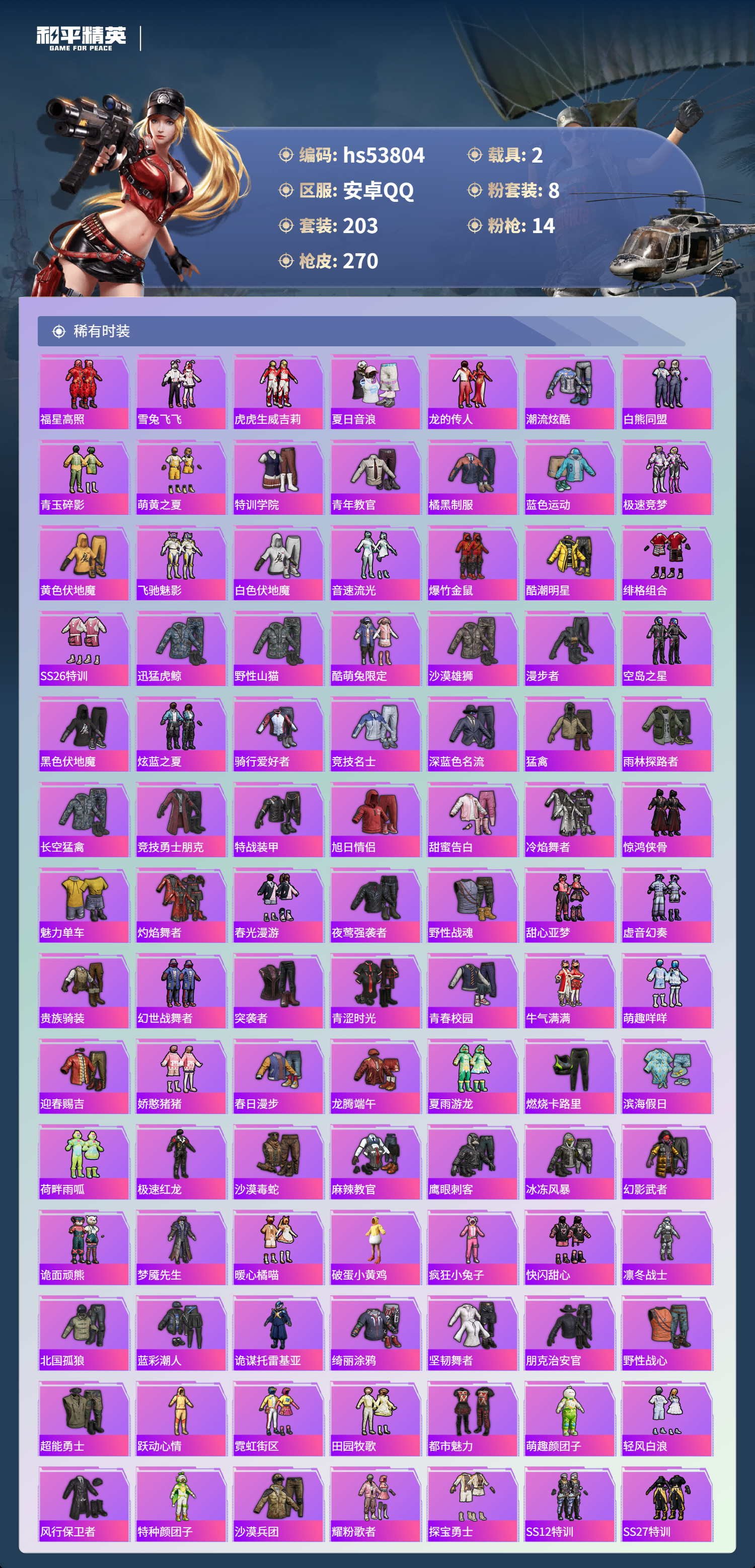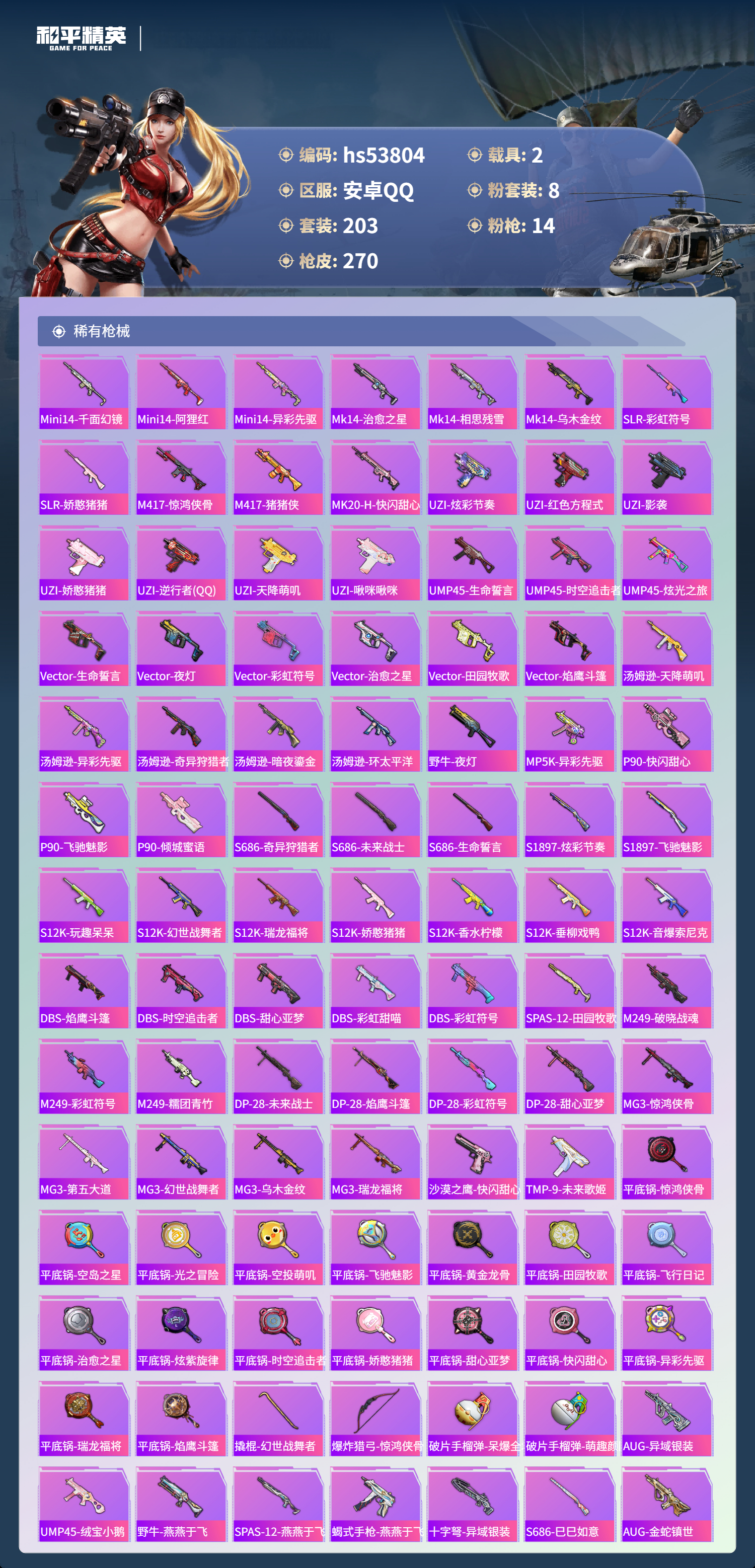 hs53804 安卓手q-21王牌印记-有战神框-8粉装-14特效呛-2载具-90949热力值-203套装-270呛皮-5卓越印记-2传奇印记【8粉装】套装-雪月幻音角色-女娲灵识套装-恐龙拽拽套装-极限特训角色-绝对恒星套装-星穹咏叹调套装-暗夜鎏金套装-海螺星光【14特效呛】m249-绝对恒星/1级akm-绿萝繁花/5级mk14-甜梦熊击/5级groza-镜光银凌/5级