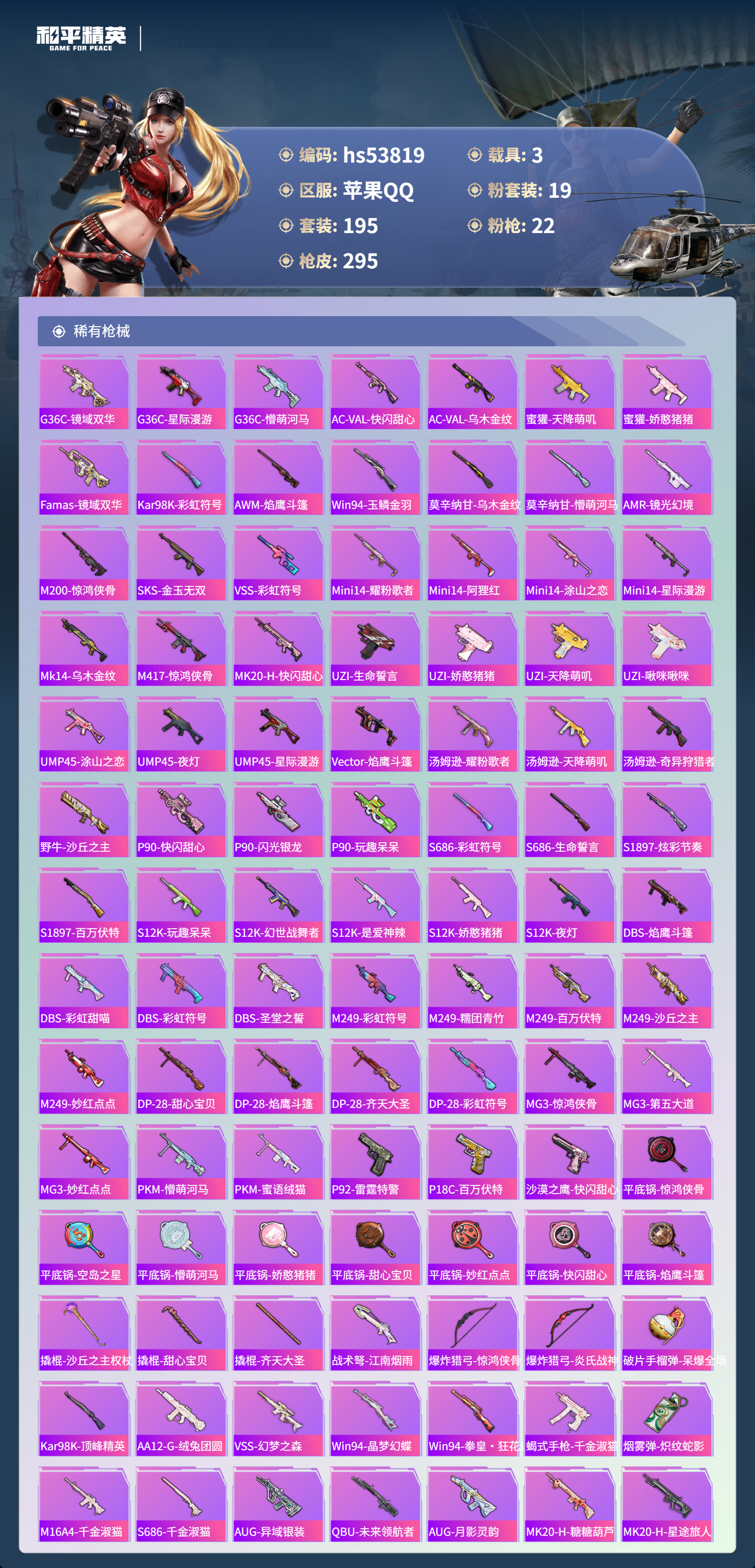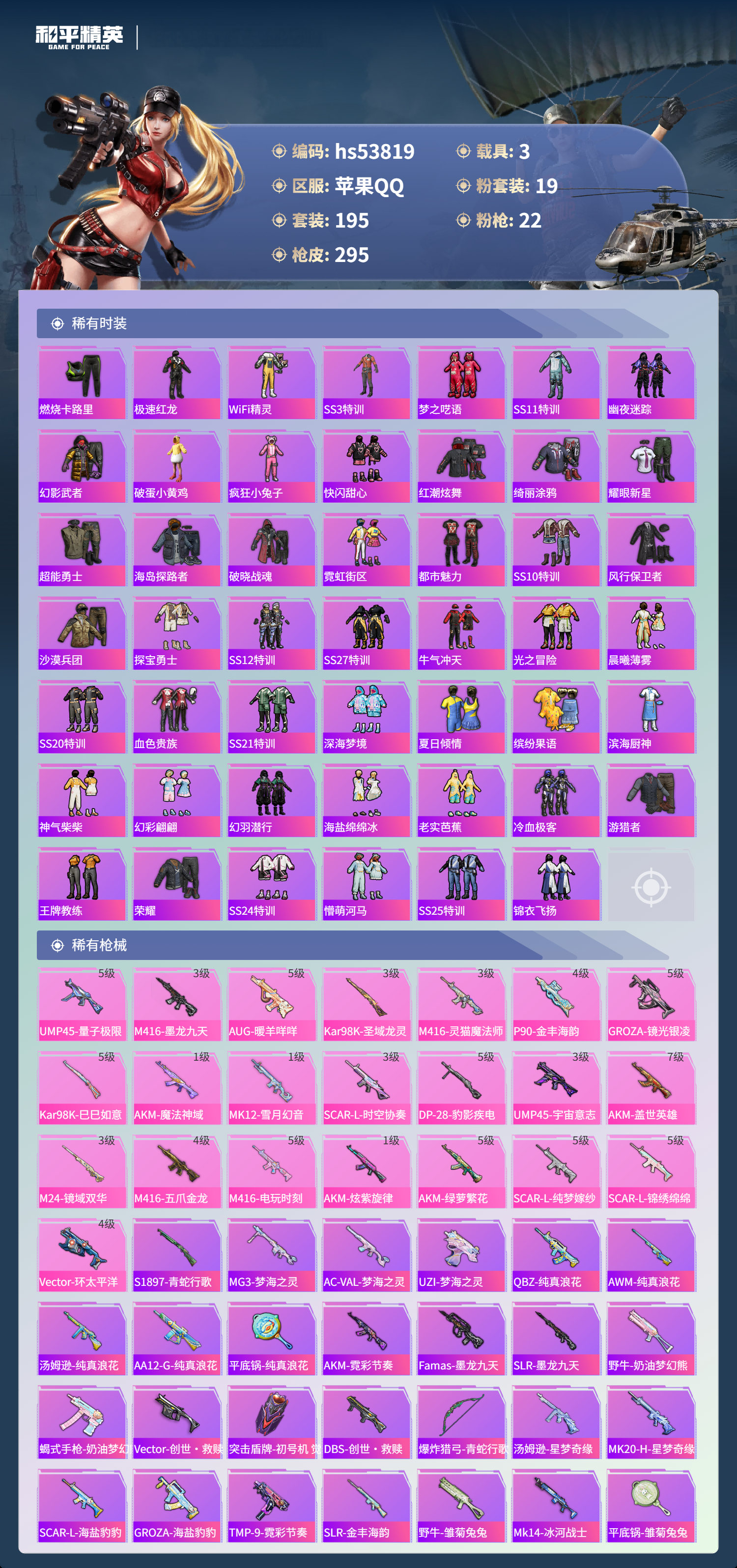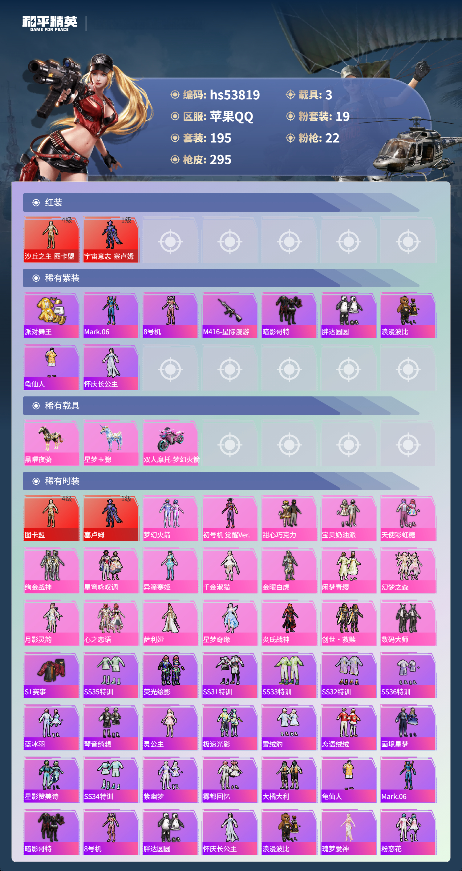 hs53819 苹果手q-13王牌印记-有战神框-2红装-19粉装-22特效呛-3载具-热力值-195套装-295呛皮-7卓越印记-6传奇印记【2红装】宇宙意志-塞卢姆/1级沙丘之主-图卡盟/4级【19粉装】套装-金曜白虎套装-宝贝奶油派套装-心之恋语角色-千金淑猫套装-梦幻火箭套装-幻梦之森套装-闲梦青缨套装-星穹咏叹调角色-萨利娅角色-月影灵韵角色-异瞳寒