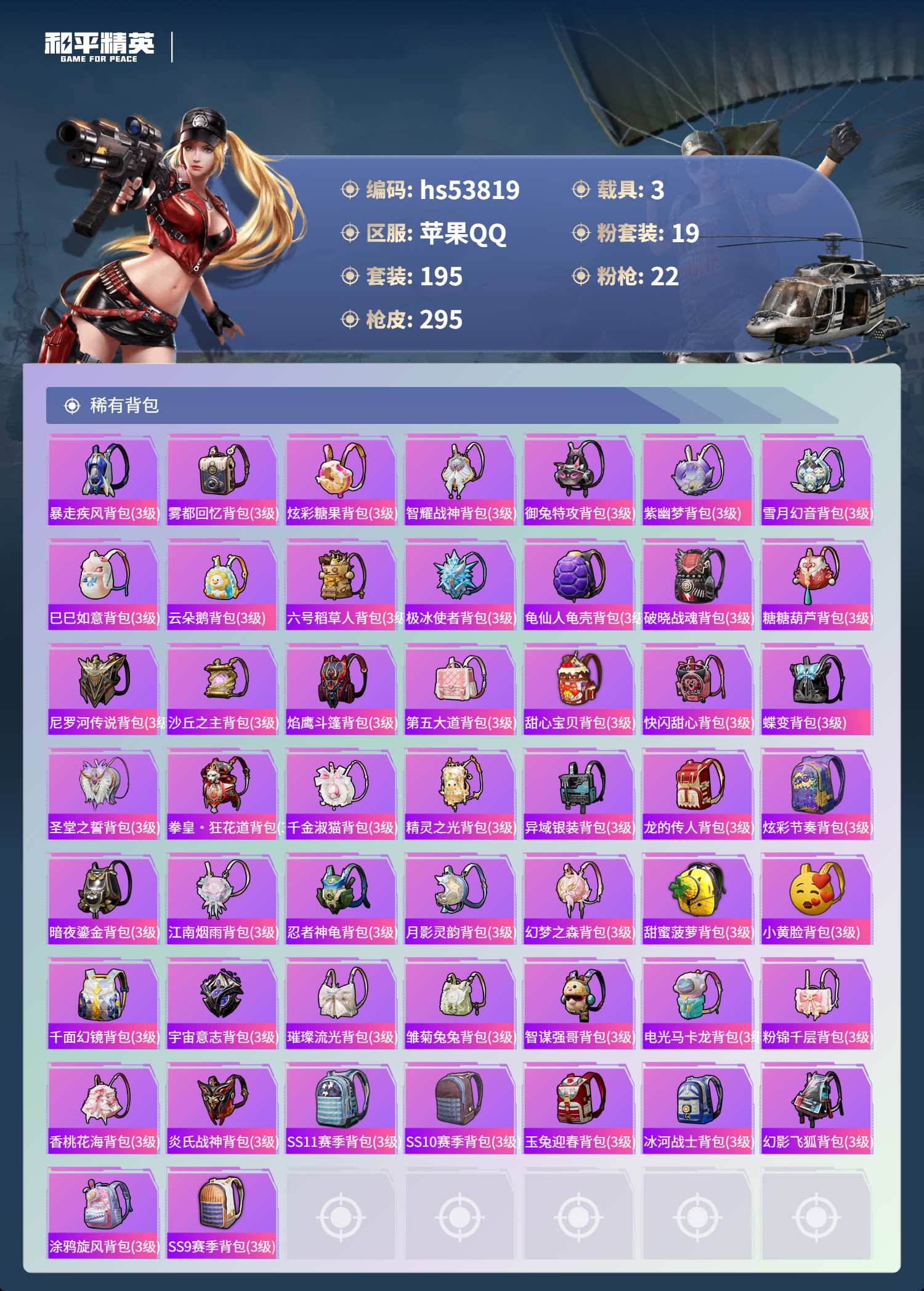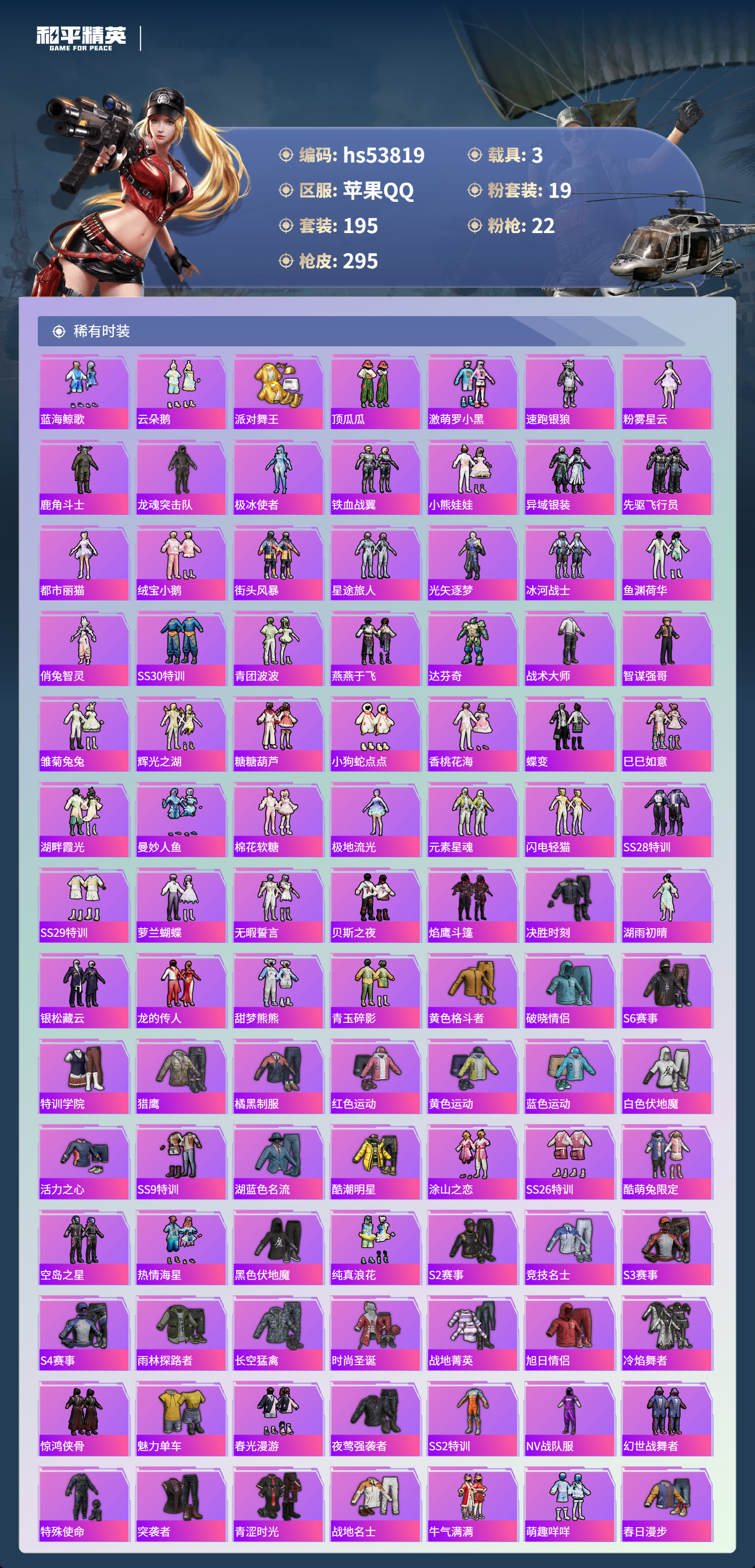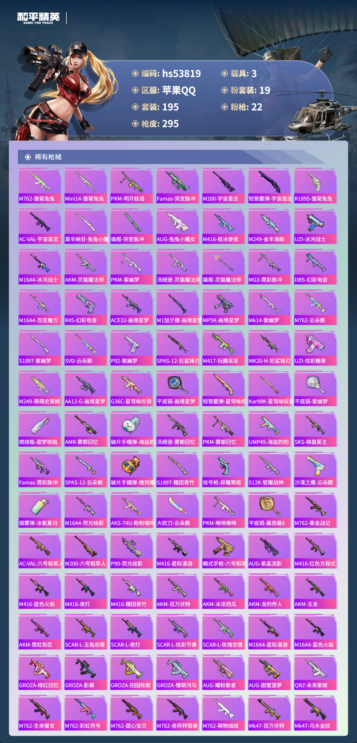 hs53819 苹果手q-13王牌印记-有战神框-2红装-19粉装-22特效呛-3载具-热力值-195套装-295呛皮-7卓越印记-6传奇印记【2红装】宇宙意志-塞卢姆/1级沙丘之主-图卡盟/4级【19粉装】套装-金曜白虎套装-宝贝奶油派套装-心之恋语角色-千金淑猫套装-梦幻火箭套装-幻梦之森套装-闲梦青缨套装-星穹咏叹调角色-萨利娅角色-月影灵韵角色-异瞳寒