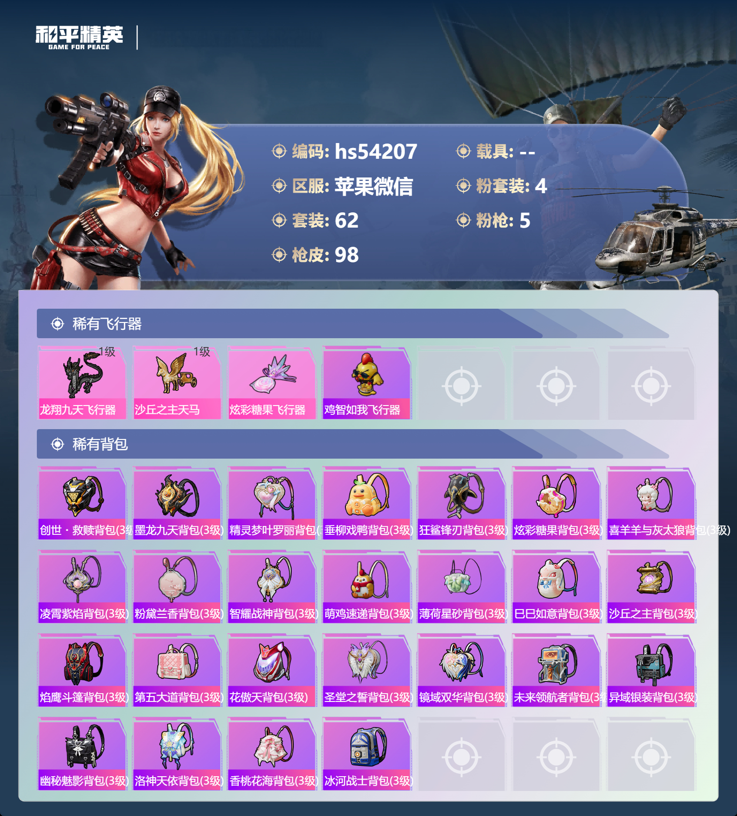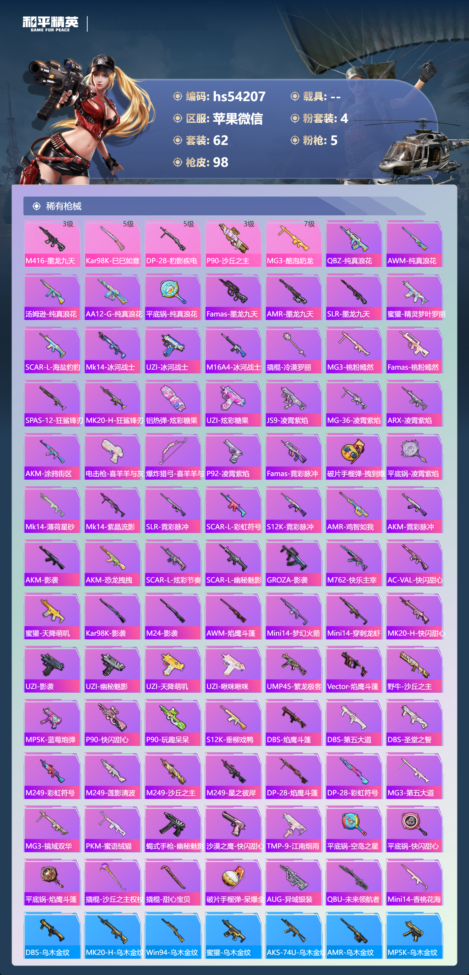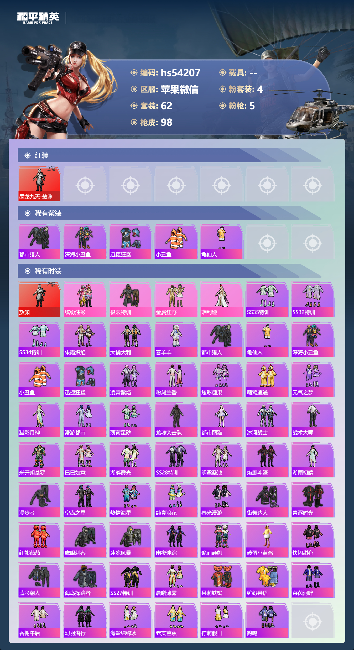 hs54207 苹果微信-1王牌印记-1红装-4粉装-5特效呛-33596热力值-62套装-98呛皮【1红装】墨龙九天-敖渊/2级【4粉装】套装-极限特训套装-缤纷油彩角色-萨利娅套装-金属狂野【5特效呛】mg3-酷泡奶龙/7级dp-28-豹影疾电/5级p90-沙丘之主/3级m416-墨龙九天/3级kar98k-巳巳如意/5级【5稀有紫装】都市猎人深海小丑鱼迅捷狂鲨小丑
