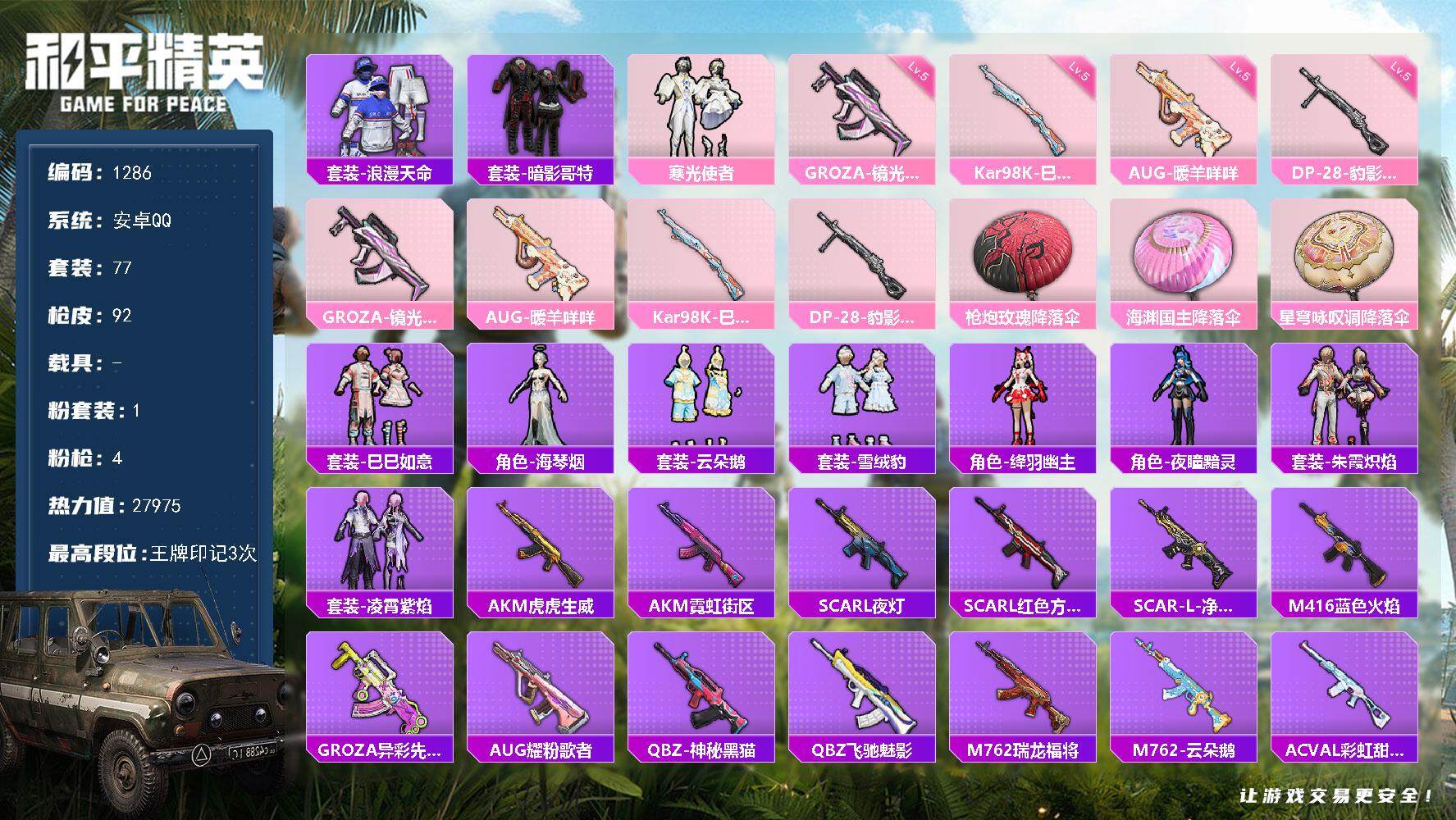0载具-77套装-92呛皮-77套装/呛械4/装备85/战备76/王牌印记3/热力值27975/五级groza-镜光银凌/五级aug-暖羊咩咩/五级kar98k-巳巳如意/五级dp-28-豹影疾电/套装-浪漫天命/套装-暗影哥特/寒光使者/groza-镜光银凌/aug-暖羊咩咩/kar98k-巳巳如意/dp-28-豹影疾电/呛炮玫瑰降落伞/海渊国主降落伞/星穹咏叹调降落伞/巳巳如意/海琴烟/套装-云朵鹅/套装-雪绒豹/角