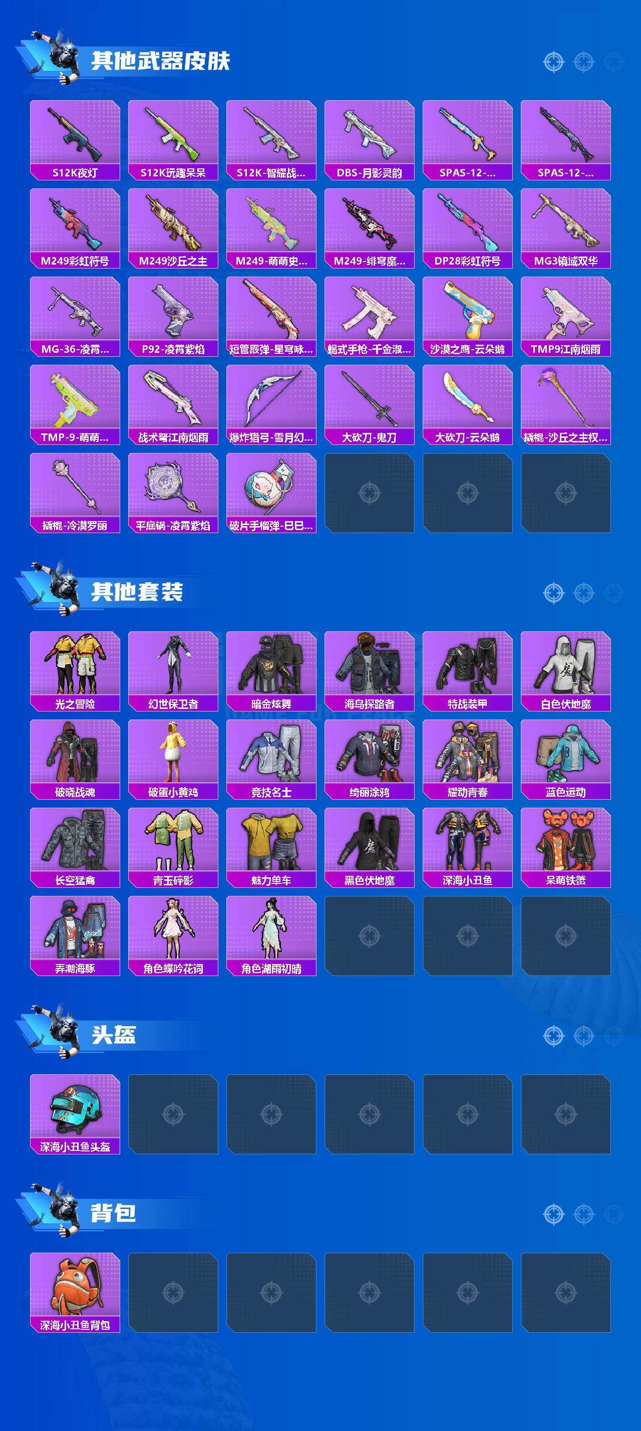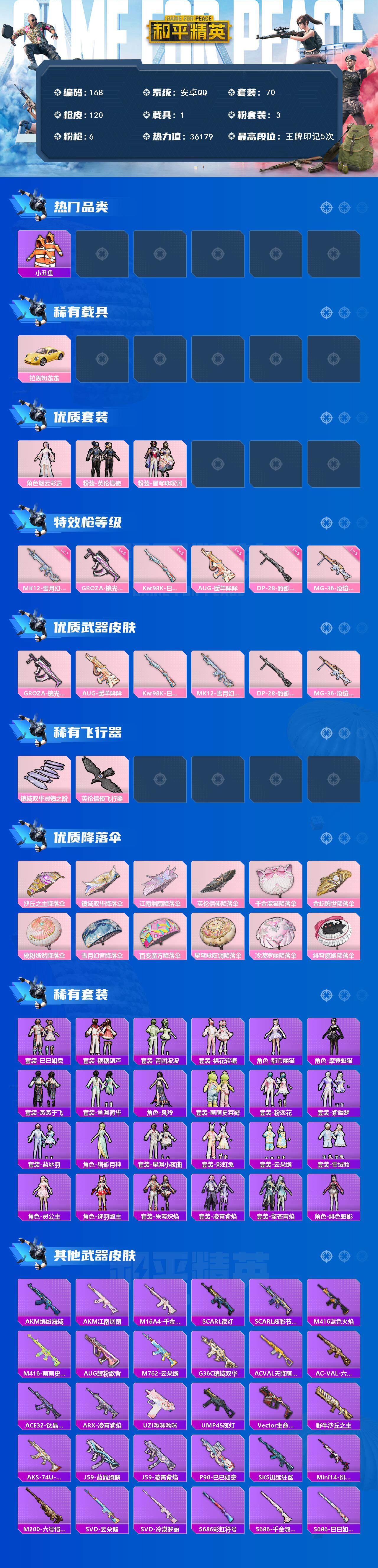 [14627362]安卓 手q-3粉装-6特效呛-1载具-3粉色飞行器-36179热力值-5王牌印记-70套装-120呛皮 【热门品类】:套装-深海小丑鱼,套装-小丑鱼 【粉色载具】:拉轰奶龙龙 【粉色套装】:角色-烟云彩露,粉装-英伦信使,粉装-星穹咏叹调 【粉色呛皮等级】:groza-镜光银凌五级,aug-暖羊咩咩五级,kar98k-巳巳如意五级,mk12-雪月幻音七级,dp-28-豹影疾电五级,mg-36-沧焰双生五级 【粉色呛皮】:groza-镜光银凌,aug-暖羊咩咩,kar98k-巳巳如意,mk12-雪月幻音,dp-28-豹影疾电,mg-36-沧焰双生 【粉色飞行器】:镜域双华-灵镜之阶,英伦信使飞行器 【粉色降落伞】:沙丘之主降落伞,镜域双华降落伞,江南烟雨降落伞,英伦信使降落伞,千金淑猫降落伞,金蛇镇世降落伞,桃粉嫣然降落伞,雪月幻音降落伞,百变魔方降落伞,星穹咏叹调降落伞,冷漠罗丽降落伞,绯穹魔姬降落伞 【稀有套装】:套装-巳巳如意,套装-糖糖葫芦,套装-青团波波,套装-棉花软糖,角色-都市丽猫,角色-摩登魅猫,套装-燕燕于飞,套装-鱼渊荷华,角色-风玲,套装-萌萌史莱姆,套装-粉恋花,套装-紫幽梦,套装-蓝冰羽,角色-猎影月神,套装-星渊小夜曲,套装-彩虹兔,套装-云朵鹅,套装-雪绒豹,角色-灵公主,角色-绛羽幽主,套装-朱霞炽焰,套装-凌霄紫焰,套装-擎苍青焰,角色-绯色魅影 【稀有呛皮】:m79短管留单-钛晶裂爪,akm-江南烟雨,akm-缤纷海域,m16a4-千金淑猫,scar-l-夜灯,scar-l-炫彩节奏,m416-蓝色火焰,m416-萌萌史莱姆,aug-耀粉歌者,m762-云朵鹅,g36c-镜域双华,ac-val-天降萌叽,ac-val-六号稻草人,ace32-钛晶裂爪,arx-凌霄紫焰,uzi-啾咪啾咪,ump45-夜灯,vect-生命誓言,野牛-沙丘之主,aks-74u-鬼刀,js9-凌霄紫焰,js9-蓝晶绮麟,p90-巳巳如意,sks-迅猛狂鲨,mini14-绯穹魔姬,m200-六号稻草人,svd-云朵鹅,svd-冷漠罗丽,s686-彩虹符号,s686-巳巳如意,s686-千金淑猫,s12k-玩趣呆呆,s12k-夜灯,s12k-智耀战神,dbs-月影灵韵,spas-12-钛晶裂爪,spas-12-云朵鹅,m249-彩