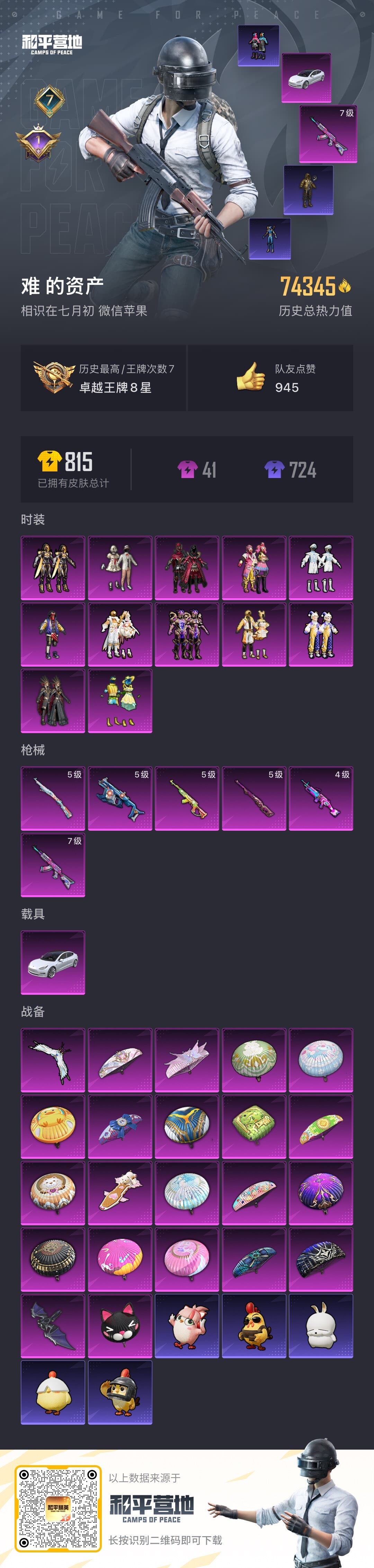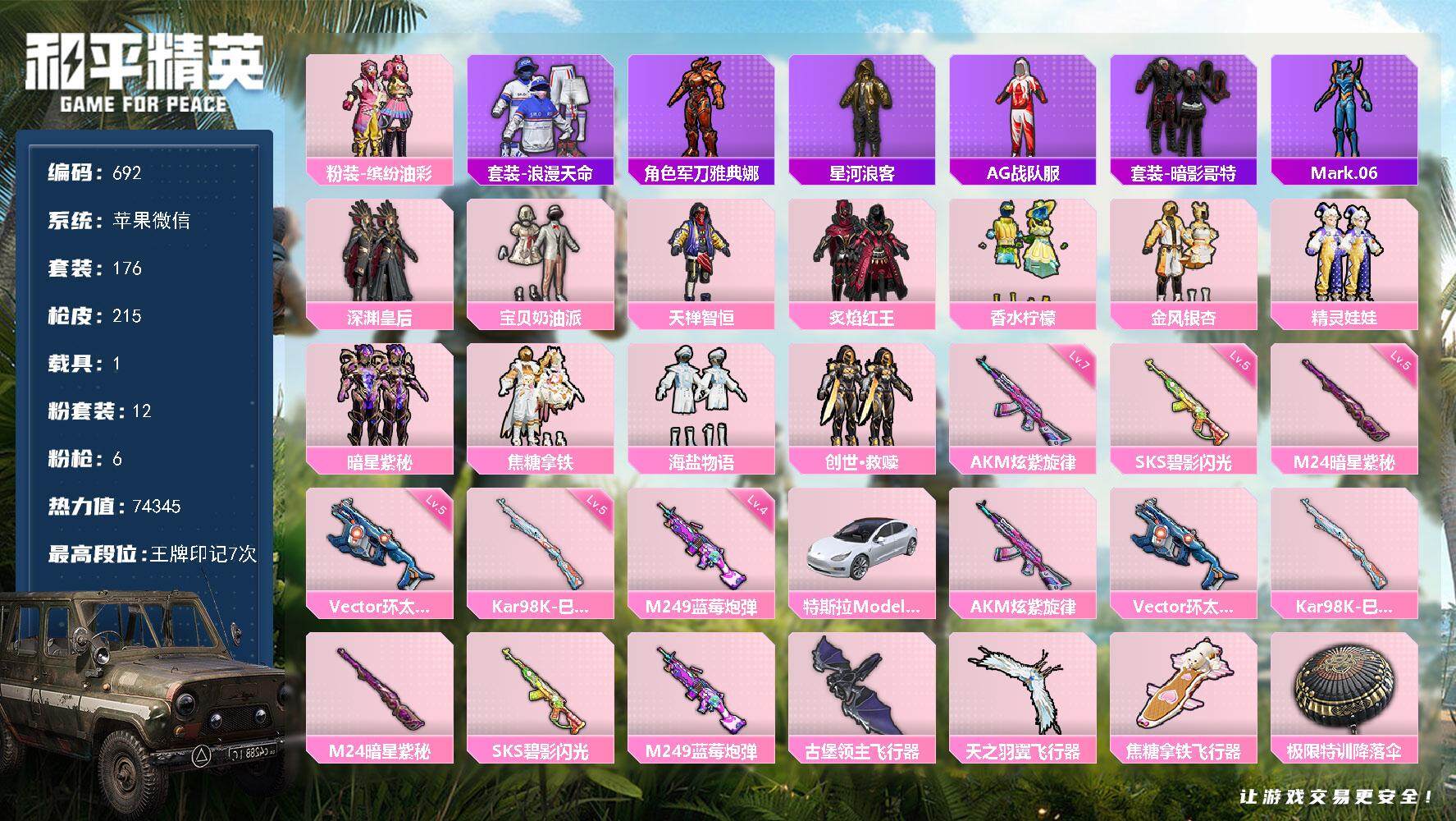 [14754982]苹果 微信-12粉装-6特效呛-1载具-3粉色飞行器-74345热力值-7王牌印记-176套装-215呛皮 【热门品类】:粉装-缤纷油彩,套装-浪漫天命,角色-军刀雅典娜,套装-星河浪客,套装-ag战队服,套装-暗影哥特,角色-mark.06 【粉色套装】:粉装-深渊皇后,粉装-宝贝奶油派,粉装-缤纷油彩,粉装-天禅智恒,粉装-炙焰红王,粉装-香水柠檬,粉装-金风银杏,粉装-精灵娃娃,粉装-暗星紫秘,粉装-焦糖拿铁,粉装-海盐物语,套装-创世·救赎 【粉色呛皮等级】:akm-炫紫旋律七级,vect-环太平洋五级,kar98k-巳巳如意五级,m24-暗星紫秘五级,sks-碧影闪光五级,m249-蓝莓炮弹四级 【粉色载具】:特斯拉model 3(珍珠白) 【粉色呛皮】:akm-炫紫旋律,vect-环太平洋,kar98k-巳巳如意,m24-暗星紫秘,sks-碧影闪光,m249-蓝莓炮弹 【粉色飞行器】:古堡领主飞行器,天之羽翼飞行器,焦糖拿铁飞行器 【粉色降落伞】:极限特训降落伞,神秘黑猫降落伞,古堡领主降落伞,童趣迷兔降落伞,暗夜玫瑰降落伞,海渊国主降落伞,蓝莓炮弹降落伞,甜心娃娃降落伞,暗星紫秘降落伞,天之羽翼降落伞,焦糖拿铁降落伞,碧影闪光降落伞,恐龙拽拽降落伞,环太平洋降落伞,垂柳戏鸭降落伞,彩虹甜喵降落伞,闲梦青缨降落伞,江南烟雨降落伞,精灵梦叶罗丽降落伞 【稀有套装】:套装-巳巳如意,角色-风玲 【稀有呛皮】:akm-夜灯,akm-彩虹符号,akm-影袭,akm-萌趣颜团子,akm-虎虎生威,akm-霓虹街区,akm-龙的传人,m16a4-幻世战舞者,m16a4-机械英豪,m16a4-甜心亚梦,scar-l-夜灯,scar-l-炫彩节奏,scar-l-玉兔迎春,scar-l-碧影闪光,scar-l-红色方程式,m416-暗星紫秘,m416-糯团青竹,m416-罗小黑,m416-蓝色火焰,groza-异彩先驱,groza-彩虹符号,groza-影袭,groza-恐龙拽拽,groza-治愈之星,groza-生命誓言,groza-蓝莓炮弹,aug-2p战斗服款,aug-天降萌叽,aug-流星咚咚,q-原初圣火,q-彩虹符号,q-飞驰魅影,m762-天降萌叽,m762-暖熊萌萌,m762-牛气冲天,m762-瑞龙福将,g3