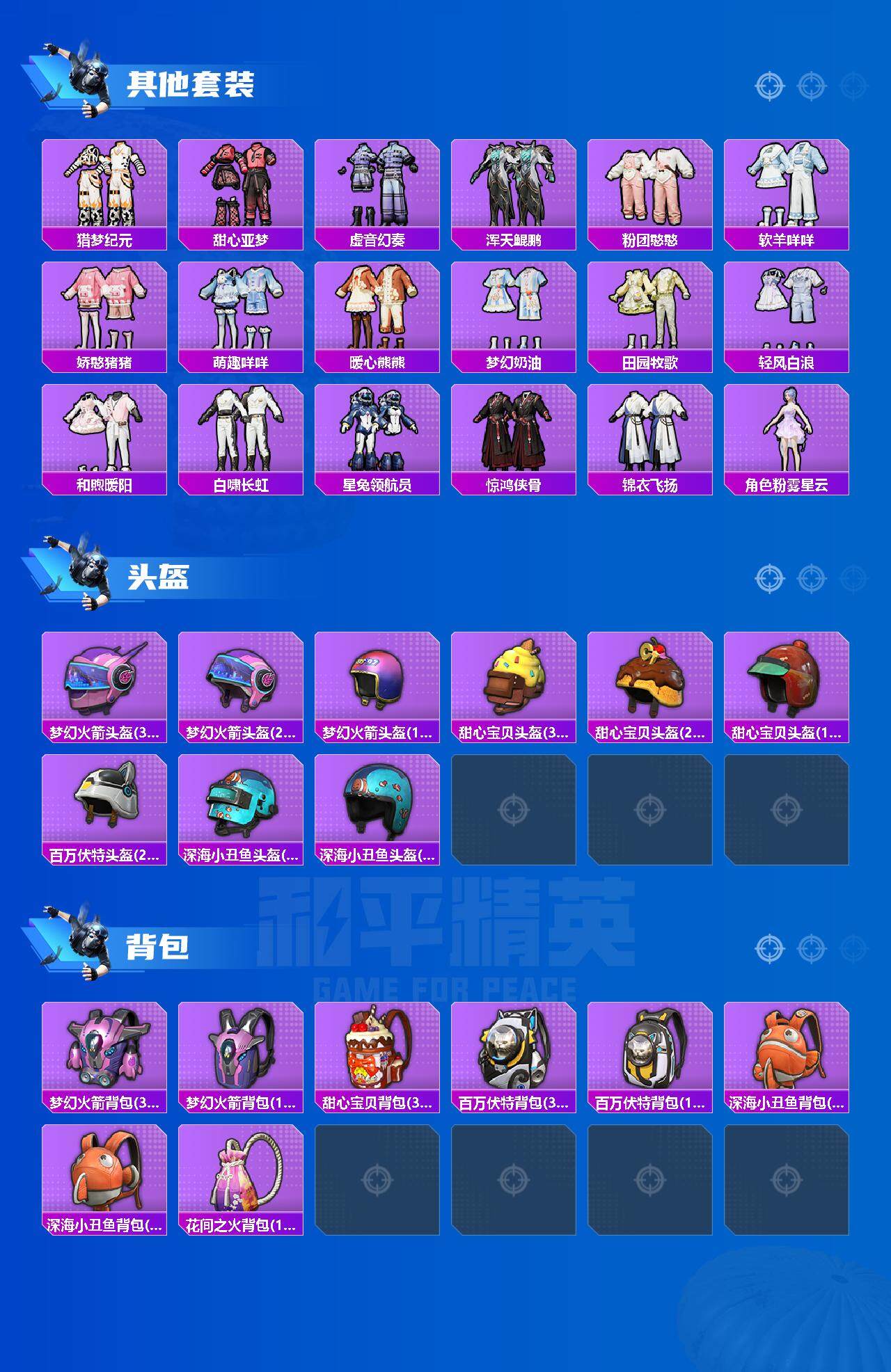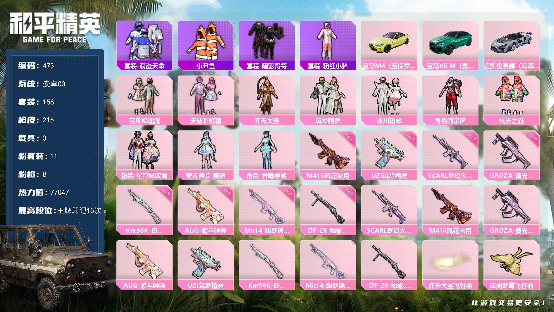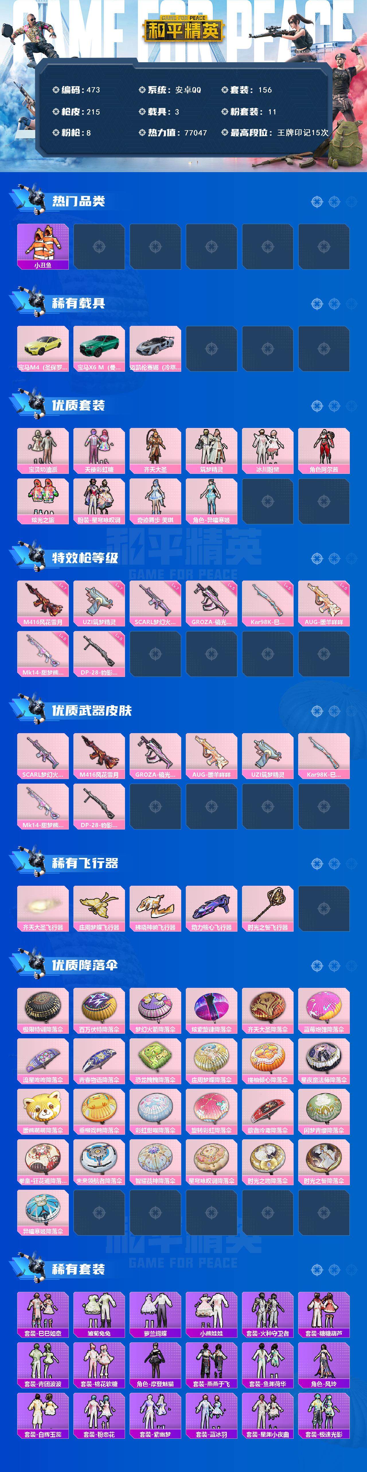 [14754998]安卓 手q-11粉装-8特效呛-3载具-6粉色飞行器-77047热力值-15王牌印记-156套装-215呛皮 【热门品类】:套装-浪漫天命,套装-小丑鱼,套装-暗影哥特,套装-粉红小猪 【粉色载具】:宝马m4(圣保罗黄),宝马x6 m(曼岛绿),迈凯伦塞纳(冷萃蓝) 【粉色套装】:粉装-宝贝奶油派,粉装-天使彩虹糖,粉装-齐天大圣,粉装-筑梦精灵,粉装-冰川粉黛,角色-阿尔茜,粉装-炫光之旅,粉装-星穹咏叹调,角色-奇迹舞步 美琪,角色-异瞳寒姬 【粉色呛皮等级】:scar-l-梦幻火箭七级,m416-风花雪月七级,groza-镜光银凌五级,aug-暖羊咩咩五级,uzi-筑梦精灵七级,kar98k-巳巳如意五级,mk14-甜梦熊击五级,dp-28-豹影疾电五级 【粉色呛皮】:scar-l-梦幻火箭,m416-风花雪月,groza-镜光银凌,aug-暖羊咩咩,uzi-筑梦精灵,kar98k-巳巳如意,mk14-甜梦熊击,dp-28-豹影疾电 【粉色飞行器】:齐天大圣飞行器,庄周梦蝶飞行器,拂晓神骑飞行器,动力核心飞行器,时光之誓飞行器 【粉色降落伞】:极限特训降落伞,百万伏特降落伞,梦幻火箭降落伞,炫紫旋律降落伞,齐天大圣降落伞,蓝莓炮弹降落伞,流星咚咚降落伞,青春物语降落伞,恐龙拽拽降落伞,庄周梦蝶降落伞,橘柚倾心降落伞,星夜魔法师降落伞,暖熊萌萌降落伞,垂柳戏鸭降落伞,彩虹甜喵降落伞,旋转彩虹降落伞,歌者泠鸢降落伞,闲梦青缨降落伞,拳皇·狂花道降落伞,未来领航者降落伞,智耀战神降落伞,星穹咏叹调降落伞,时光之吻降落伞,时光之誓降落伞,异瞳寒姬降落伞 【稀有套装】:套装-巳巳如意,套装-雏菊兔兔,套装-萝兰蝴蝶,套装-小熊娃娃,套装-火种守卫者,套装-糖糖葫芦,套装-青团波波,套装-棉花软糖,角色-摩登魅猫,套装-燕燕于飞,套装-鱼渊荷华,角色-风玲,套装-白辉玉蕊,套装-粉恋花,套装-紫幽梦,套装-蓝冰羽,套装-星渊小夜曲,套装-极速光影,套装-彩虹兔,套装-云朵鹅,套装-雪绒豹,角色-绯色魅影,角色-紫俏灵猫,套装-炫彩糖果 【稀有呛皮】:aug-冰晶雪宝,akm-夜灯,akm-彩虹符号,akm-星之彼岸,akm-缤纷海域,akm-虎虎生威,akm-霓虹街区,akm-龙的传人,m16a4-幻世战舞者,m16a4-甜心亚梦,m16
