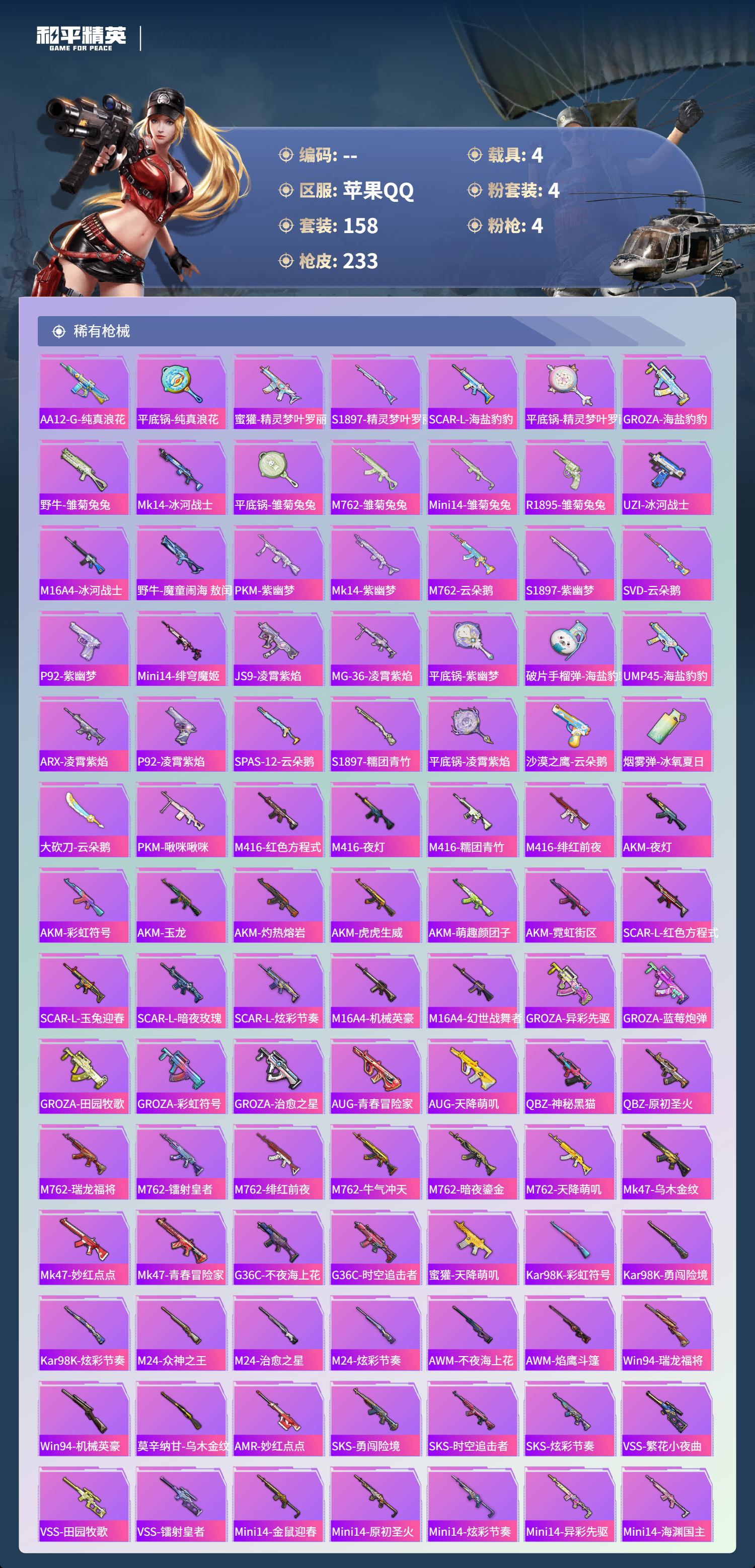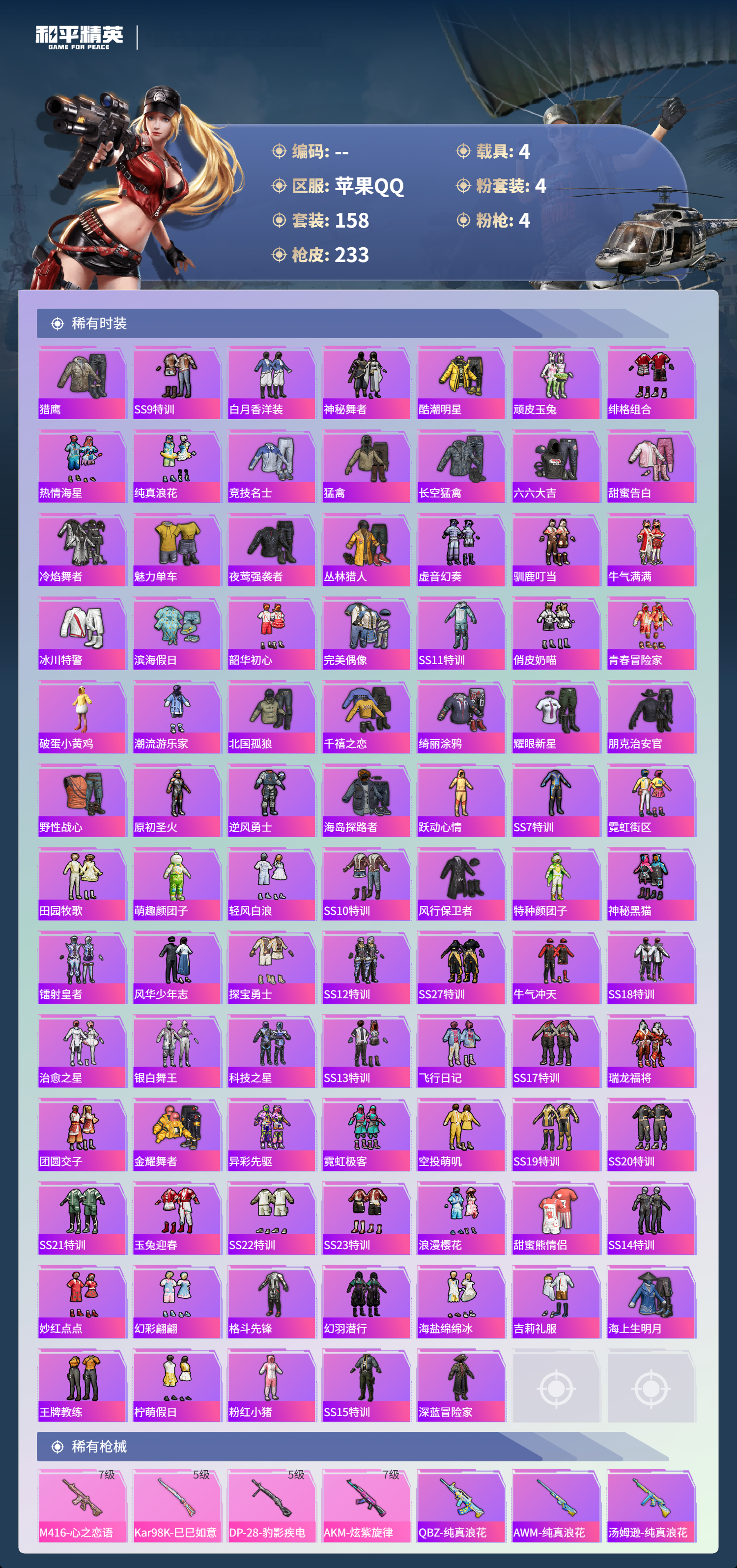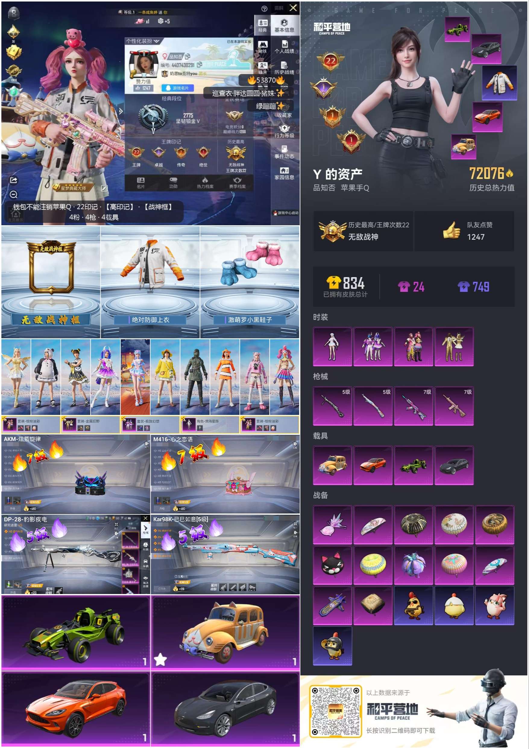 hs53870 苹果手q-22王牌印记-有战神框-4粉装-4特效呛-4载具-72076热力值-158套装-233呛皮-1卓越印记-1传奇印记【4粉装】套装-极致幻想套装-缤纷油彩角色-荧海星豚套装-金属狂野【4特效呛】akm-炫紫旋律/7级m416-心之恋语/7级dp-28-豹影疾电/5级kar98k-巳巳如意/5级【5稀有紫装】巡查衣雪山精英胖达圆圆浪漫波比小丑鱼【4