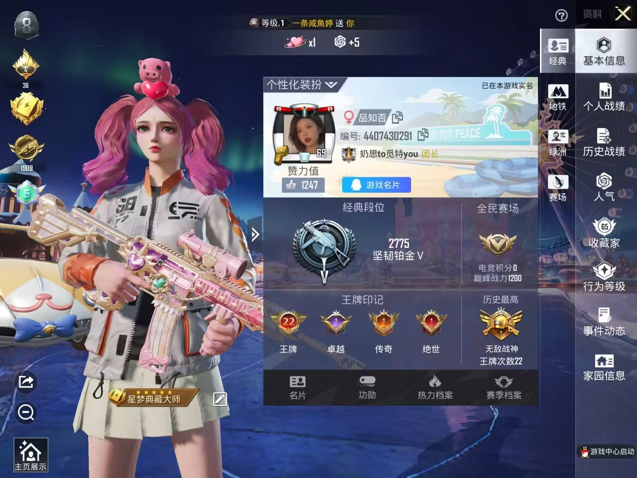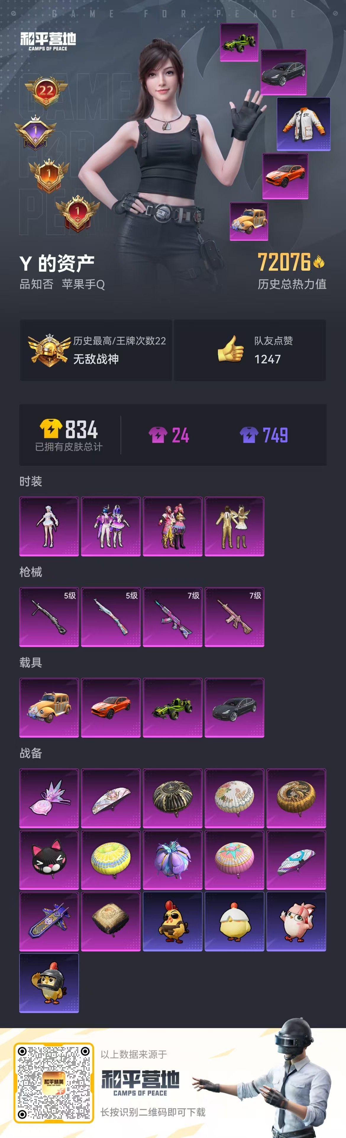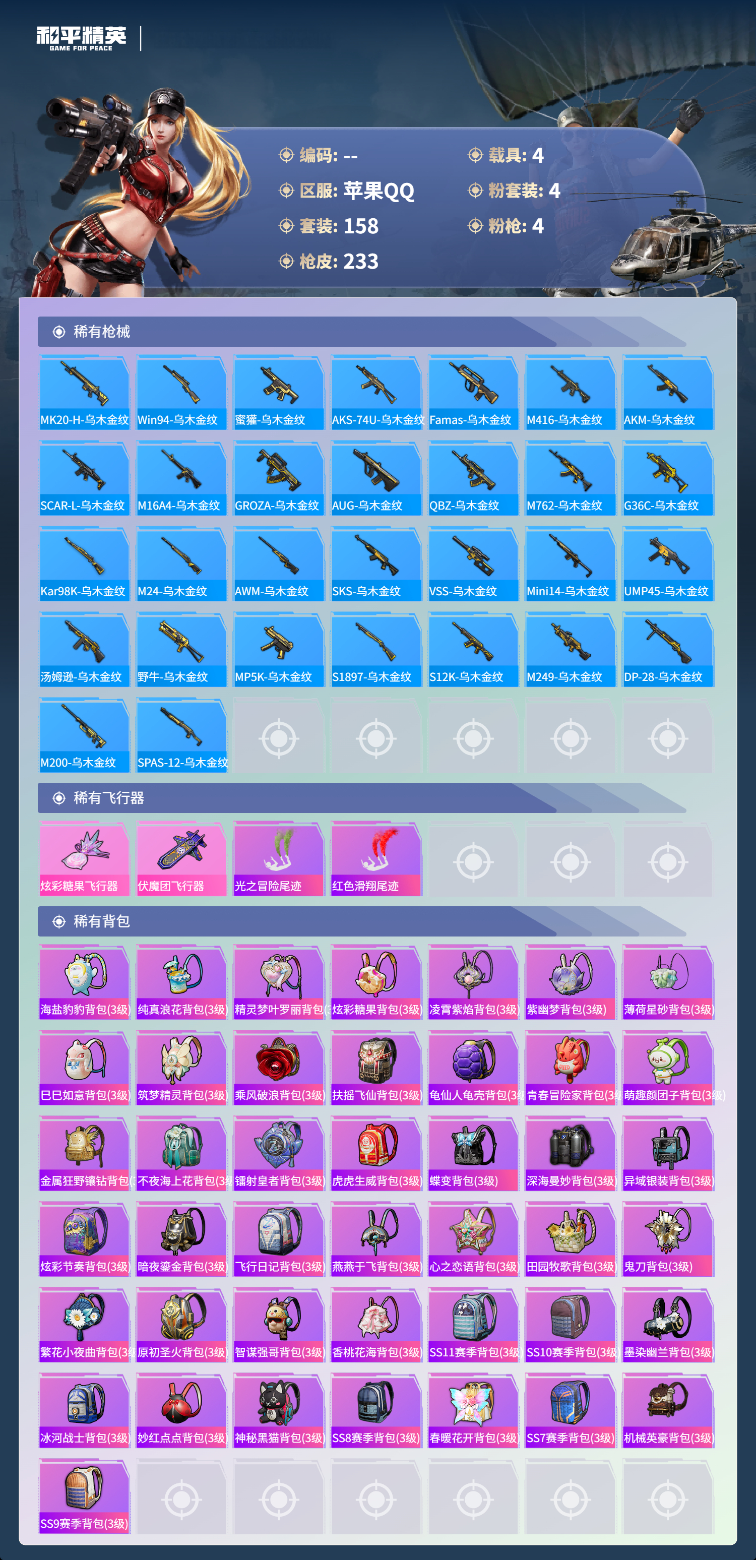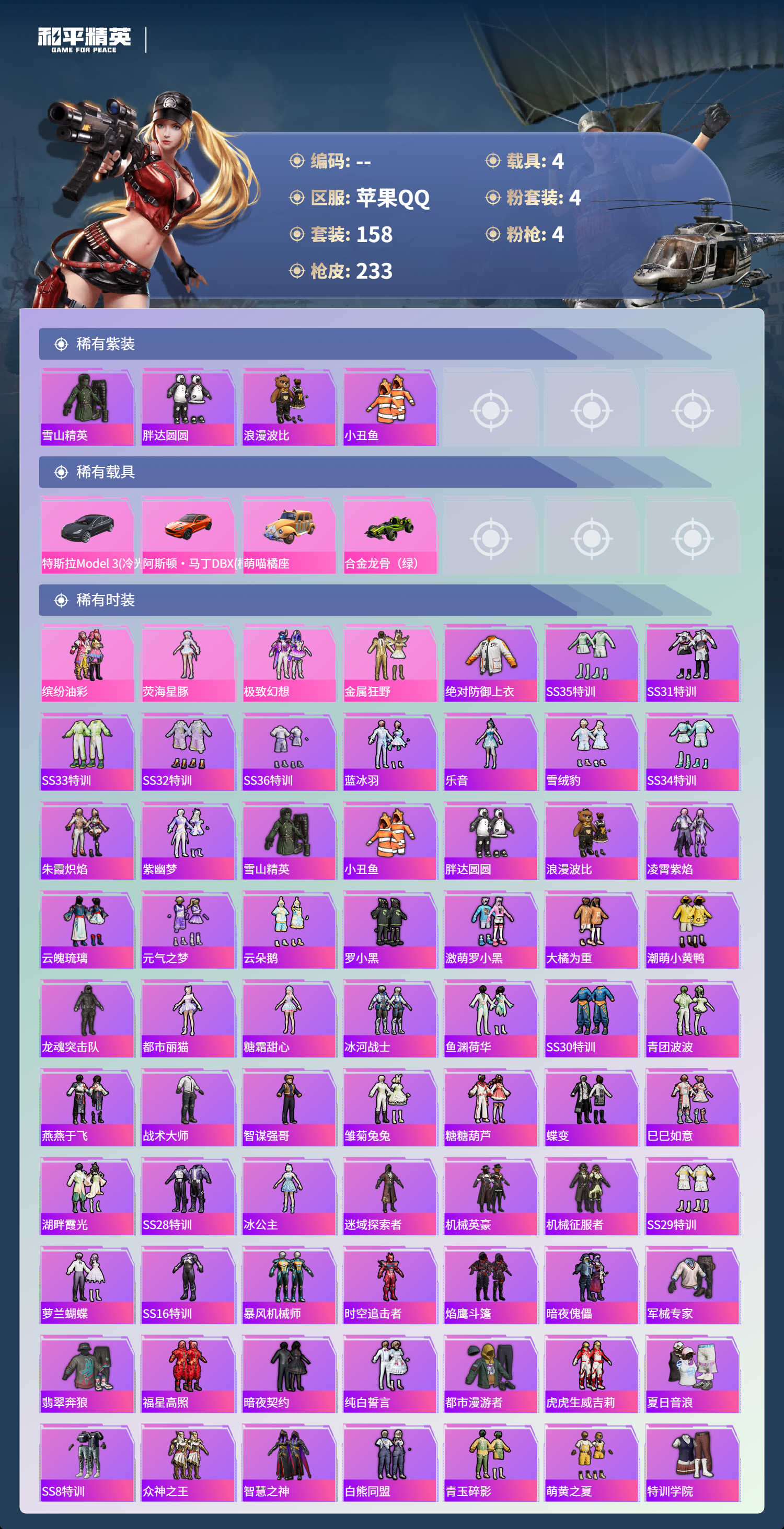 hs53870 苹果手q-22王牌印记-有战神框-4粉装-4特效呛-4载具-72076热力值-158套装-233呛皮-1卓越印记-1传奇印记【4粉装】套装-极致幻想套装-缤纷油彩角色-荧海星豚套装-金属狂野【4特效呛】akm-炫紫旋律/7级m416-心之恋语/7级dp-28-豹影疾电/5级kar98k-巳巳如意/5级【5稀有紫装】巡查衣雪山精英胖达圆圆浪漫波比小丑鱼【4