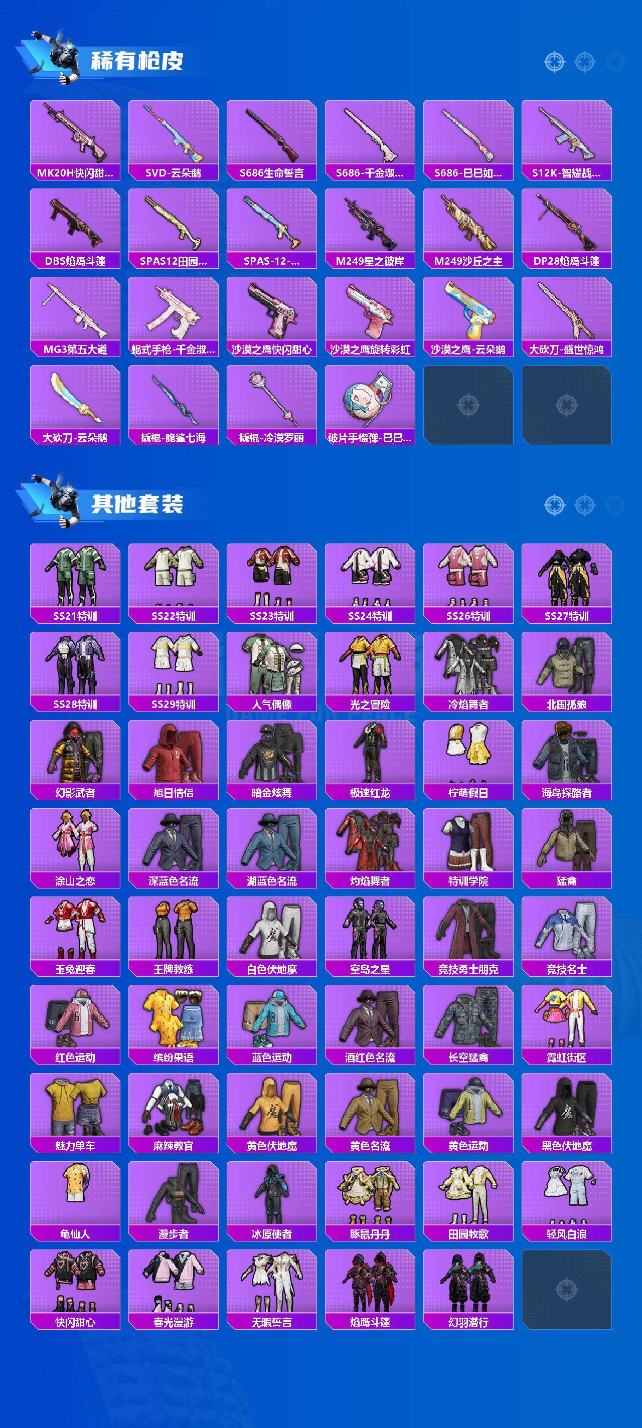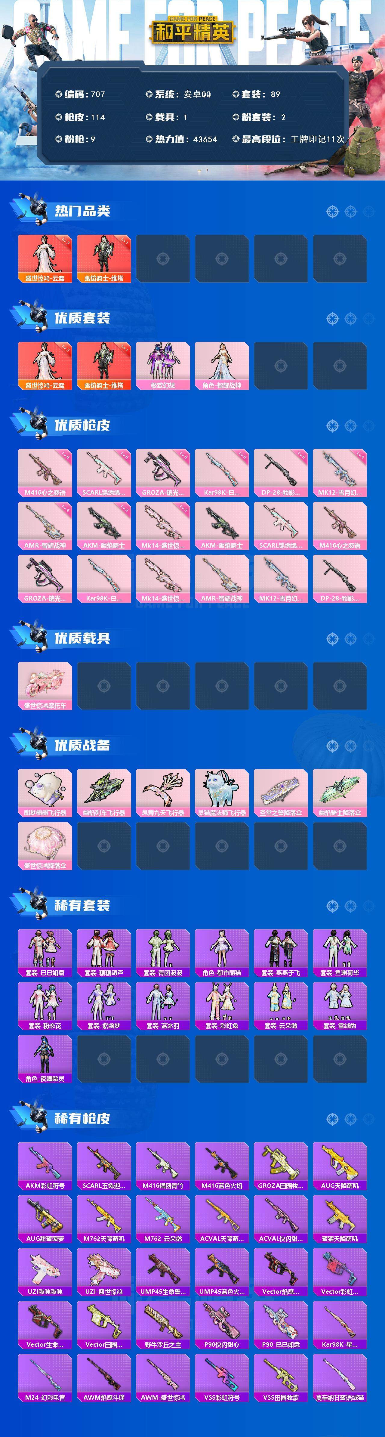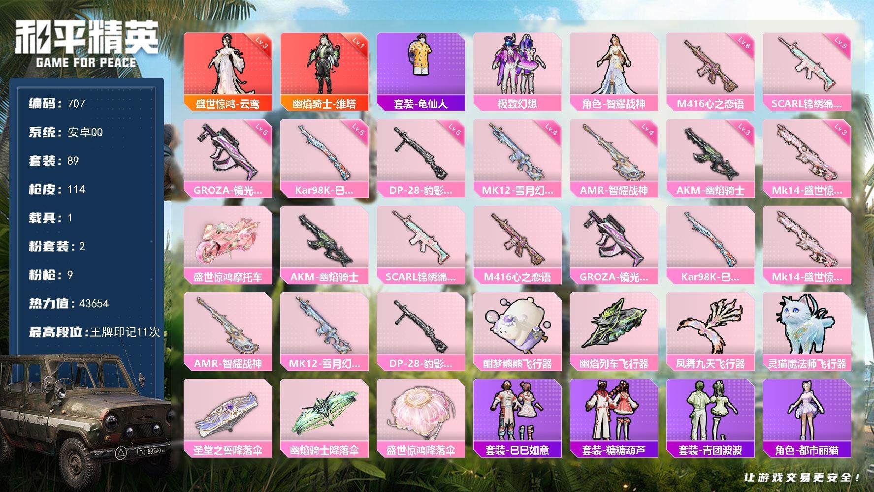 [14755074]安卓 手q-2神装-2粉装-9特效呛-1载具-5粉色飞行器-43654热力值-11王牌印记-89套装-114呛皮 【红色神装等级】:盛世惊鸿-云鸾三级,幽焰骑士-维塔一级 【红色角色神装】:盛世惊鸿-云鸾,幽焰骑士-维塔 【热门品类】:套装-龟仙人 【粉色套装】:粉装-极致幻想,角色-智耀战神 【粉色呛皮等级】:akm-幽焰骑士三级,scar-l-锦绣绵绵五级,m416-心之恋语六级,groza-镜光银凌五级,kar98k-巳巳如意五级,mk14-盛世惊鸿三级,amr-智耀战神四级,mk12-雪月幻音四级,dp-28-豹影疾电五级 【粉色载具】:盛世惊鸿摩托车 【粉色呛皮】:akm-幽焰骑士,scar-l-锦绣绵绵,m416-心之恋语,groza-镜光银凌,kar98k-巳巳如意,mk14-盛世惊鸿,amr-智耀战神,mk12-雪月幻音,dp-28-豹影疾电 【粉色飞行器】:酣梦熊熊飞行器,幽焰列车飞行器,凤舞九天飞行器,灵猫魔法师飞行器 【粉色降落伞】:圣堂之誓降落伞,幽焰骑士降落伞,盛世惊鸿降落伞 【稀有套装】:套装-龟仙人,套装-巳巳如意,套装-糖糖葫芦,套装-青团波波,角色-都市丽猫,套装-燕燕于飞,套装-鱼渊荷华,套装-粉恋花,套装-紫幽梦,套装-蓝冰羽,套装-彩虹兔,套装-云朵鹅,套装-雪绒豹,角色-夜瞳黯灵 【稀有呛皮】:akm-彩虹符号,scar-l-玉兔迎春,m416-糯团青竹,m416-蓝色火焰,groza-田园牧歌,aug-天降萌叽,aug-甜蜜菠萝,m762-天降萌叽,m762-云朵鹅,ac-val-天降萌叽,ac-val-快闪甜心,蜜獾-天降萌叽,uzi-啾咪啾咪,uzi-盛世惊鸿,ump45-生命誓言,ump45-蓝色火焰,vect-焰鹰斗篷,vect-彩虹符号,vect-生命誓言,vect-田园牧歌,野牛-沙丘之主,p90-快闪甜心,p90-巳巳如意,kar98k-星穹咏叹调,m24-幻彩电音,awm-焰鹰斗篷,awm-盛世惊鸿,vss-彩虹符号,vss-田园牧歌,莫辛纳甘-蜜语绒猫,mk20-h-快闪甜心,svd-云朵鹅,s686-生命誓言,s686-巳巳如意,s686-千金淑猫,s12k-智耀战神,dbs-焰鹰斗篷,spas-12-田园牧歌,spas-12-云朵鹅,m24