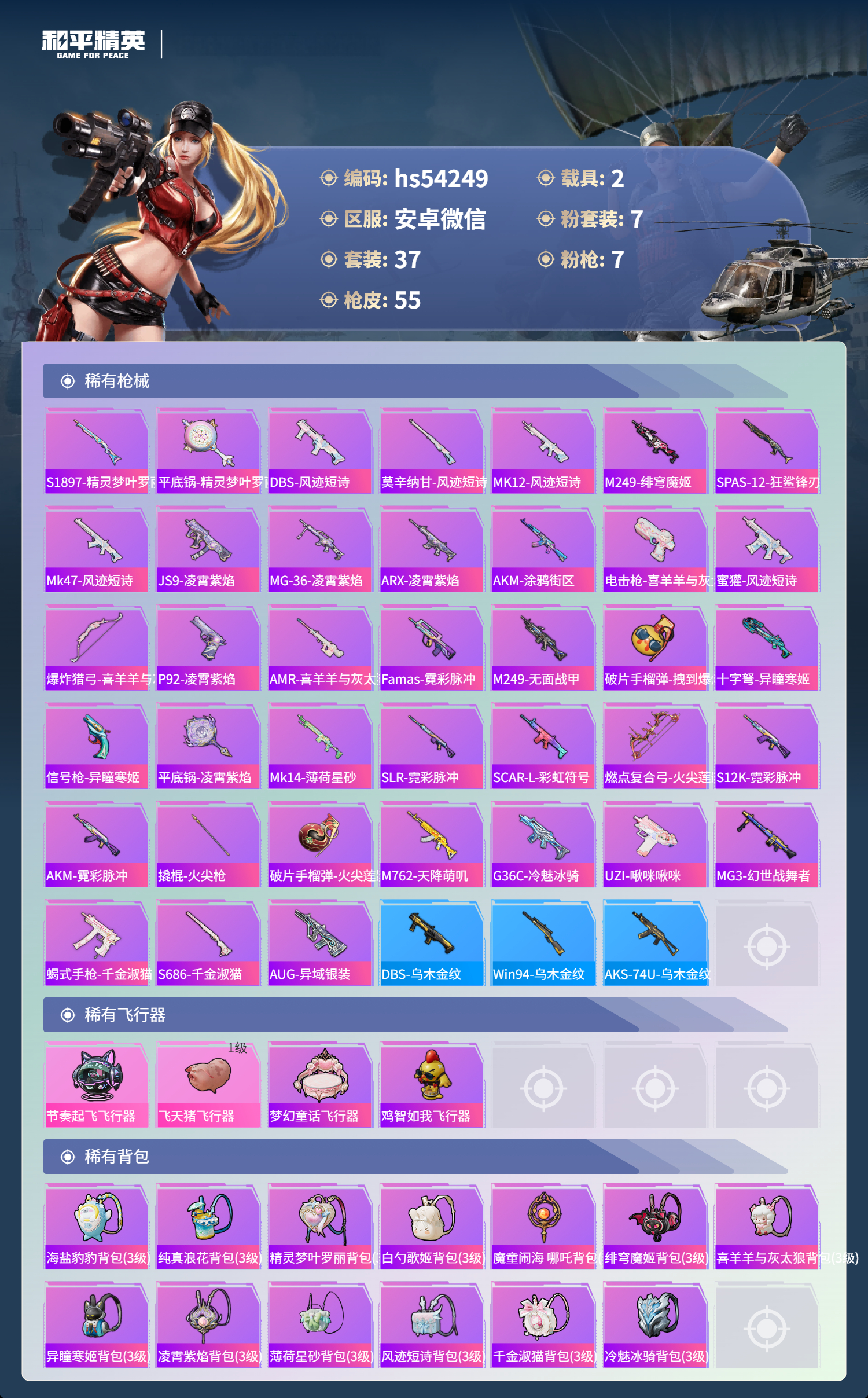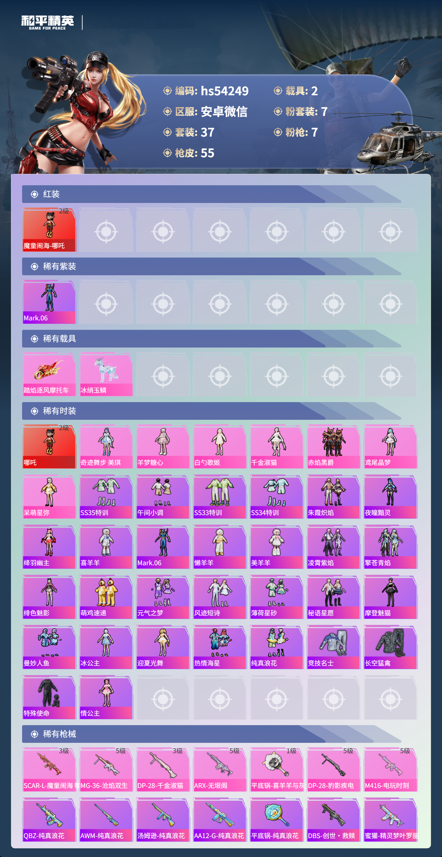 hs54249 安卓微信-2王牌印记-1红装-7粉装-7特效呛-2载具-24179热力值-37套装-55呛皮【1红装】魔童闹海-哪吒/2级【7粉装】角色-鸢尾晶梦角色-羊梦糖心角色-呆萌星弥套装-赤焰黑爵角色-千金淑猫角色-奇迹舞步 美琪角色-白勺歌姬【7特效呛】m416-电玩时刻/5级dp-28-豹影疾电/5级arx-无垠阁/5级scar-l-魔童闹海 哪吒/3级平底锅