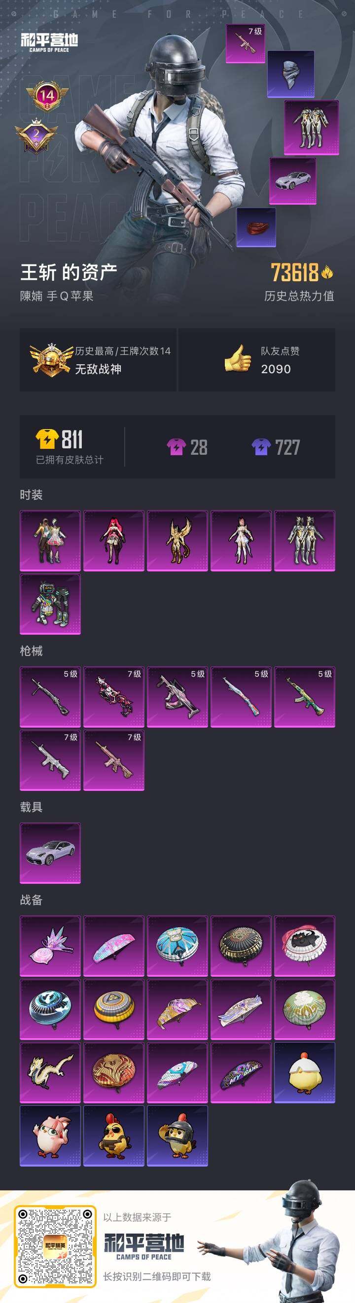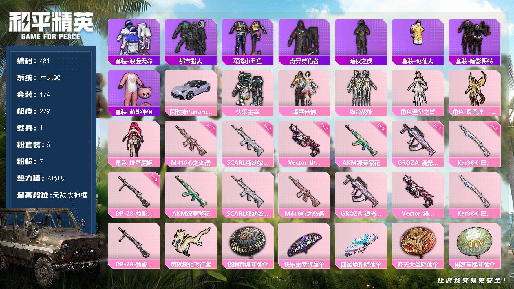 [14631908]苹果 手q-无敌战神框-6粉装-7特效呛-1载具-2粉色飞行器-73618热力值-14王牌印记-174套装-229呛皮 【热门品类】:套装-浪漫天命,套装-都市猎人,套装-深海小丑鱼,套装-奇异狩猎者,套装-暗夜之虎,套装-龟仙人,套装-暗影哥特,套装-萌熊伴侣 【粉色载具】:保时捷panamera(星辰紫) 【粉色套装】:粉装-快乐主宰,粉装-蝶舞迷情,粉装-绚金战神,角色-圣堂之誓,角色-凤凰座 一辉,角色-绯穹魔姬 【粉色呛皮等级】:akm-绿萝繁花五级,scar-l-纯梦嫁纱七级,m416-心之恋语七级,groza-镜光银凌五级,vect-绯穹魔姬七级,kar98k-巳巳如意五级,dp-28-豹影疾电五级 【粉色呛皮】:akm-绿萝繁花,scar-l-纯梦嫁纱,m416-心之恋语,groza-镜光银凌,vect-绯穹魔姬,kar98k-巳巳如意,dp-28-豹影疾电 【粉色飞行器】:黄族统领飞行器 【粉色降落伞】:极限特训降落伞,快乐主宰降落伞,四圣焕新降落伞,齐天大圣降落伞,闲梦青缨降落伞,圣堂之誓降落伞,沙丘之主降落伞,创世·救赎降落伞,脆鲨七海降落伞,绯穹魔姬降落伞,异瞳寒姬降落伞 【稀有套装】:套装-龟仙人,套装-巳巳如意,套装-雏菊兔兔,套装-萝兰蝴蝶,套装-小熊娃娃,套装-糖糖葫芦,套装-青团波波,套装-棉花软糖,套装-燕燕于飞,套装-鱼渊荷华,角色-糖霜甜心,套装-紫幽梦,套装-蓝冰羽,角色-绛羽幽主,角色-夜瞳黯灵,套装-朱霞炽焰,套装-凌霄紫焰,套装-擎苍青焰,角色-绯色魅影,套装-炫彩糖果 【稀有呛皮】:aug-冰晶雪宝,akm-奇异狩猎者,akm-彩虹符号,akm-影袭,akm-春暖花开,akm-破晓战魂,m16a4-幻世战舞者,m16a4-快乐主宰,scar-l-夜灯,scar-l-炫彩节奏,scar-l-玉兔迎春,scar-l-红色方程式,m416-快乐主宰,m416-糯团青竹,groza-影袭,groza-懵萌河马,groza-春暖花开,groza-田园牧歌,aug-天降萌叽,aug-耀粉歌者,q-原初圣火,q-洛神天依,m762-奇异狩猎者,m762-快乐主宰,m762-瑞龙福将,m762-绯红前夜,mk47-妙红点点,g36c-懵萌河马,ac-val-天降萌叽,ac-val-快闪甜