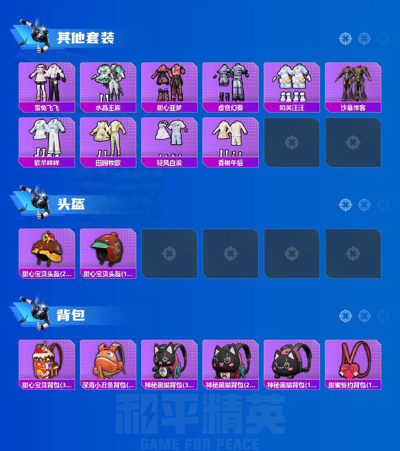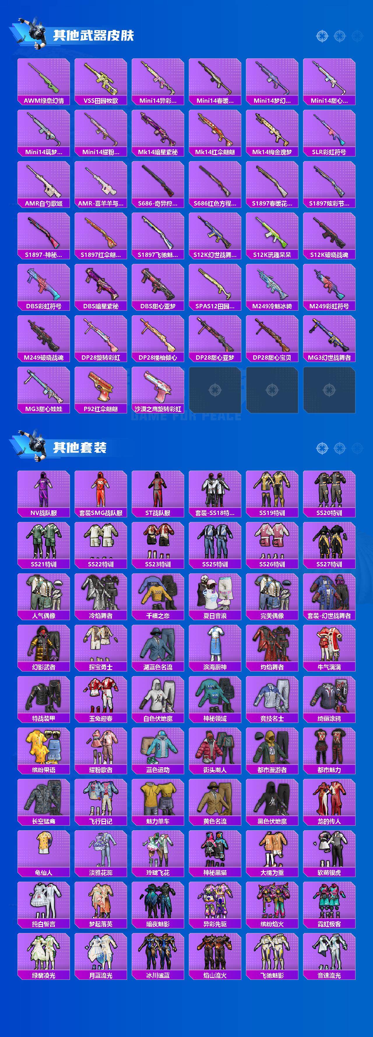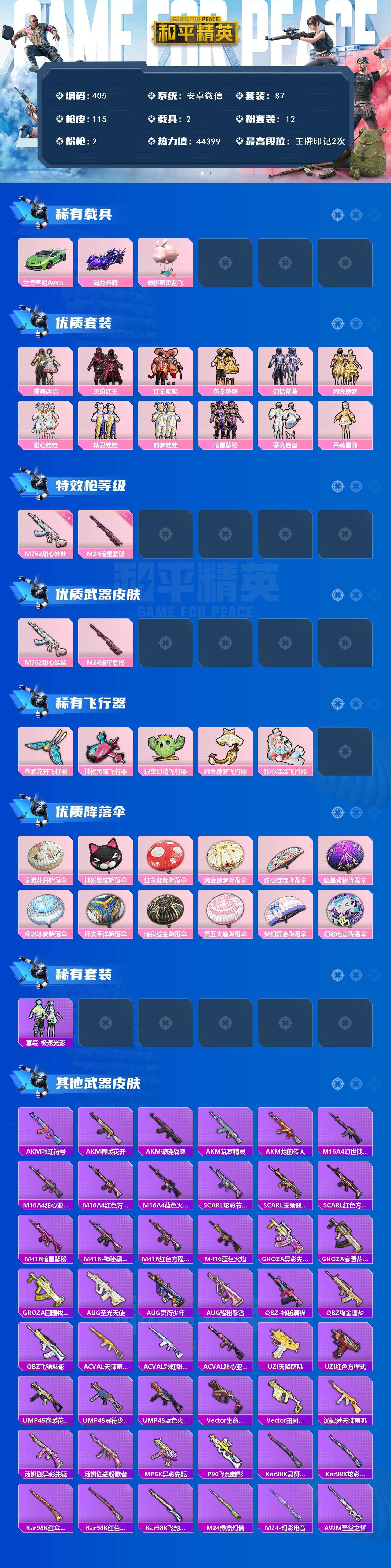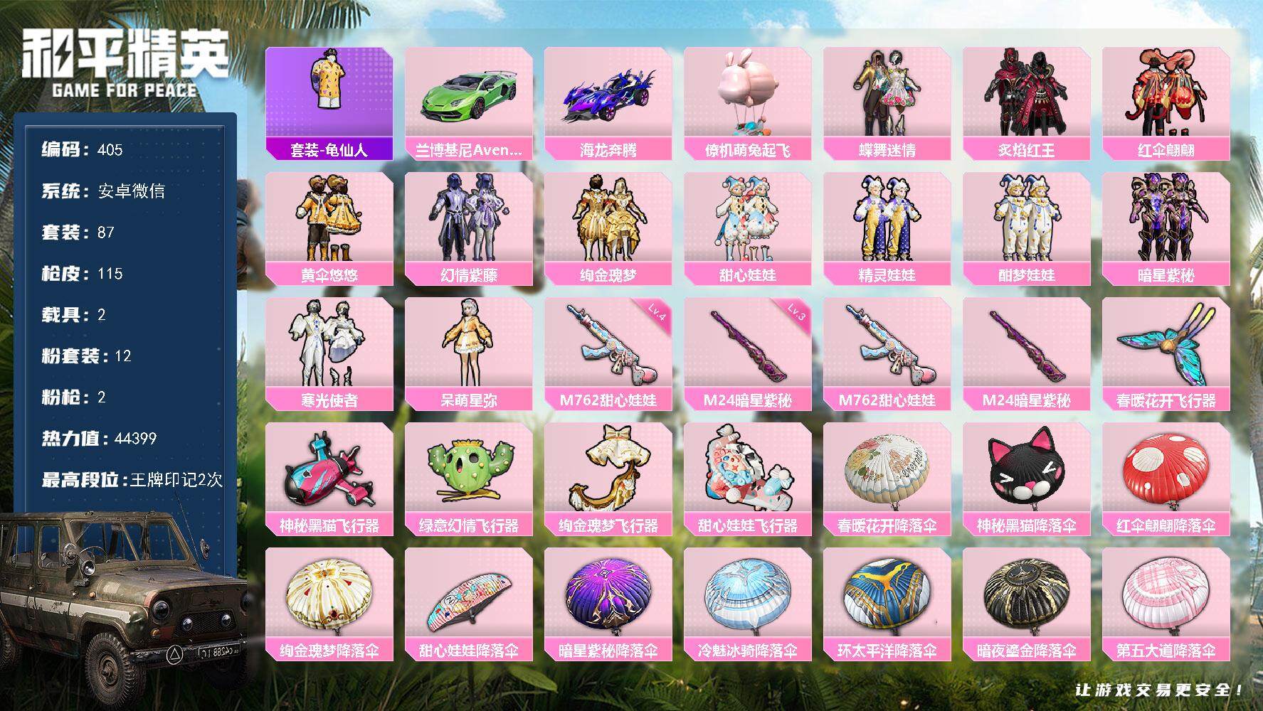 [14629324]安卓 微信-12粉装-2特效呛-2载具-5粉色飞行器-44399热力值-2王牌印记-87套装-115呛皮 【热门品类】:套装-龟仙人 【粉色载具】:兰博基尼aventad svj(翡翠绿),海龙奔腾,僚机-萌兔起飞 【粉色套装】:粉装-蝶舞迷情,粉装-炙焰红王,粉装-红伞翩翩,粉装-黄伞悠悠,粉装-幻情紫藤,粉装-绚金瑰梦,粉装-甜心娃娃,粉装-精灵娃娃,粉装-酣梦娃娃,粉装-暗星紫秘,粉装-寒光使者,角色-呆萌星弥 【粉色呛皮等级】:m762-甜心娃娃四级,m24-暗星紫秘三级 【粉色呛皮】:m762-甜心娃娃,m24-暗星紫秘 【粉色飞行器】:春暖花开飞行器,神秘黑猫飞行器,绿意幻情飞行器,绚金瑰梦飞行器,甜心娃娃飞行器 【粉色降落伞】:春暖花开降落伞,神秘黑猫降落伞,红伞翩翩降落伞,绚金瑰梦降落伞,甜心娃娃降落伞,暗星紫秘降落伞,冷魅冰骑降落伞,环太平洋降落伞,暗夜鎏金降落伞,第五大道降落伞,梦幻舞会降落伞,幻彩电音降落伞 【稀有套装】:套装-龟仙人,套装-极速光影 【稀有呛皮】:akm-彩虹符号,akm-春暖花开,akm-破晓战魂,akm-筑梦精灵,akm-龙的传人,m16a4-幻世战舞者,m16a4-甜心亚梦,m16a4-红色方程式,m16a4-蓝色火焰,scar-l-炫彩节奏,scar-l-玉兔迎春,scar-l-红色方程式,m416-暗星紫秘,m416-神秘黑猫,m416-红色方程式,m416-蓝色火焰,groza-异彩先驱,groza-春暖花开,groza-田园牧歌,aug-圣光天使,aug-灵符少年,aug-耀粉歌者,q-神秘黑猫,q-绚金瑰梦,q-飞驰魅影,ac-val-天降萌叽,ac-val-彩虹甜喵,ac-val-甜心亚梦,uzi-天降萌叽,uzi-红色方程式,ump45-春暖花开,ump45-灵符少年,ump45-蓝色火焰,vect-生命誓言,vect-田园牧歌,汤姆逊-天降萌叽,汤姆逊-异彩先驱,汤姆逊-耀粉歌者,mp5k-异彩先驱,p90-飞驰魅影,kar98k-灵符少年,kar98k-炫彩节奏,kar98k-红伞翩翩,kar98k-红色方程式,kar98k-飞驰魅影,m24-绿意幻情,m24-幻彩电音,awm-圣堂之誓,awm-绿意幻情,vss-田园牧歌,mini14-异彩先驱,mini14-春暖花开