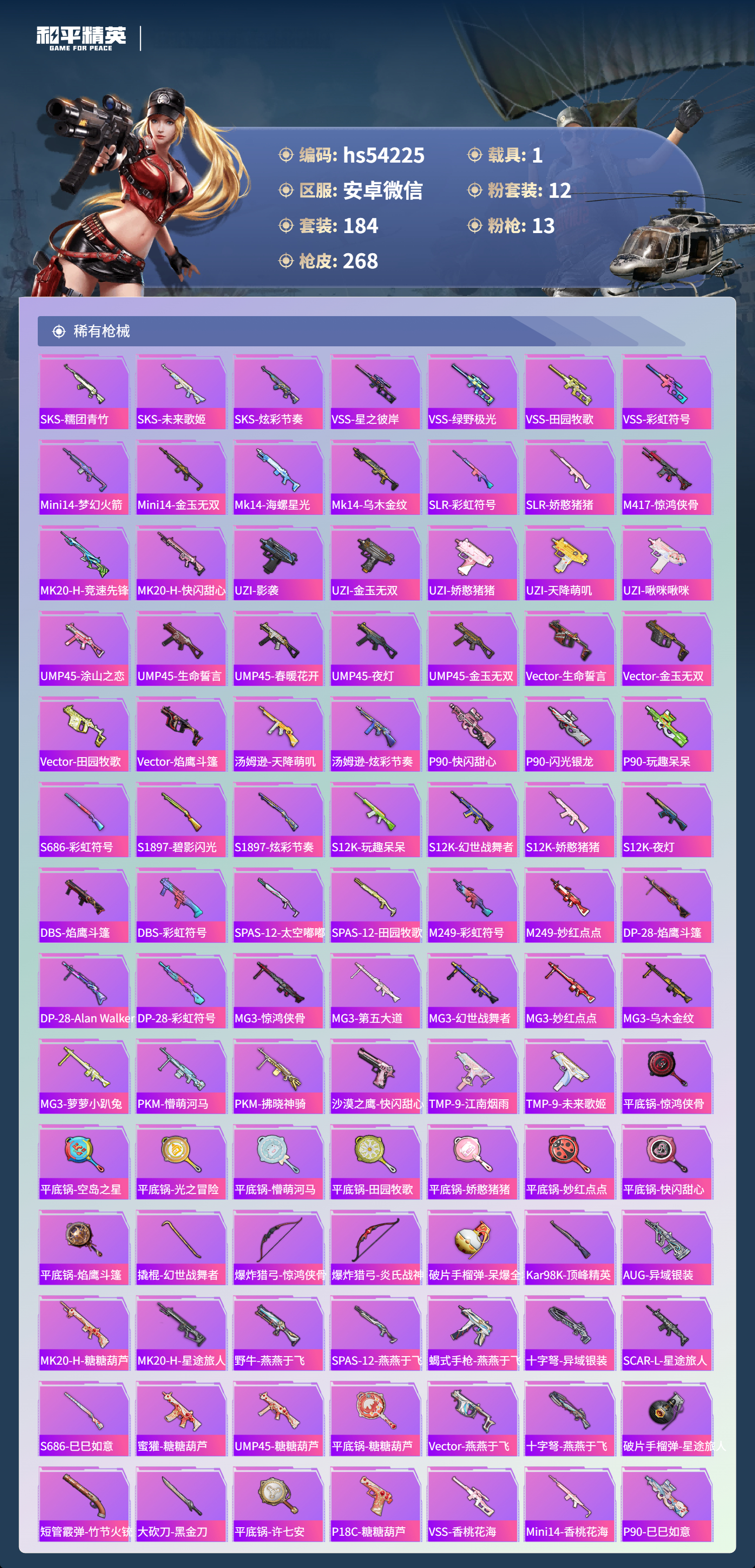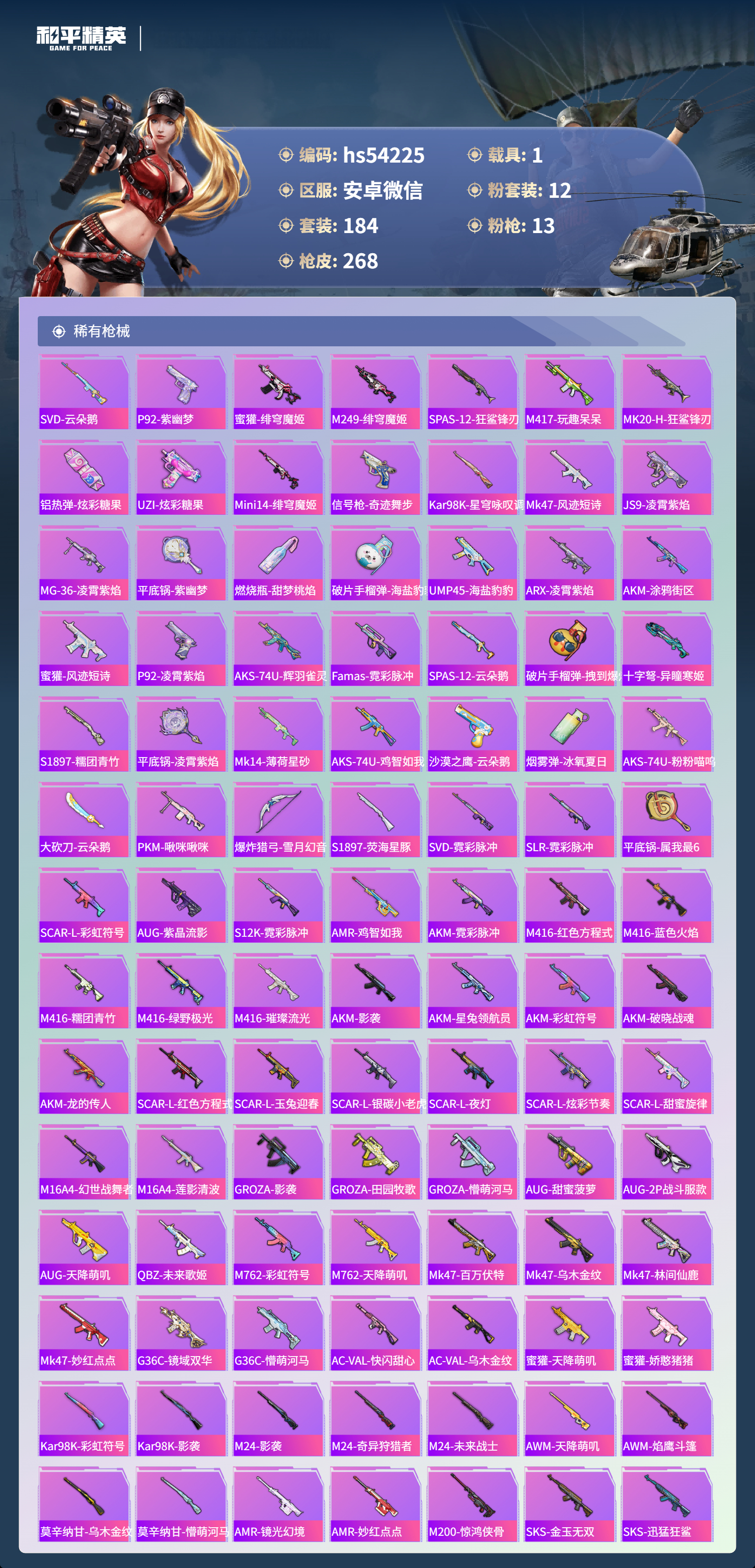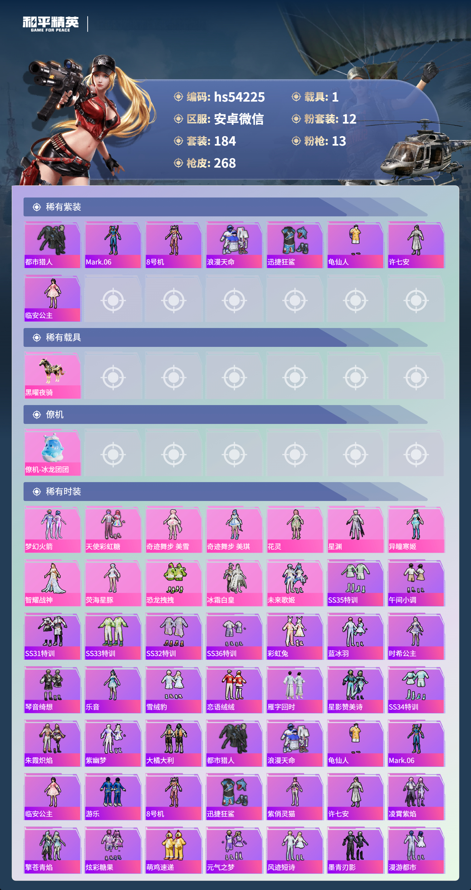 hs54225 安卓微信-16王牌印记-12粉装-13特效呛-1载具-82770热力值-184套装-268呛皮-3卓越印记-2传奇印记【12粉装】套装-梦幻火箭套装-未来歌姬套装-恐龙拽拽角色-奇迹舞步 美琪角色-花灵套装-天使彩虹糖角色-智耀战神角色-奇迹舞步 美雪角色-星渊角色-异瞳寒姬角色-荧海星豚套装-冰霜白皇【13特效呛】vect-绯穹魔姬/4级aks-7