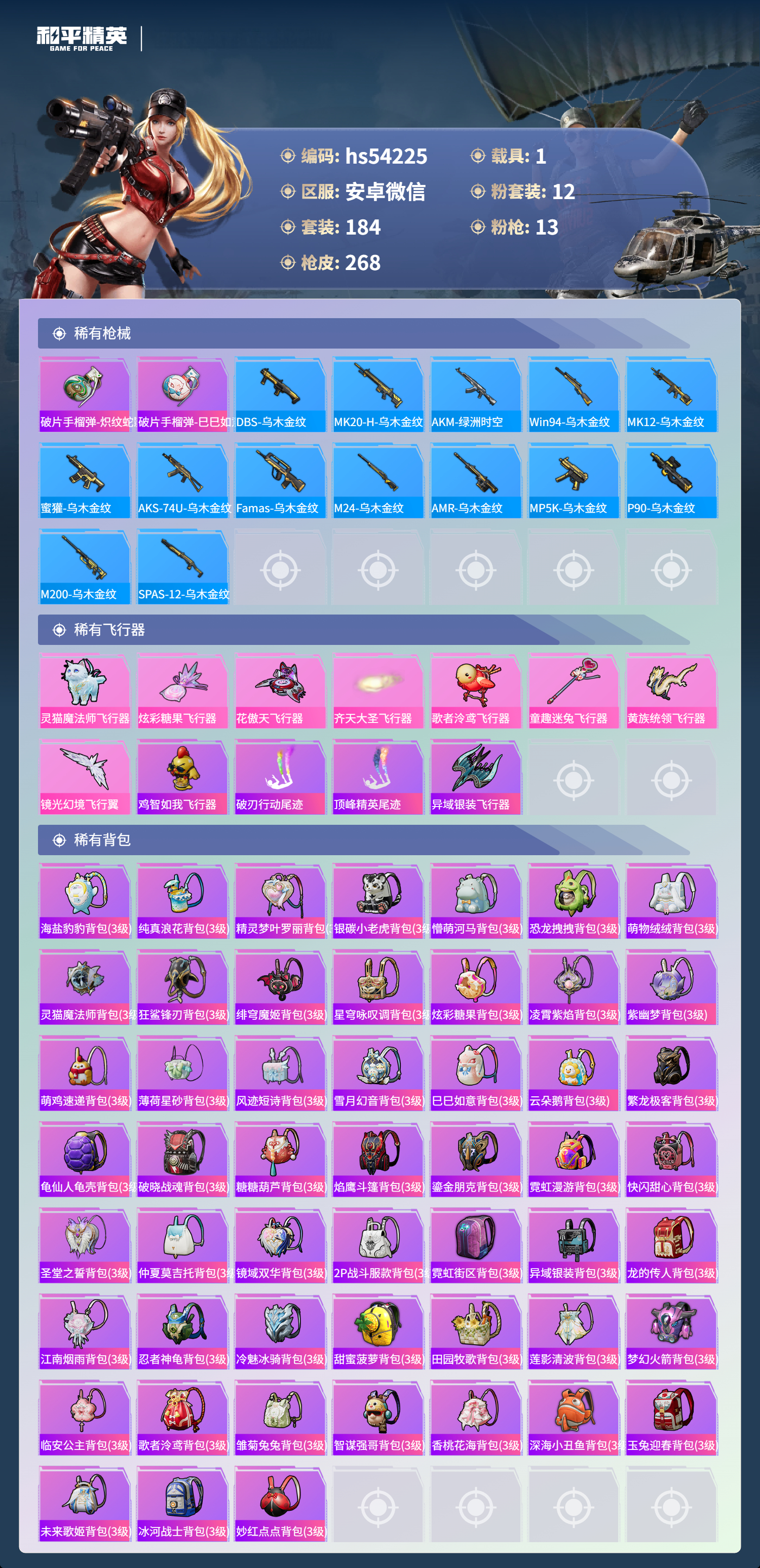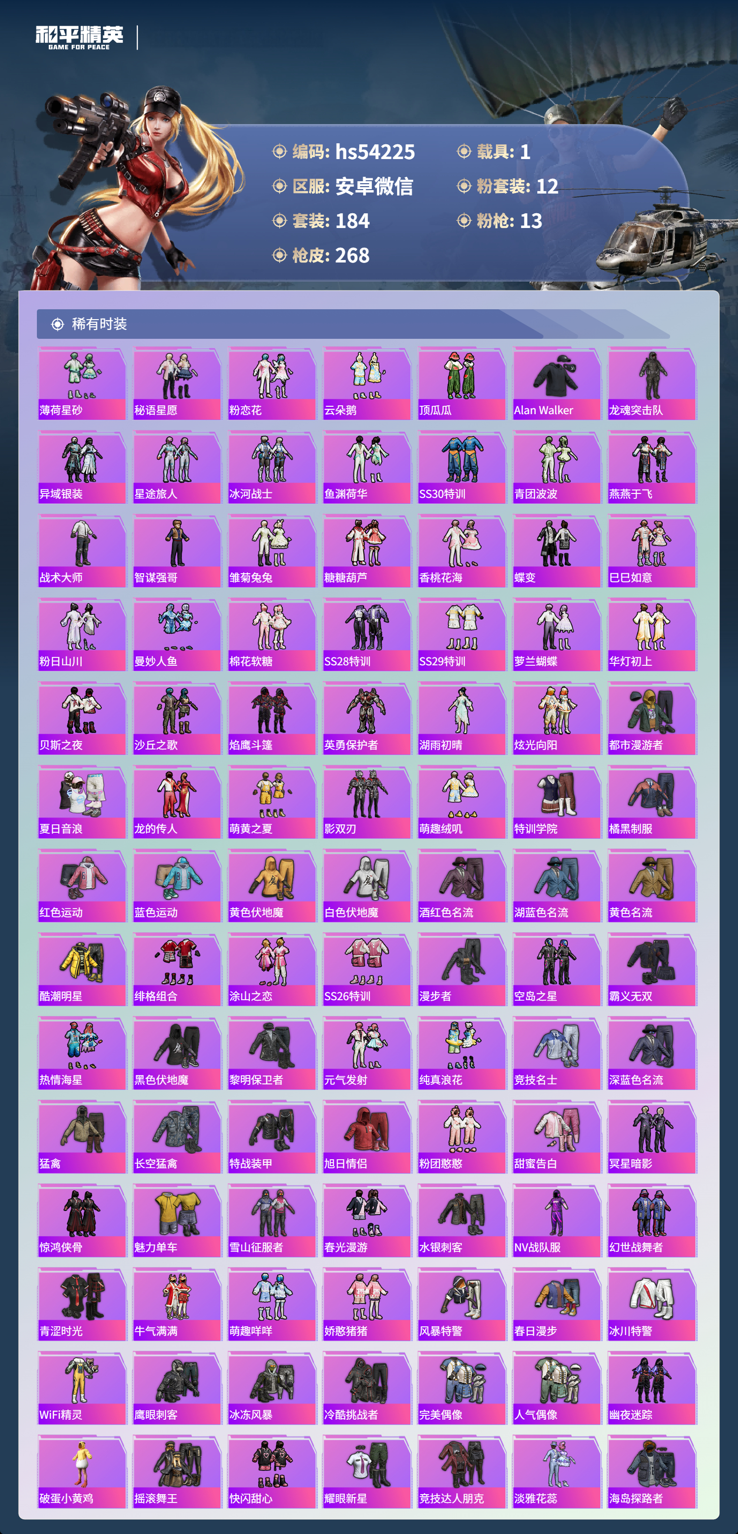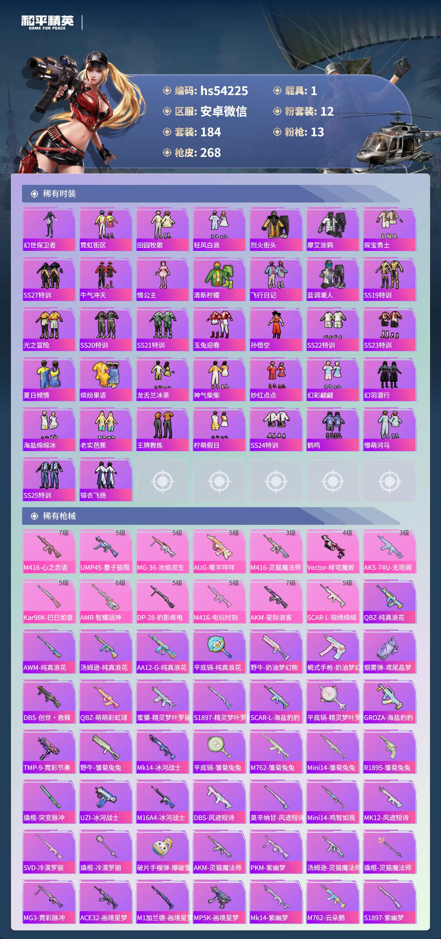 hs54225 安卓微信-16王牌印记-12粉装-13特效呛-1载具-82770热力值-184套装-268呛皮-3卓越印记-2传奇印记【12粉装】套装-梦幻火箭套装-未来歌姬套装-恐龙拽拽角色-奇迹舞步 美琪角色-花灵套装-天使彩虹糖角色-智耀战神角色-奇迹舞步 美雪角色-星渊角色-异瞳寒姬角色-荧海星豚套装-冰霜白皇【13特效呛】vect-绯穹魔姬/4级aks-7
