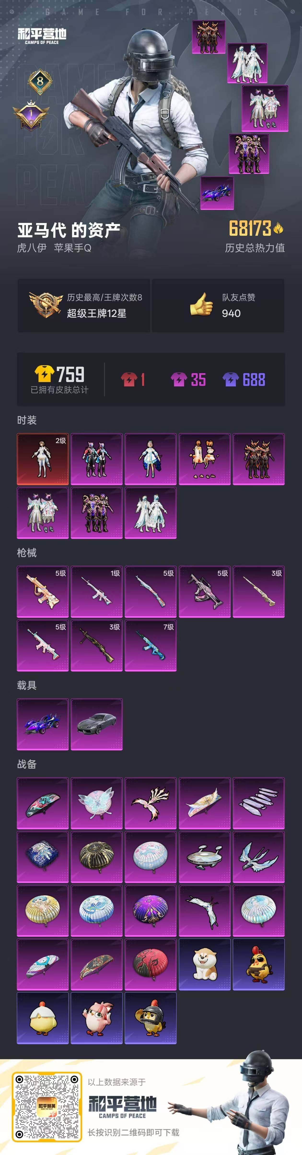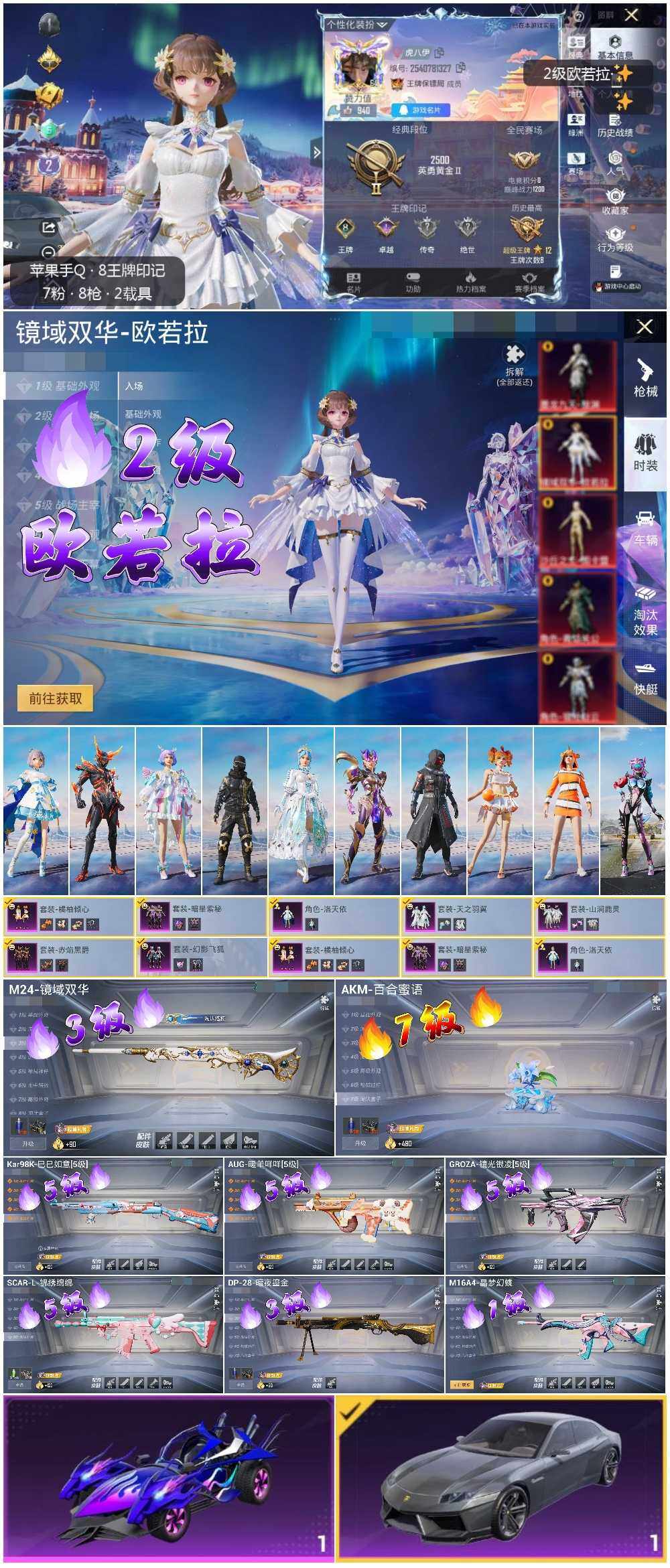 【店主推荐捡漏号!可直接换绑】 地铁满天赋 苹果 手q-1神装-7粉装-8特效呛-2载具-5粉色飞行器-6.8w热力值-8王牌印记-163套装-202呛皮【红色神装等级】:镜域双华-欧若拉二级【红色角色神装】:镜域双华-欧若拉【热门品类】:套装-小丑鱼,套装-奇异狩猎者,套装-金羽特工,套装-龟仙人,套装-粉红小猪【粉色套装】:粉装-山涧鹿灵,角色-洛天依,粉装-暗星紫秘,粉装-天之羽翼,粉装-橘柚倾心,粉装-赤焰黑爵,粉装-幻影飞狐【粉色呛皮等级】:akm-百合蜜语七级,m16a4-晶梦幻蝶一级,scar-l-锦绣绵绵五级,groza-镜光银凌五级,aug-暖羊咩咩五级,kar98k-巳巳如意五级,m24-镜域双华三级,dp-28-暗夜鎏金三级 【粉色载具】:兰博基尼estoque(银翼灰),海龙奔腾【粉色呛皮】:akm-百合蜜语,m16a4-晶梦幻蝶,scar-l-锦绣绵绵,groza-镜光银凌,aug-暖羊咩咩,kar98k-巳巳如意,m24-镜域双华,dp-28-暗夜鎏金【粉色飞行器】:天之羽翼飞行器,冷魅冰骑飞行器,千面幻镜飞行器,镜域双华-灵镜之阶,凤舞九天飞行器
