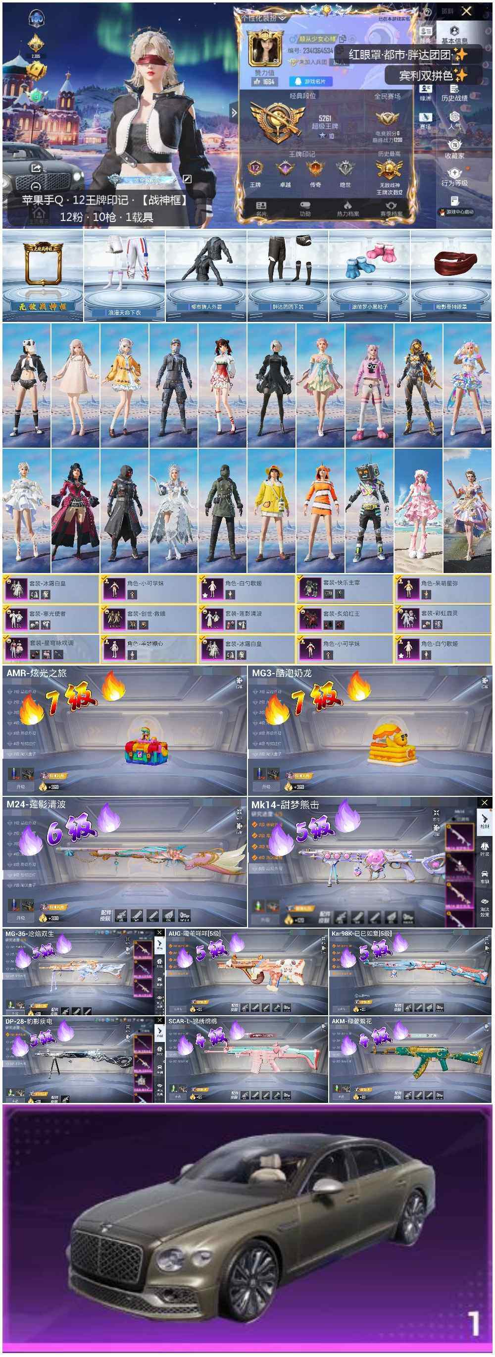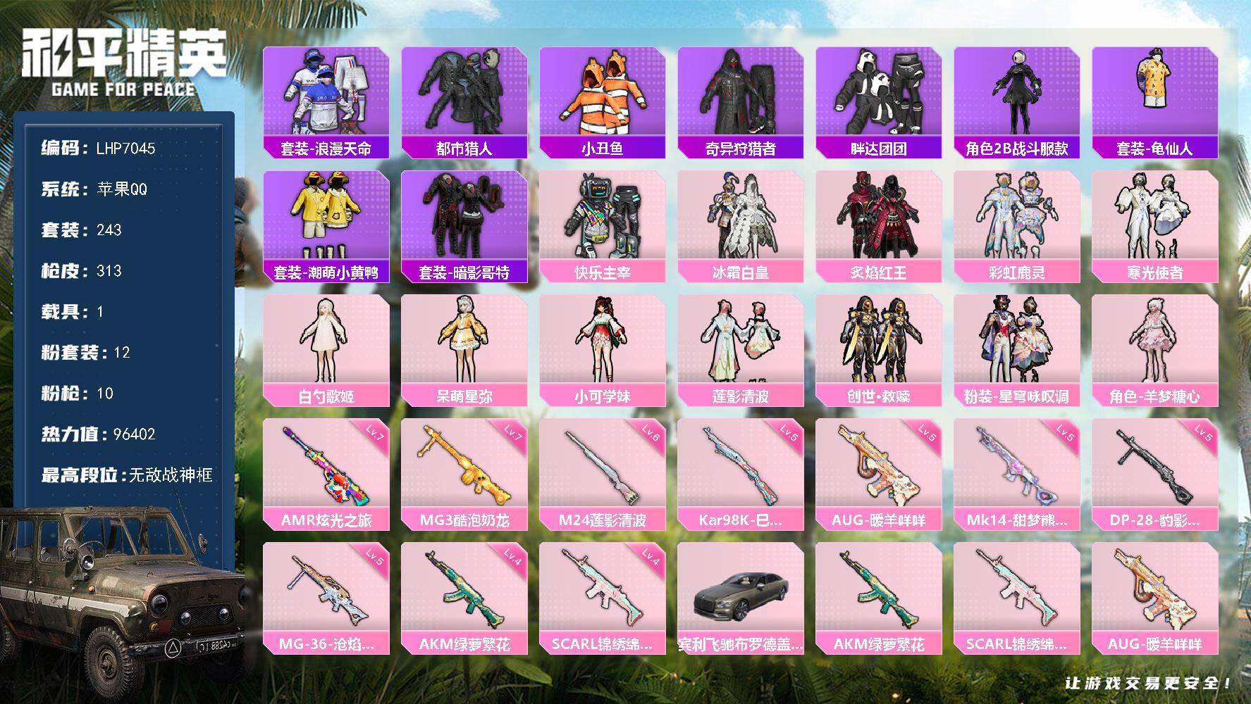 [14760847]【店主推荐捡漏号!可直接换绑】 地铁满天赋身法素材苹果 手q-无敌战神框-12粉装-10特效呛-1载具-7粉色飞行器-96402热力值-12王牌印记-243套装-313呛皮 【热门品类】:套装-浪漫天命,套装-都市猎人,套装-小丑鱼,套装-奇异狩猎者,套装-胖达团团,角色-2b战斗服款,套装-龟仙人,套装-潮萌小黄鸭,套装-暗影哥特 【粉色套装】:粉装-快乐主宰,粉装-冰霜白皇,粉装-炙焰红王,粉装-彩虹鹿灵,粉装-寒光使者,角色-白勺歌姬,角色-呆萌星弥,角色-小可学妹,粉装-莲影清波,套装-创世·救赎,粉装-星穹咏叹调,角色-羊梦糖心 【粉色呛皮等级】:akm-绿萝繁花四级,scar-l-锦绣绵绵四级,aug-暖羊咩咩五级,kar98k-巳巳如意五级,m24-莲影清波六级,mk14-甜梦熊击五级,amr-炫光之旅七级,dp-28-豹影疾电五级,mg3-酷泡奶龙七级,mg-36-沧焰双生五级 【粉色载具】:宾利飞驰(布罗德盖棕双色) 【粉色呛皮】:akm-绿萝繁花,scar-l-锦绣绵绵,aug-暖羊咩咩,kar98k-巳巳如意,m24-莲影清波,mk14-甜梦熊击,amr-炫光之旅,dp-28-豹影疾电,mg3-酷泡奶龙,mg-36-沧焰双生 【粉色飞行器】:相思残雪飞行器,白勺歌姬飞行器,镜域双华-灵镜之阶,龙翔九天飞行器,圣域金龙飞行器,雀灵庇佑飞行器 【粉色降落伞】:绝对恒星降落伞,极限特训降落伞,春暖花开降落伞,炫紫旋律降落伞,神秘黑猫降落伞,恐龙拽拽降落伞,庄周梦蝶降落伞,第五大道降落伞,飒粉甜心降落伞,白勺歌姬降落伞,炫光之旅降落伞,超新星降落伞,圣堂之誓降落伞,沙丘之主降落伞,猪猪侠降落伞,祥瑞锦鲤降落伞,繁龙极客降落伞,江南烟雨降落伞,精灵梦叶罗丽降落伞,忍者神龟降落伞,樱桃泡泡降落伞,绯果甜心降落伞,荧海星豚降落伞 【稀有套装】:套装-龟仙人,套装-巳巳如意,套装-圣穹绘梦,套装-雪国风尚,角色-摩登魅猫,套装-燕燕于飞,套装-鱼渊荷华,角色-蜜桃派对,套装-粉恋花,套装-紫幽梦,套装-蓝冰羽,套装-星渊小夜曲,套装-彩虹兔,套装-云朵鹅,套装-雪绒豹,套装-蜜露汐语,套装-蓝海鲸歌,套装-朱霞炽焰,套装-凌霄紫焰,套装-擎苍青焰,角色-敖闰,角色-绯色魅影,套装-画境星梦,套装-琴音绮想,套装-炫彩糖