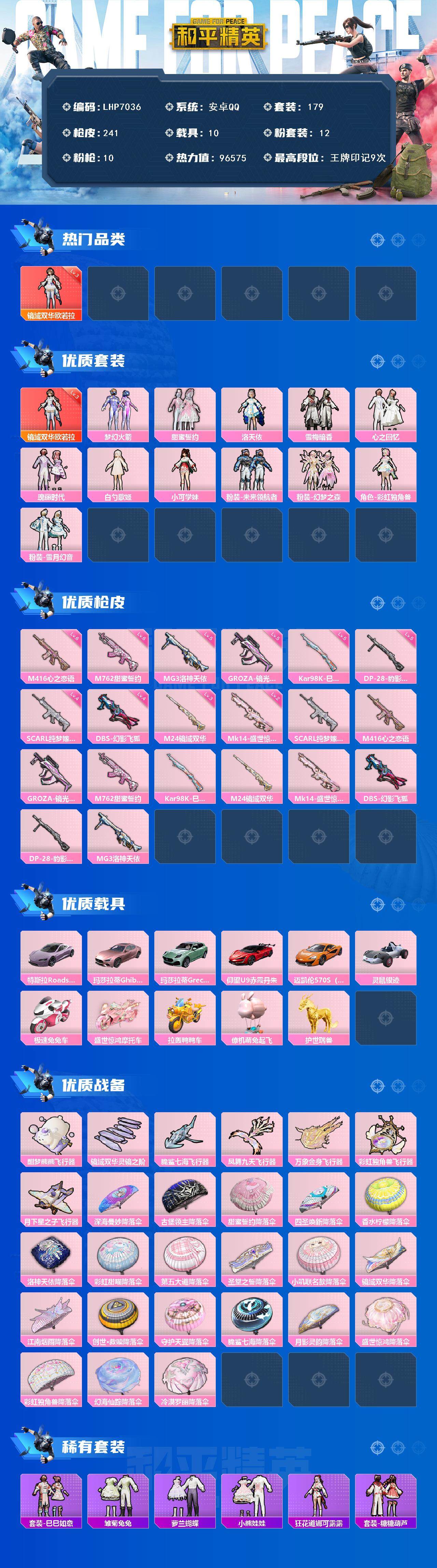 [14760915]【店主推荐捡漏号!可直接换绑】安卓 手q-1神装-12粉装-10特效呛-10载具-9粉色飞行器-96575热力值-9王牌印记-179套装-241呛皮【红色神装等级】:镜域双华-欧若拉三级【红色角色神装】:镜域双华-欧若拉【热门品类】:粉装-梦幻火箭,套装-奇异狩猎者,套装-龟仙人【粉色套装】:粉装-梦幻火箭,粉装-甜蜜誓约,角色-洛天依,粉装-雪梅暗香,粉装-心之回忆,粉装-瑰丽时代,角色-白勺歌姬,角色-小可学妹,粉装-未来领航者,粉装-幻梦之森,角色-彩虹独角兽,粉装-雪月幻音【粉色呛皮等级】:scar-l-纯梦嫁纱四级,m416-心之恋语六级,groza-镜光银凌五级,m762-甜蜜誓约六级,kar98k-巳巳如意五级,m24-镜域双华三级,mk14-盛世惊鸿二级,dbs-幻影飞狐四级,dp-28-豹影疾电五级,mg3-洛神天依五级【粉色载具】:特斯拉roadster(沁心粉),玛莎拉蒂ghibli(粉),玛莎拉蒂grecale(薄荷绿),仰望u9(赤霞丹朱),迈凯伦570s(旭日黄),灵鼠银迹,极速兔兔车,盛世惊鸿摩托车,拉轰鸭鸭车,僚机-萌兔起飞,护世瑞兽【粉色呛皮】:scar-l-纯梦嫁纱,m416-心之恋语,groza-镜光银凌,m762-甜蜜誓约,kar98k-巳巳如意,m24-镜域双华,mk14-盛世惊鸿,dbs-幻影飞狐,dp-28-豹影疾电,mg3-洛神天依【粉色飞行器】:酣梦熊熊飞行器,镜域双华-灵镜之阶,脆鲨七海飞行器,凤舞九天飞行器,万象金身飞行器,彩虹独角兽飞行器,月下星之子飞行器