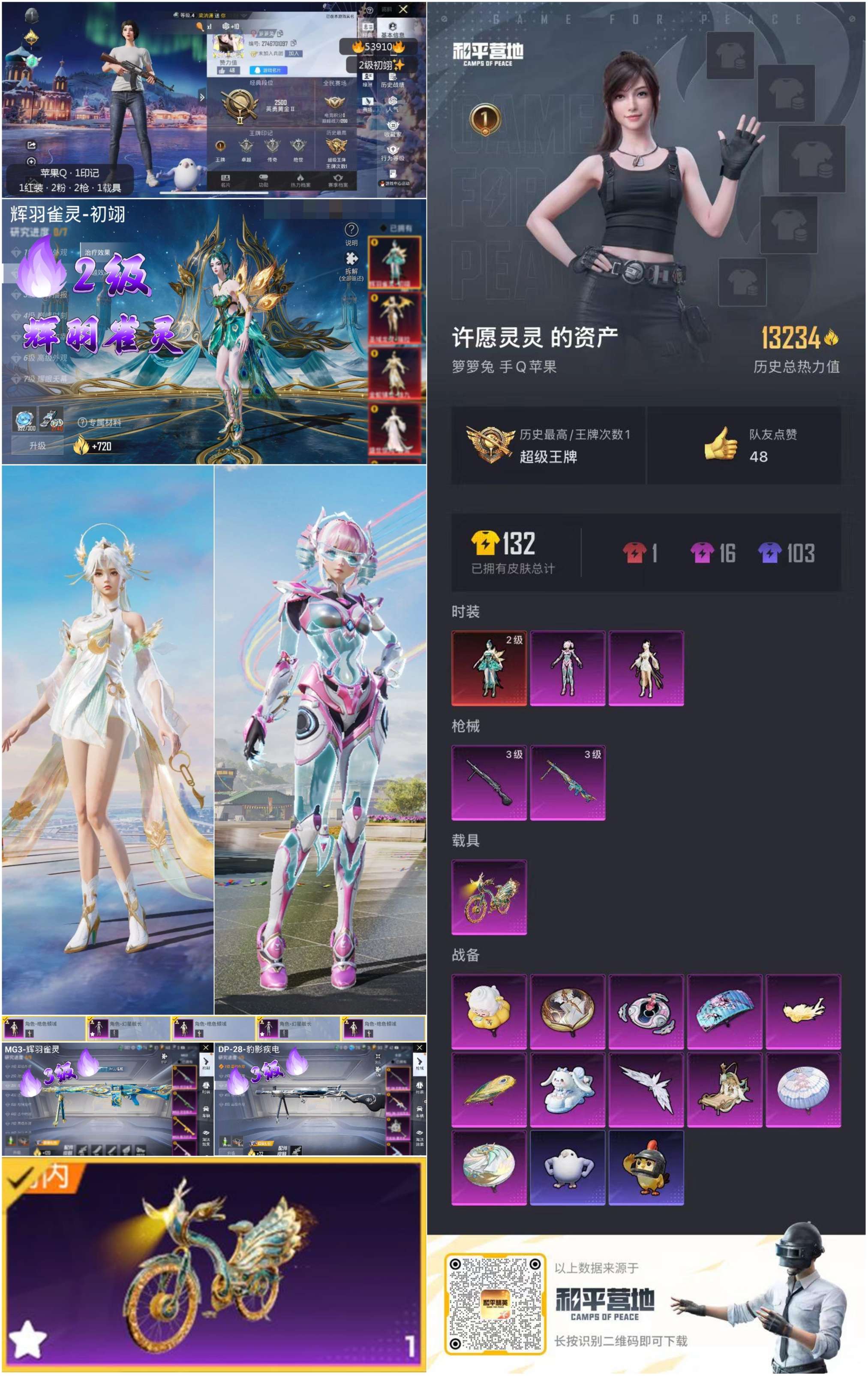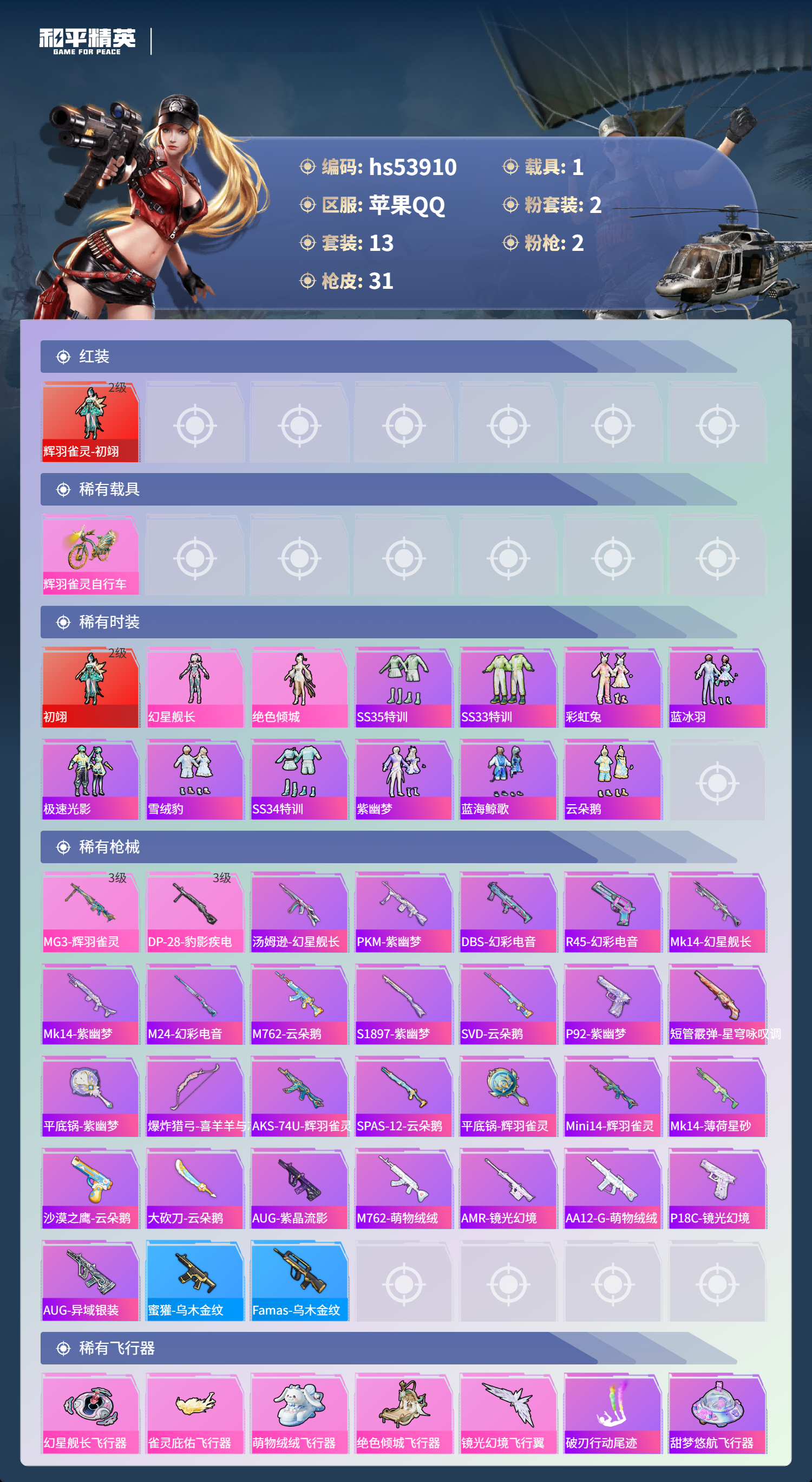 hs53910 苹果手q-1王牌印记-1红装-2粉装-2特效呛-1载具-13234热力值-13套装-31呛皮【1红装】辉羽雀灵-初翊/2级【2粉装】角色-幻星舰长角色-绝色倾城【2特效呛】dp-28-豹影疾电/3级mg3-辉羽雀灵/3级【1稀有载具】辉羽雀灵自行车【13稀有时装】初翊/2级幻星舰长ss35特训ss33特训彩虹兔蓝冰羽极速光影雪绒豹ss34特训紫幽梦
