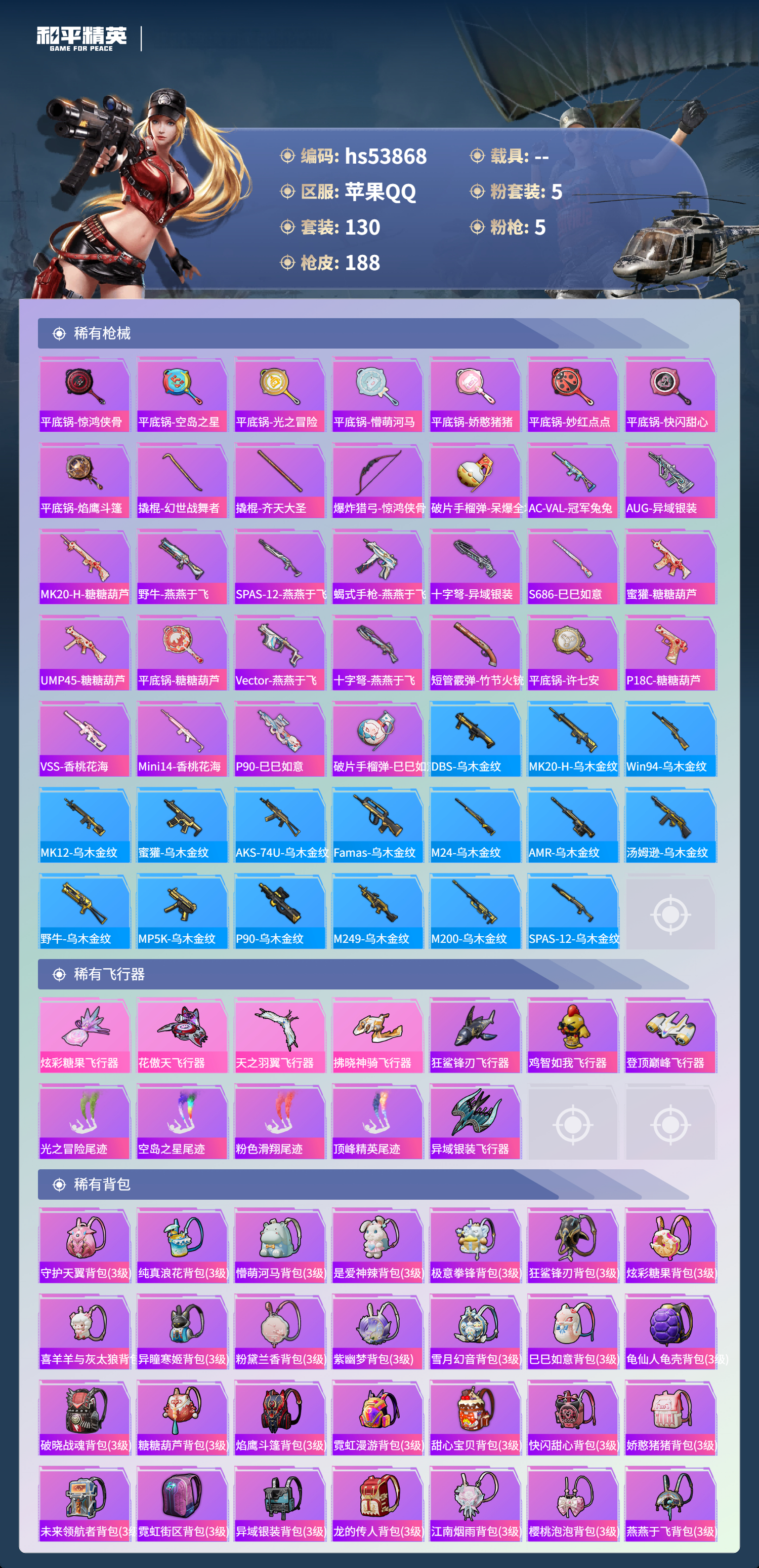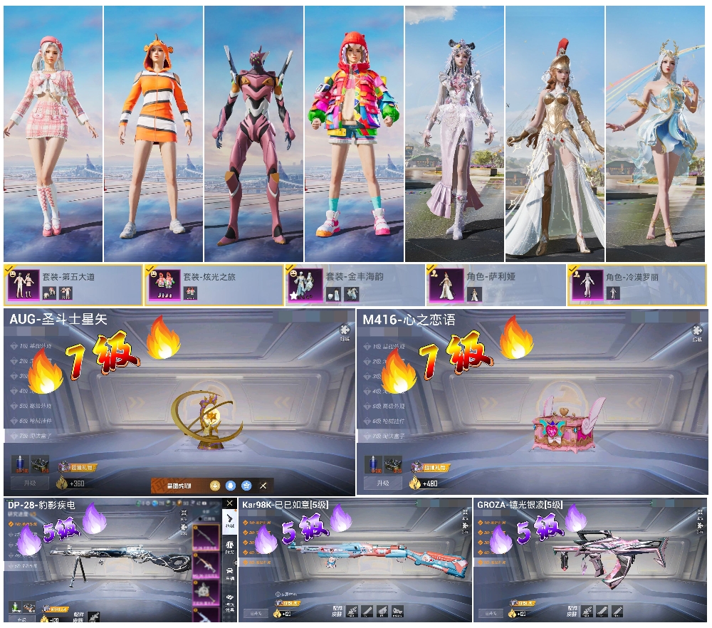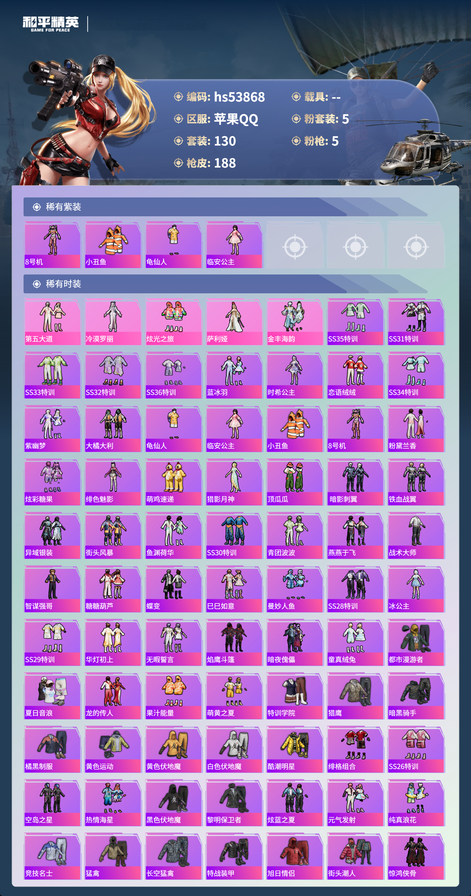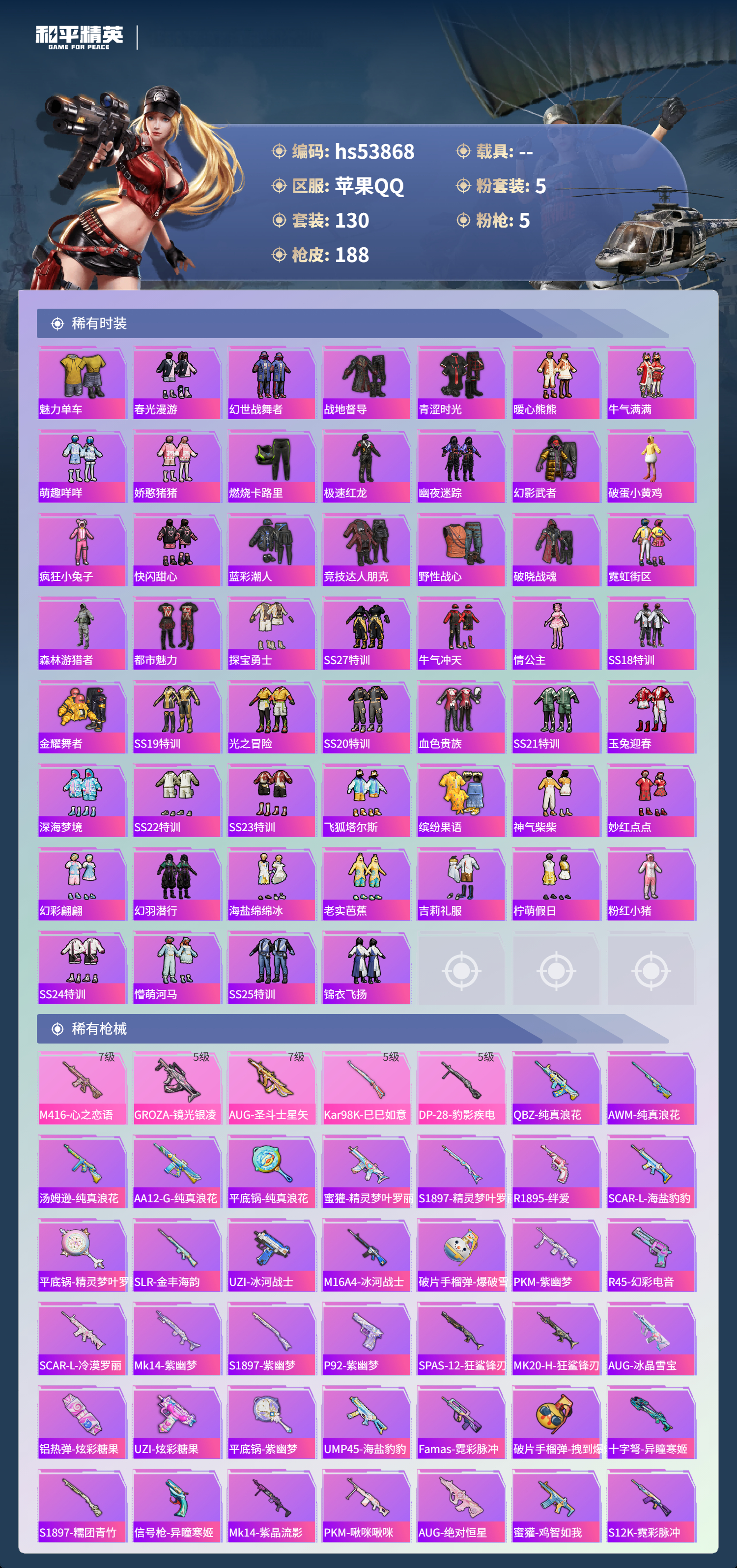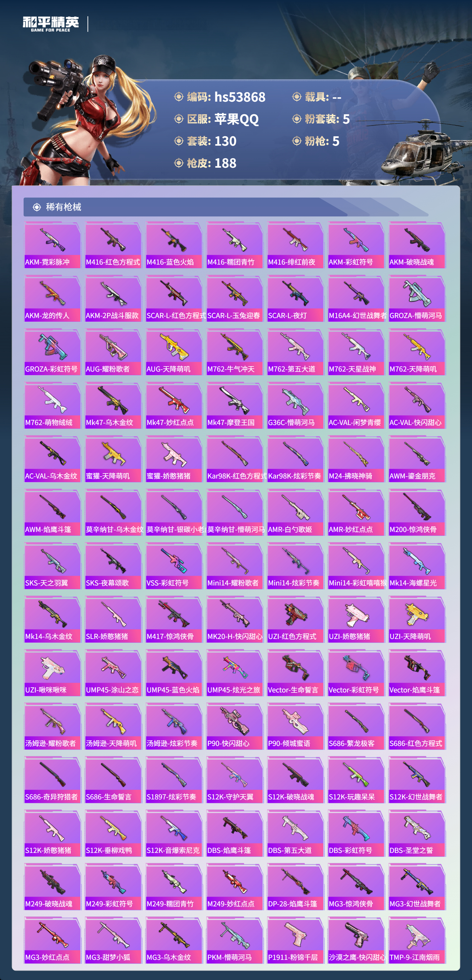 hs53868 苹果手q-11王牌印记-5粉装-5特效呛-58343热力值-130套装-188呛皮-1卓越印记【5粉装】套装-金丰海韵套装-第五大道角色-萨利娅套装-炫光之旅角色-冷漠罗丽【5特效呛】kar98k-巳巳如意/5级aug-圣斗士星矢/7级m416-心之恋语/7级dp-28-豹影疾电/5级groza-镜光银凌/5级【4稀有紫装】8号机小丑鱼龟仙人临安公主【