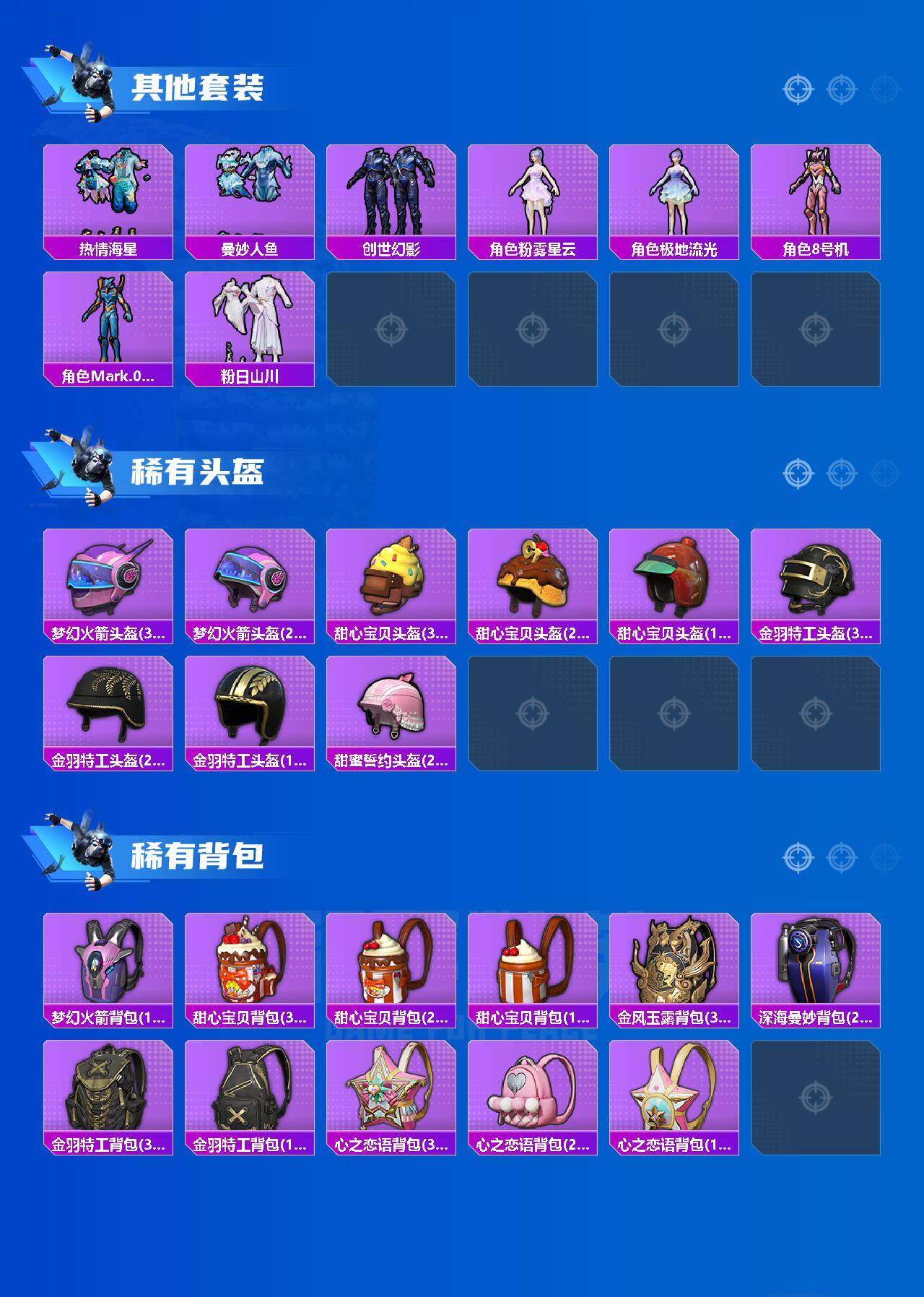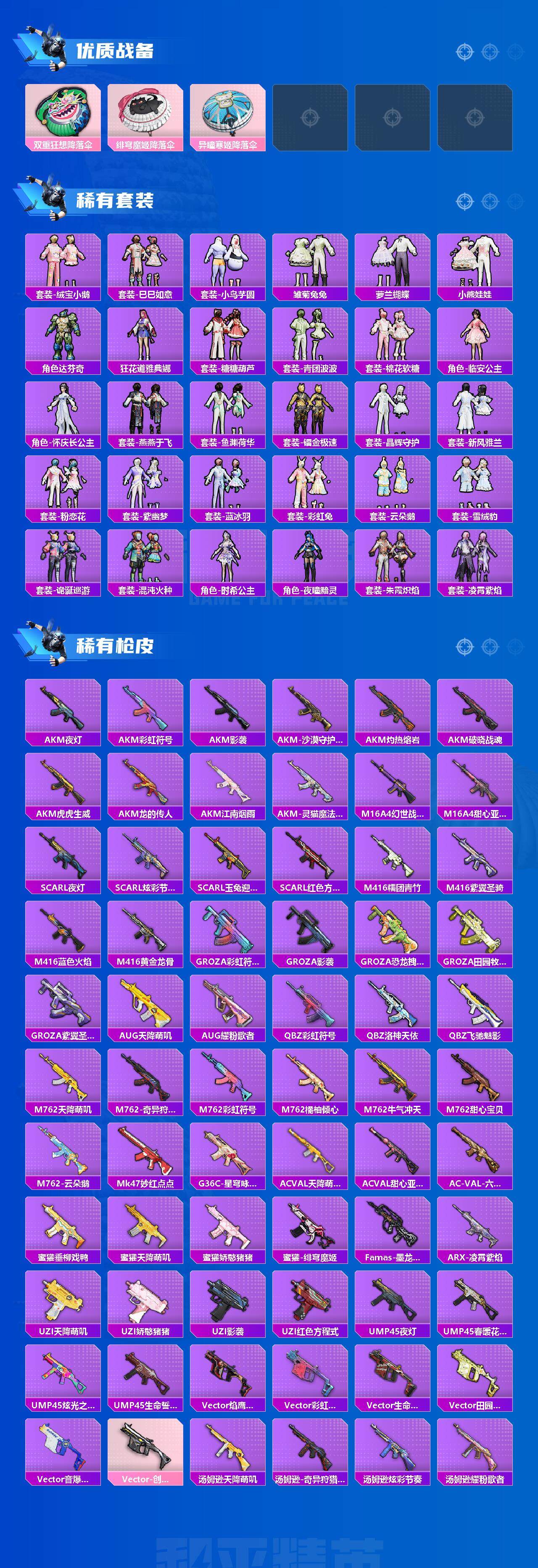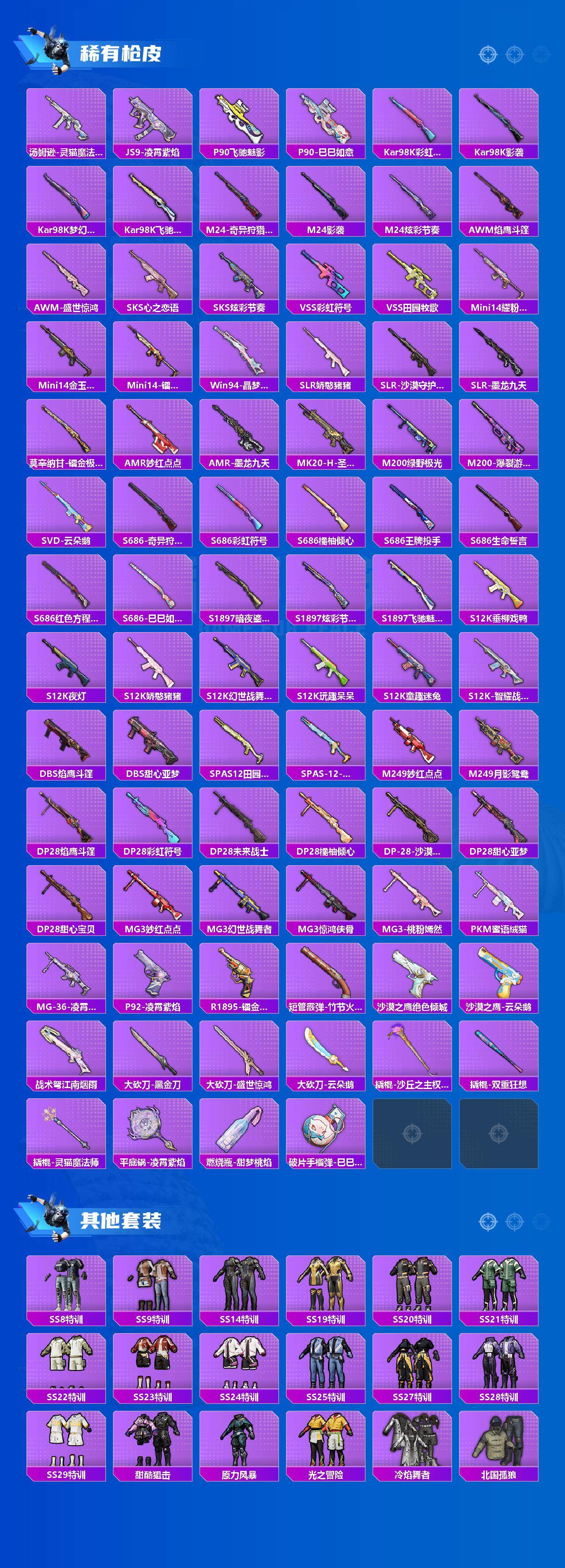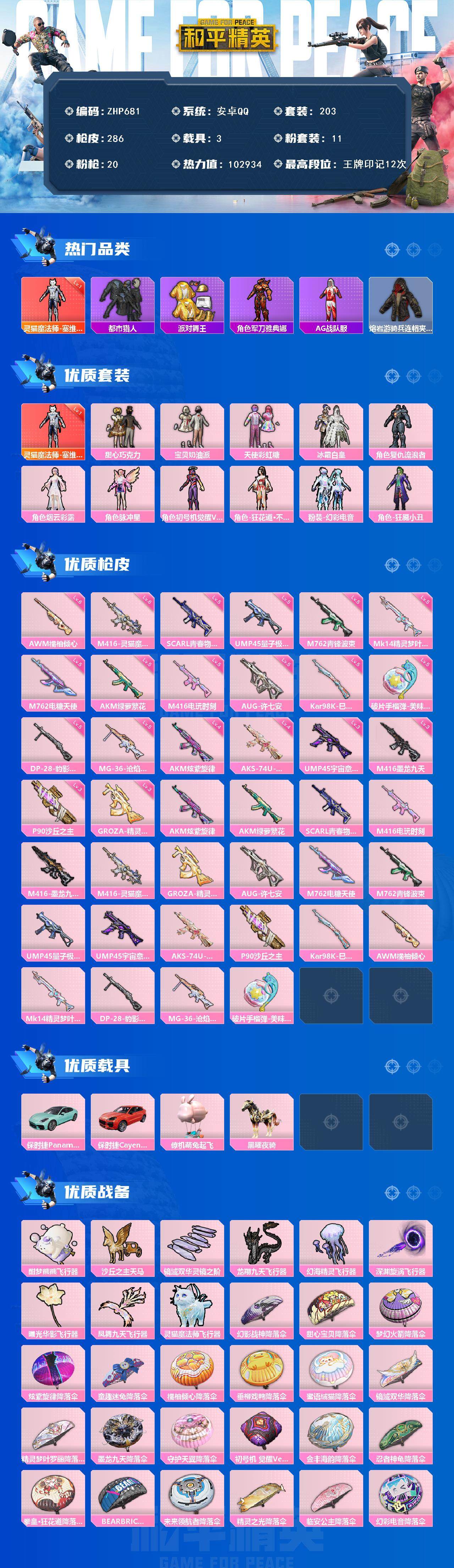可直接换绑-赤蝎都市金鞋哥特黑丝螳螂小丑三姐妹-1神装-11粉装-20特效呛-3载具-1僚机-12粉色飞行器-102934热力值-12王牌印记-203套装-286呛皮 【红色神装等级】:灵猫魔法师-塞维尔一级 【红色角色神装】:灵猫魔法师-塞维尔 【热门品类】:套装-寒蝎幽灵,套装-浪漫天命,套装-都市猎人,套装-派对舞王,套装-深海小丑鱼,角色-军刀雅典娜,套装-沙漠守护者,套装-ag战队服,套装-龟仙人,套装-潮萌小黄鸭,套装-暗影哥特,角色-8号机,角色-mark.06,熔岩游骑兵连帽夹克 【粉色套装】:粉装-甜心巧克力,粉装-宝贝奶油派,粉装-天使彩虹糖,粉装-冰霜白皇,角色-复仇流浪者,角色-烟云彩露,角色-脉冲星,角色-初号机 觉醒ver.,角色-狂花道·不知火舞,粉装-幻彩电音,角色-狂魇小丑 【粉色呛皮等级】:akm-炫紫旋律四级,akm-绿萝繁花五级,scar-l-青春物语五级,m416-电玩时刻五级,m416-墨龙九天三级,m416-灵猫魔法师六级,groza-精灵之光三级,aug-许七安五级,m762-电糖天使五级,m762-青锋波束五级,ump45-量子极限五级,ump45-宇宙意志三级,aks-74u-星穹咏叹调四级,p90-沙丘之主三级,kar98k-巳巳如意五级,awm-橘柚倾心六级,mk14-精灵梦叶罗丽五级,dp-28-豹影疾电五级,mg-36-沧焰双生五级,破片手留单-美味星星糖五级 【粉色载具】:保时捷panamera(梦幻青),保时捷cayenne(激情红),僚机-萌兔起飞,黑曜夜骑 【粉色呛皮】:akm-炫紫旋律,akm-绿萝繁花,scar-l-青春物语,m416-电玩时刻,m416-墨龙九天,m416-灵猫魔法师,groza-精灵之光,aug-许七安,m762-电糖天使,m762-青锋波束,ump45-量子极限,ump45-宇宙意志,aks-74u-星穹咏叹调,p90-沙丘之主,kar98k-巳巳如意,awm-橘柚倾心,mk14-精灵梦叶罗丽,dp-28-豹影疾电,mg-36-沧焰双生,破片手留单-美味星星糖 【粉色飞行器】:酣梦熊熊飞行器,沙丘之主天马,镜域双华-灵镜之阶,龙翔九天飞行器,幻海精灵飞行器,深渊漩涡飞行器,曦光华影飞行器,凤舞九天飞行器,灵猫魔法师飞行器 【粉色降落伞】:幻影战神降落伞,甜心宝贝降落伞,梦幻火箭降落伞,炫紫旋律降落伞,童趣迷兔降落伞,橘柚倾心降落伞,垂柳戏鸭降落伞,蜜语绒猫降落伞,镜域双华降落伞,精灵梦叶罗丽降落伞,墨龙九天降落伞,守护天翼降落伞,初号机 觉醒ver.降落伞,金丰海韵降落伞,忍者神龟降落伞,拳皇·狂花道降落伞,bearbrick降落伞,未来领航者降落伞,精灵之光降落伞,临安公主降落伞,幻彩电音降落伞,双重狂想降落伞,绯穹魔姬降落伞,异瞳寒姬降落伞 【稀有套装】:套装-龟仙人,套装-绒宝小鹅,套装-巳巳如意,套装-小鸟芋圆,套装-雏菊兔兔,套装-萝兰蝴蝶,套装-小熊娃娃,角色-达芬奇,角色-狂花道·雅典娜,套装-糖糖葫芦,套装-青团波波,套装-棉花软糖,角色-临安公主,角色-怀庆长公主,套装-燕燕于飞,套装-鱼渊荷华,套装-镭金极速,套装-晶辉守护,套装-新风雅兰,套装-粉恋花,套装-紫幽梦,套装-蓝冰羽,套装-彩虹兔,套装-云朵鹅,套装-雪绒豹,套装-诡诞巡游,套装-混沌火种,角色-时希公主,角色-夜瞳黯灵,套装-朱霞炽焰,套装-凌霄紫焰,套装-炫彩糖果 【稀有呛皮】:akm-夜灯,akm-彩虹符号,akm-影袭,akm-江南烟雨,akm-沙漠守护者,akm-灼热熔岩,akm-破晓战魂,akm-虎虎生威,akm-龙的传人,akm-灵猫魔法师,m16a4-幻世战舞者,m16a4-甜心亚梦,scar-l-夜灯,scar-l-炫彩节奏,scar-l-玉兔迎春,scar-l-红色方程式,m416-糯团青竹,m416-紫翼圣骑,m416-蓝色火焰,m416-黄金龙骨,groza-彩虹符号,groza-影袭,groza-恐龙拽拽,groza-田园牧歌,groza-紫翼圣骑,aug-天降萌叽,aug-耀粉歌者,q-彩虹符号,q-洛神天依,q-飞驰魅影,m762-天降萌叽,m762-奇异狩猎者,m762-彩虹符号,m762-橘柚倾心,m762-牛气冲天,m762-甜心宝贝,m762-云朵鹅,mk47-妙红点点,g36c-星穹咏叹调,ac-val-天降萌叽,ac-val-甜心亚梦,ac-val-六号稻草人,蜜獾-垂柳戏鸭,蜜獾-天降萌叽,蜜獾-娇憨猪猪,蜜獾-绯穹魔姬,famas-墨龙九天,arx-凌霄紫焰,uzi-天降萌叽,uzi-娇憨猪猪,uzi-影袭,uzi-红色方程式,ump45-夜灯,ump45-春暖花开,ump45-炫光之旅,ump45-生命誓言,vect-焰鹰斗篷,vect-彩虹符号,vect-生命誓言,vect-田园牧歌,vect-音爆索尼克,vect-创世·救赎,汤姆逊-天降萌叽,汤姆逊-奇异狩猎者,汤姆逊-炫彩节奏,汤姆逊-耀粉歌者,汤姆逊-灵猫魔法师,js9-凌霄紫焰,p90-飞驰魅影,p90-巳巳如意,kar98k-彩虹符号,kar98k-影袭,kar98k-梦幻火箭,kar98k-飞驰魅影,m24-影袭,m24-炫彩节奏,m24-奇异狩猎者,awm-焰鹰斗篷,awm-盛世惊鸿,sks-心之恋语,sks-炫彩节奏,vss-彩虹符号,vss-田园牧歌,mini14-耀粉歌者,mini14-金玉无双,mini14-镭金极速,win94-晶梦幻蝶,slr-娇憨猪猪,slr-沙漠守护者,slr-墨龙九天,莫辛纳甘-镭金极速,amr-妙红点点,amr-墨龙九天,mk20-h-圣域龙灵,m200-绿野极光,m200-爆裂游戏,svd-云朵鹅,s686-奇异狩猎者,s686-彩虹符号,s686-橘柚倾心,s686-王牌投手,s686-生命誓言,s686-红色方程式,s686-巳巳如意,s1897-暗夜鎏金,s1897-炫彩节奏,s1897-飞驰魅影,s12k-玩趣呆呆,s12k-童趣迷兔,s12k-垂柳戏鸭,s12k-夜灯,s12k-娇憨猪猪,s12k-幻世战舞者,s12k-智耀战神,dbs-焰鹰斗篷,dbs-甜心亚梦,spas-12-田园牧歌,spas-12-云朵鹅,m249-妙红点点,m249-月影鸳鸯,dp-28-焰鹰斗篷,dp-28-彩虹符号,dp-28-未来战士,dp-28-橘柚倾心,dp-28-沙漠守护者,dp-28-甜心亚梦,dp-28-甜心宝贝,mg3-妙红点点,mg3-幻世战舞者,mg3-惊鸿侠骨,mg3-桃粉嫣然,pkm-蜜语绒猫,mg-36-凌霄紫焰,p92-凌霄紫焰,r1895-镭金极速,短管霰弹-竹节火铳,沙墨之鹦-绝色倾城,沙墨之鹦-云朵鹅,战术弩-江南烟雨,大砍刀-云朵鹅,大砍刀-黑金刀,大砍刀-盛世