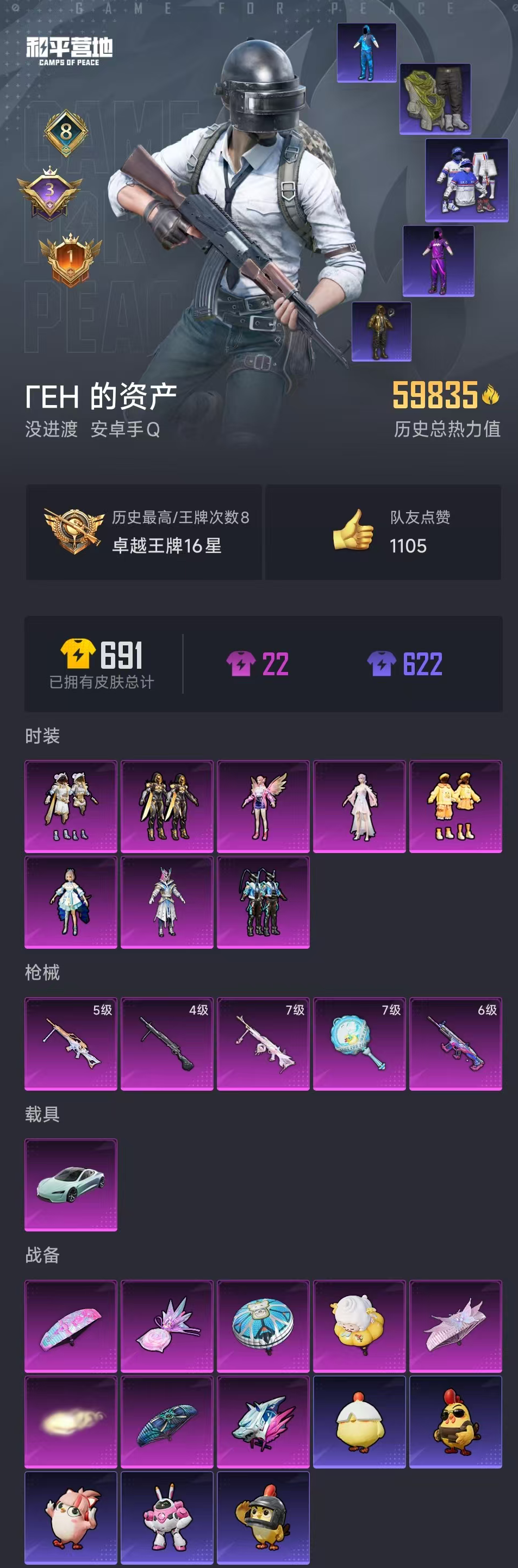 5.9w热力值1传奇印记 8粉装5特效呛1载具 创世救赎 洛天依 狂沙舞者 浪漫天命 战队服 满级平底锅 6级死噶 特斯拉