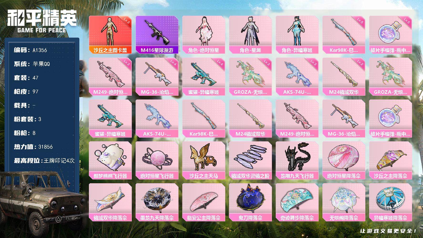 [14772509]苹果【男神号 沙丘之主-图卡盟三级/m416-星际漫游/m24-镜域双华二级、aks-74u-无垠阁三级】 手q-1神装-3粉装-8特效呛-0载具-7粉色飞行器-31856热力值-4王牌印记-47套装-97呛皮 【红色神装等级】:沙丘之主-图卡盟三级 【红色角色神装】:沙丘之主-图卡盟 【热门品类】:m416-星际漫游 【粉色套装】:角色-绝对恒星,角色-星渊,角色-异瞳寒姬 【粉色呛皮等级】:groza-无垠阁三级,蜜獾-异瞳寒姬四级,aks-74u-无垠阁三级,kar98k-巳巳如意五级,m24-镜域双华二级,m249-绝对恒星三级,mg-36-沧焰双生四级,破片手留单-瓶中星球五级 【粉色呛皮】:groza-无垠阁,蜜獾-异瞳寒姬,aks-74u-无垠阁,kar98k-巳巳如意,m24-镜域双华,m249-绝对恒星,mg-36-沧焰双生,破片手留单-瓶中星球 【粉色飞行器】:酣梦熊熊飞行器,绝对恒星飞行器,沙丘之主天马,镜域双华-灵镜之阶,龙翔九天飞行器 【粉色降落伞】:绝对恒星降落伞,沙丘之主降落伞,镜域双华降落伞,墨龙九天降落伞,临安公主降落伞,鬼刀降落伞,奇迹舞步降落伞,无垠阁降落伞,异瞳寒姬降落伞,极意拳锋降落伞 【稀有套装】:套装-巳巳如意,角色-超感刻度,角色-甜心蒙太奇,角色-怀庆长公主,套装-燕燕于飞,套装-鱼渊荷华,套装-镭金极速,套装-樱梦幻音,套装-粉恋花,套装-紫幽梦,套装-蓝冰羽,角色-绯色魅影,角色-紫俏灵猫,套装-炫彩糖果,角色-银色战姬 【稀有呛皮】:mk12-镜光械姬,aug-冰晶雪宝,ump45-旱漠游骑,akm-冰凉西瓜,m16a4-星际漫游,m16a4-雨林猎影,scar-l-夜灯,scar-l-炫彩节奏,scar-l-玉兔迎春,scar-l-黄金龙骨,m416-星际漫游,aug-耀粉歌者,aug-绝对恒星,m762-天降萌叽,g36c-镜域双华,g36c-星际漫游,g36c-星穹咏叹调,ac-val-天降萌叽,famas-镜域双华,uzi-幻影飞狐,ump45-夜灯,ump45-星际漫游,vect-生命誓言,汤姆逊-天降萌叽,p90-巳巳如意,kar98k-星穹咏叹调,awm-黄金龙骨,mini14-星际漫游,slr-墨龙九天,m200-无垠阁,s686-生命誓言,