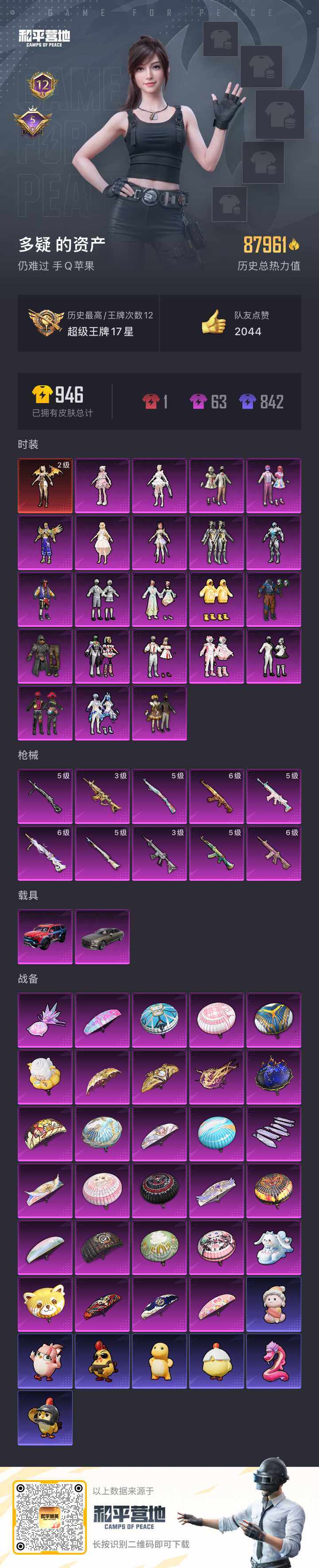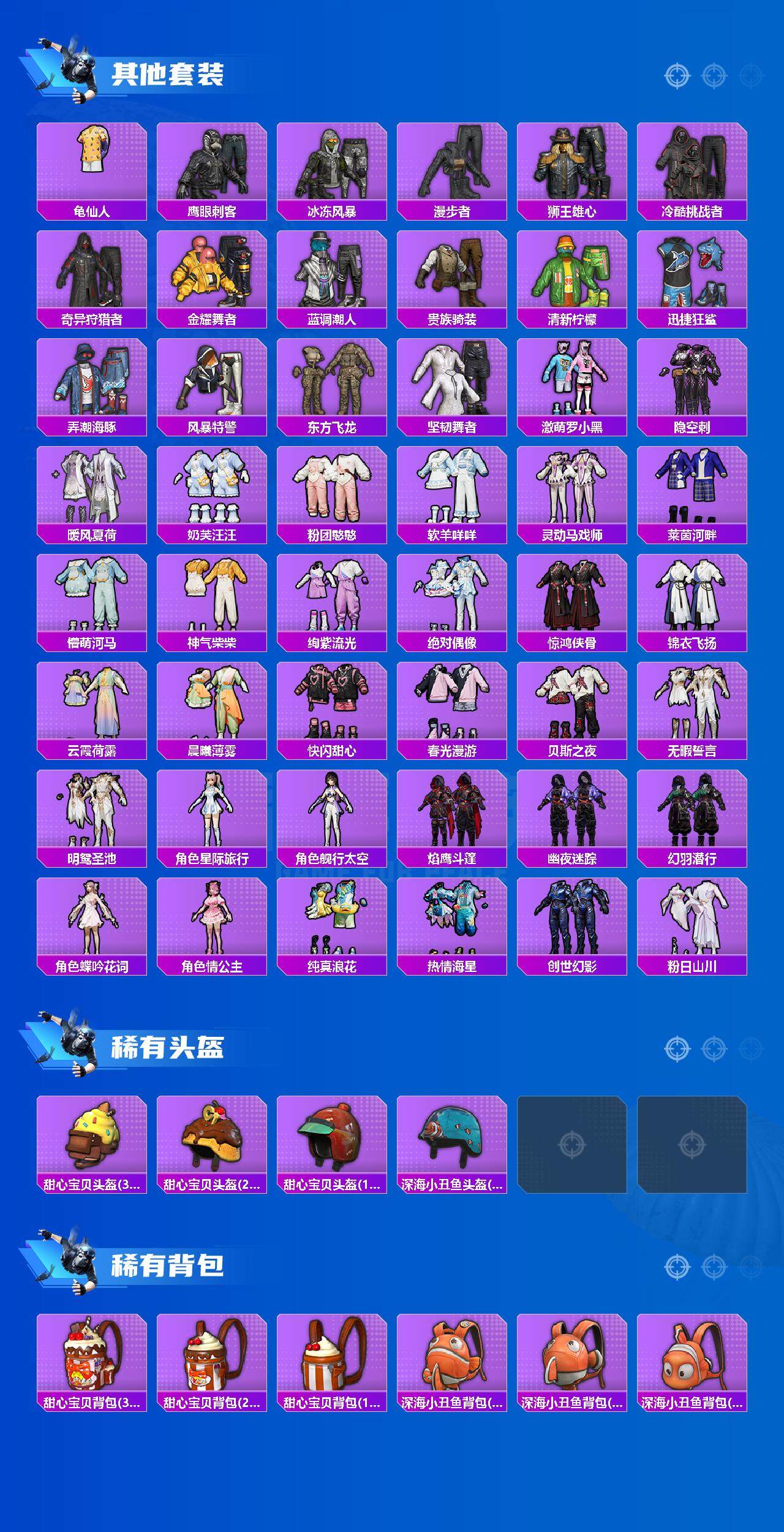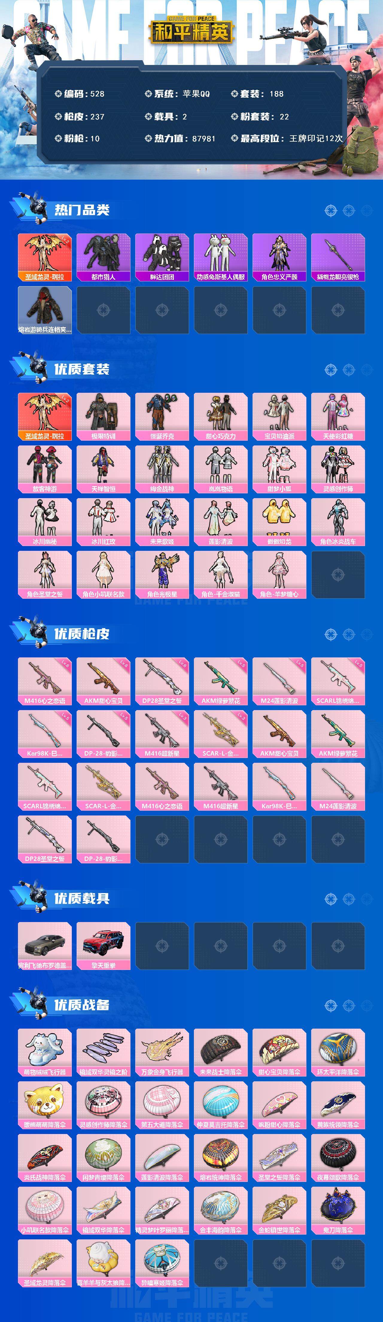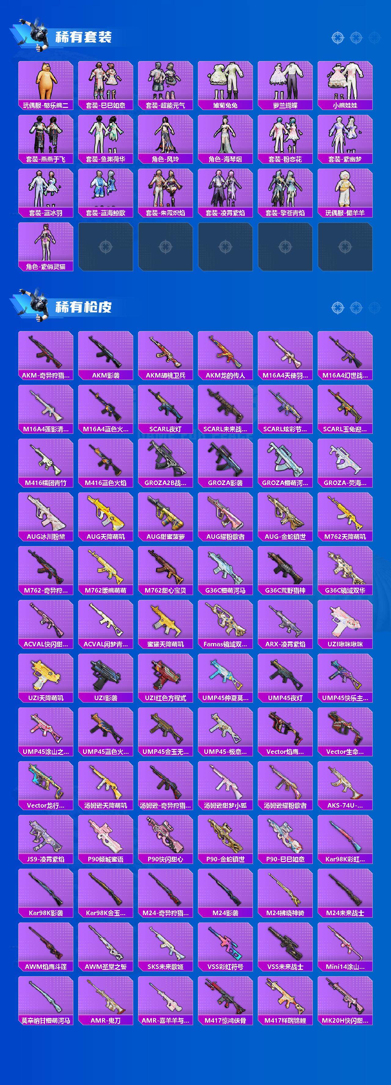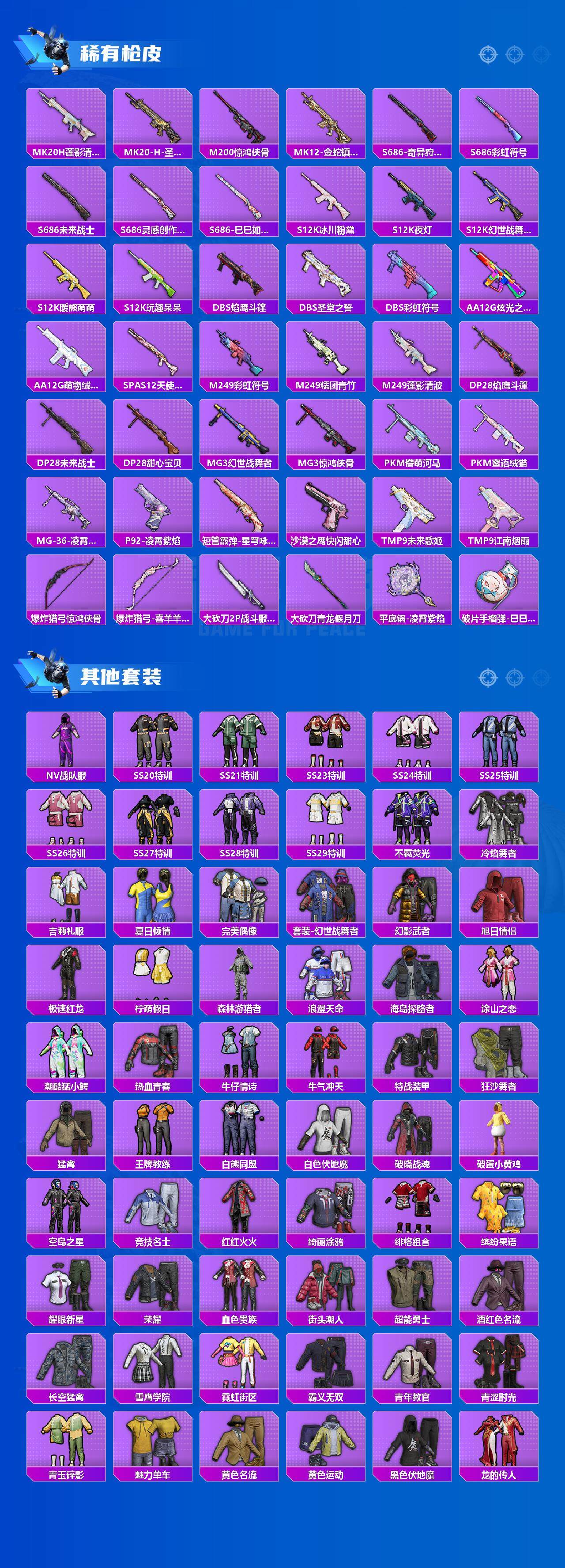 _2318977-手q-1神装-满天赋22粉装-10特效呛-2载具-4粉色飞行器-87981热力值-12王牌印记-188套装-237呛皮 【红色神装等级】:圣域龙灵-瑞拉二级 【红色角色神装】:圣域龙灵-瑞拉 【热门品类】:粉装-怪诞乔克,套装-浪漫天命,套装-都市猎人,套装-奇异狩猎者,套装-胖达团团,套装-动感兔斯基人偶服,角色-忠义严颜,套装-龟仙人,套装-红红火火,大砍刀-青龙偃月刀,撬棍-龙胆亮银呛,熔岩游骑兵连帽夹克 【粉色套装】:粉装-极限特训,粉装-怪诞乔克,粉装-甜心巧克力,粉装-宝贝奶油派,粉装-天使彩虹糖,粉装-放客神游,粉装-天禅智恒,粉装-绚金战神,粉装-岚岚物语,粉装-甜梦小狐,粉装-灵感创作师,粉装-冰川幽秘,粉装-冰川红玫,粉装-未来歌姬,粉装-莲影清波,粉装-傲傲奶龙,角色-冰炎战车,角色-圣堂之誓,角色-小叽联名款,角色-光极星,角色-千金淑猫,角色-羊梦糖心 【粉色呛皮等级】:akm-甜心宝贝六级,akm-绿萝繁花五级,scar-l-锦绣绵绵五级,scar-l-金蛇镇世三级,m416-心之恋语六级,m416-超新星三级,kar98k-巳巳如意五级,m24-莲影清波五级,dp-28-圣堂之誓六级,dp-28-豹影疾电五级 【粉色载具】:宾利飞驰(布罗德盖棕双色),擎天重拳 【粉色呛皮】:akm-甜心宝贝,akm-绿萝繁花,scar-l-锦绣绵绵,scar-l-金蛇镇世,m416-心之恋语,m416-超新星,kar98k-巳巳如意,m24-莲影清波,dp-28-圣堂之誓,dp-28-豹影疾电 【粉色飞行器】:萌物绒绒飞行器,镜域双华-灵镜之阶,万象金身飞行器 【粉色降落伞】:未来战士降落伞,甜心宝贝降落伞,环太平洋降落伞,暖熊萌萌降落伞,灵感创作师降落伞,第五大道降落伞,仲夏莫吉托降落伞,飒粉甜心降落伞,黄族统领降落伞,炎氏战神降落伞,闲梦青缨降落伞,莲影清波降落伞,熔岩统帅降落伞,圣堂之誓降落伞,夜幕颂歌降落伞,小叽联名款降落伞,镜域双华降落伞,精灵梦叶罗丽降落伞,金丰海韵降落伞,金蛇镇世降落伞,鬼刀降落伞,圣域龙灵降落伞,喜羊羊与灰太狼降落伞,异瞳寒姬降落伞 【稀有套装】:套装-龟仙人,玩偶服-憨乐熊二,套装-巳巳如意,套装-超能元气,套装-雪国风尚,套装-雏菊兔兔,套装-萝兰蝴蝶,套装-小熊