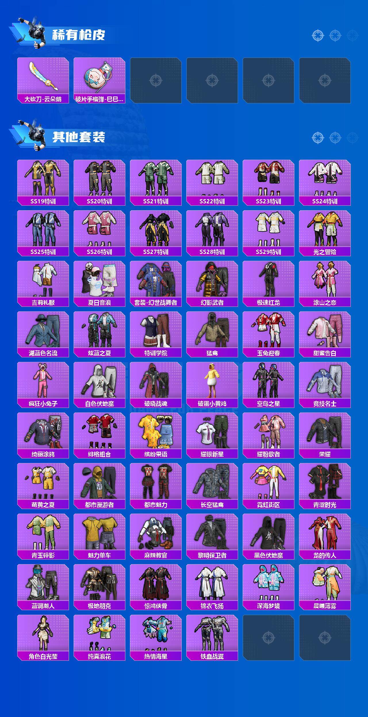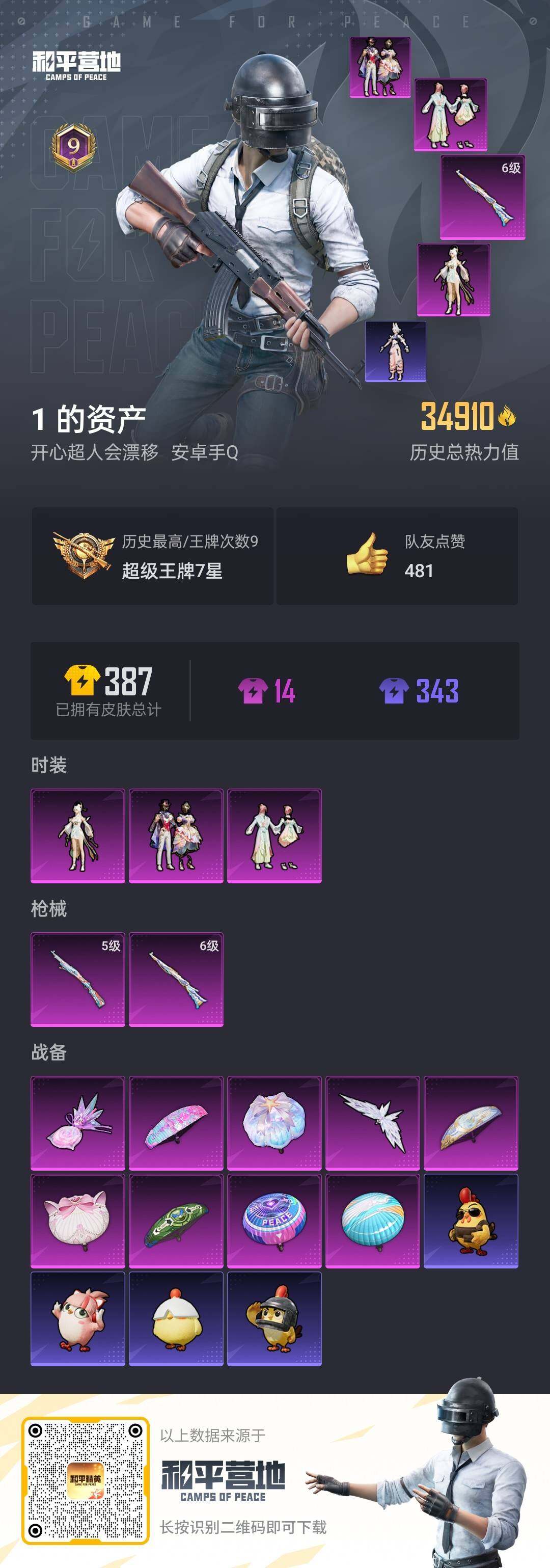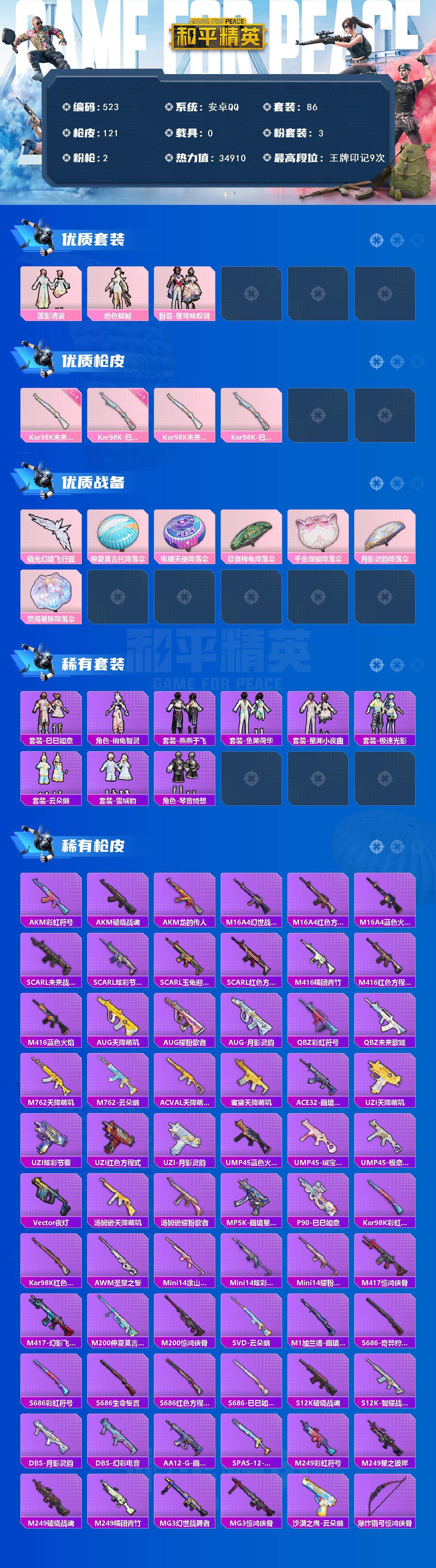 _2318983-手q-3粉装-2特效呛-2粉色飞行器-34910热力值-9王牌印记-86套装-121呛皮 【粉色套装】:粉装-莲影清波,角色-绝色倾城,粉装-星穹咏叹调 【粉色呛皮等级】:kar98k-未来歌姬六级,kar98k-巳巳如意五级 【粉色呛皮】:kar98k-未来歌姬,kar98k-巳巳如意 【粉色飞行器】:镜光幻境飞行翼 【粉色降落伞】:仲夏莫吉托降落伞,电糖天使降落伞,忍者神龟降落伞,千金淑猫降落伞,月影灵韵降落伞,荧海星豚降落伞 【稀有套装】:套装-巳巳如意,角色-俏兔智灵,套装-燕燕于飞,套装-鱼渊荷华,套装-星渊小夜曲,套装-极速光影,套装-云朵鹅,套装-雪绒豹,套装-琴音绮想,套装-炫彩糖果 【稀有呛皮】:akm-彩虹符号,akm-破晓战魂,akm-龙的传人,m16a4-幻世战舞者,m16a4-红色方程式,m16a4-蓝色火焰,scar-l-未来战士,scar-l-炫彩节奏,scar-l-玉兔迎春,scar-l-红色方程式,m416-糯团青竹,m416-红色方程式,m416-蓝色火焰,aug-天降萌叽,aug-耀粉歌者,aug-月影灵韵,q-彩虹符号,q-未来歌姬,m762-天降萌叽,m762-云朵鹅,ac-val-天降萌叽,蜜獾-天降萌叽,ace32-画境星梦,uzi-天降萌叽,uzi-炫彩节奏,uzi-红色方程式,uzi-月影灵韵,ump45-蓝色火焰,ump45-绒宝小鹅,ump45-极意拳锋,vect-夜灯,汤姆逊-天降萌叽,汤姆逊-耀粉歌者,mp5k-画境星梦,p90-巳巳如意,kar98k-彩虹符号,kar98k-红色方程式,awm-圣堂之誓,mini14-涂山之恋,mini14-炫彩节奏,mini14-耀粉歌者,m417-惊鸿侠骨,m417-幻影飞狐,m200-仲夏莫吉托,m200-惊鸿侠骨,svd-云朵鹅,m1加兰德-画境星梦,s686-奇异狩猎者,s686-彩虹符号,s686-生命誓言,s686-红色方程式,s686-巳巳如意,s12k-破晓战魂,s12k-智耀战神,dbs-幻彩电音,dbs-月影灵韵,aa12-g-画境星梦,spas-12-云朵鹅,m249-彩虹符号,m249-星之彼岸,m249-破晓战魂,m249-糯团青竹,mg3-幻世战舞者,mg3-惊鸿侠骨,沙墨之鹦-云朵鹅,爆炸猎弓-惊鸿侠骨,大砍刀-云