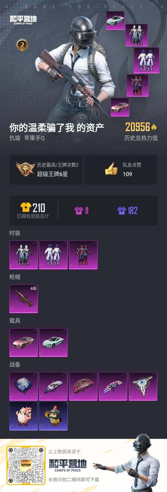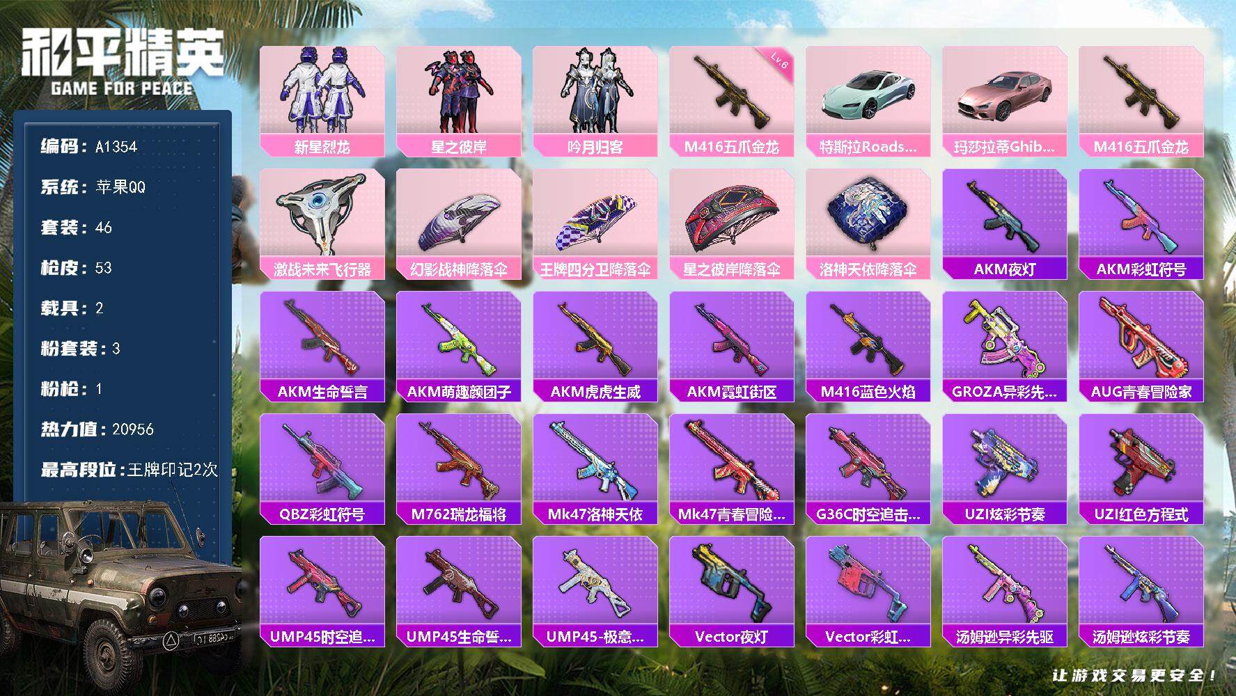 [14776871]苹果 【男神号 新星烈龙/星之彼岸/吟月归客/m416-五爪金龙六级/特斯拉roadster(水滴蓝),玛莎拉蒂ghibli(粉)】手q-3粉装-1特效呛-2载具-1粉色飞行器-20956热力值-2王牌印记-46套装-53呛皮 【粉色套装】:粉装-新星烈龙,粉装-星之彼岸,粉装-吟月归客 【粉色呛皮等级】:m416-五爪金龙六级 【粉色载具】:特斯拉roadster(水滴蓝),玛莎拉蒂ghibli(粉) 【粉色呛皮】:m416-五爪金龙 【粉色飞行器】:激战未来飞行器 【粉色降落伞】:幻影战神降落伞,王牌四分卫降落伞,星之彼岸降落伞,洛神天依降落伞 【稀有呛皮】:akm-夜灯,akm-彩虹符号,akm-生命誓言,akm-萌趣颜团子,akm-虎虎生威,akm-霓虹街区,m416-蓝色火焰,groza-异彩先驱,aug-青春冒险家,q-彩虹符号,m762-瑞龙福将,mk47-洛神天依,mk47-青春冒险家,g36c-时空追击者,uzi-炫彩节奏,uzi-红色方程式,ump45-时空追击者,ump45-生命誓言,ump45-极意拳锋,vect-夜灯,vect-彩虹符号,汤姆逊-异彩先驱,汤姆逊-炫彩节奏,汤姆逊-耀粉歌者,野牛-青春冒险家,mp5k-异彩先驱,kar98k-彩虹符号,kar98k-红色方程式,awm-王牌四分卫,sks-时空追击者,sks-炫彩节奏,sks-迅猛狂鲨,vss-星之彼岸,mini14-异彩先驱,mini14-耀粉歌者,win94-瑞龙福将,qbu-青春冒险家,s12k-瑞龙福将,dbs-时空追击者,m249-百万伏特,mg3-瑞龙福将 【其他套装】:套装-ss14特训,套装-ss15特训,套装-ss16特训,套装-ss17特训,套装-ss18特训,套装-ss19特训,套装-ss20特训,套装-人鱼之吻,套装-吉莉礼服,套装-怒火燎原,套装-暗黑骑手,套装-海上生明月,套装-滨海假日,套装-灼焰舞者,套装-特种颜团子,套装-甜蜜熊情侣,套装-福星高照,套装-空投萌叽,套装-竞技名士,套装-绮丽涂鸦,套装-萌趣颜团子,套装-萌黄之夏,套装-虎虎生威吉莉,套装-长空猛禽,套装-骑行爱好者,套装-沙漠毒蛇,套装-漫步者,套装-摇滚舞王,套装-青春冒险家,套装-潮流游乐家,套装-梦起落英,套装-星河入梦,套装-快乐星愿,套装-暴风